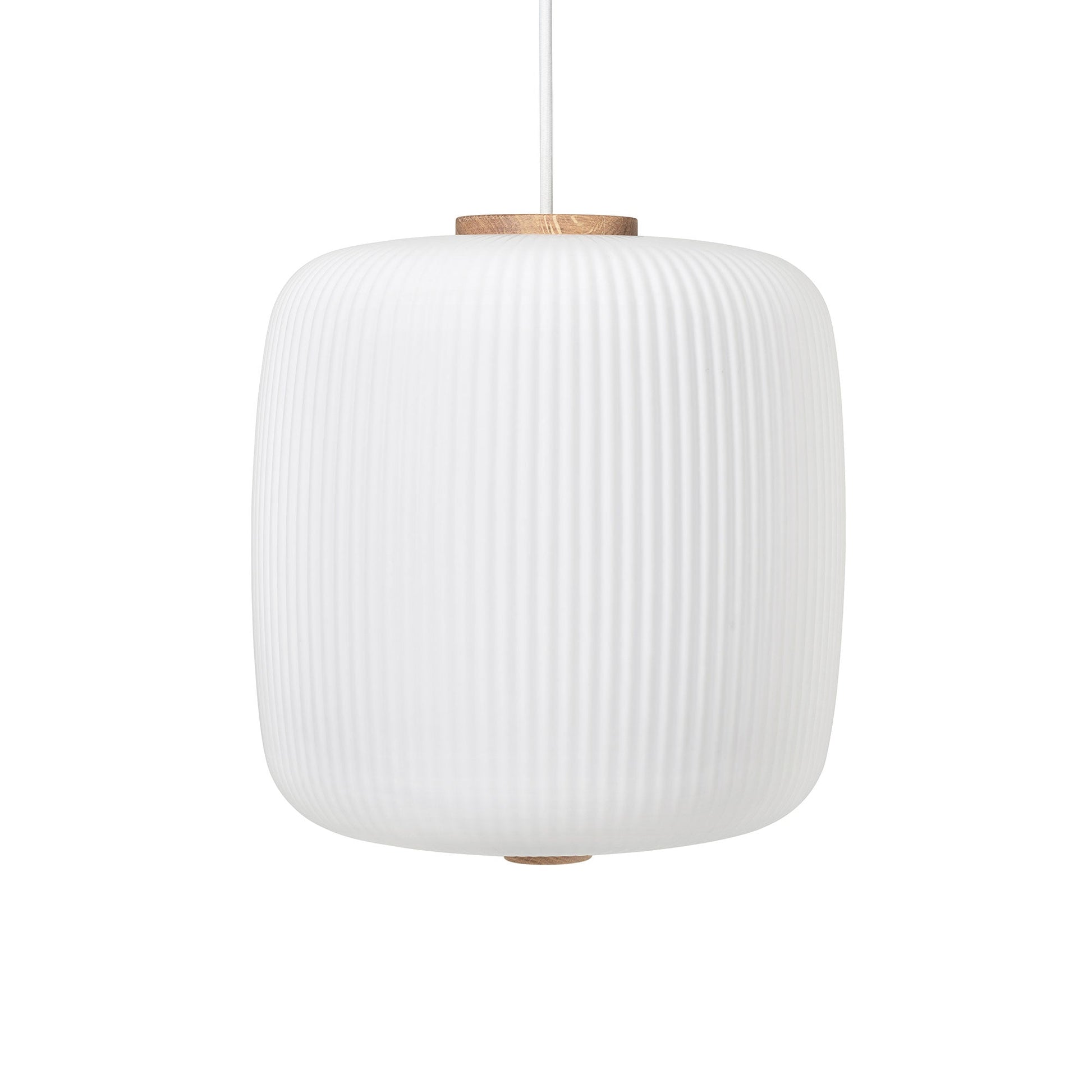 It features mouth-blown opal glass and certified oak detailing, turned and honed by hand.