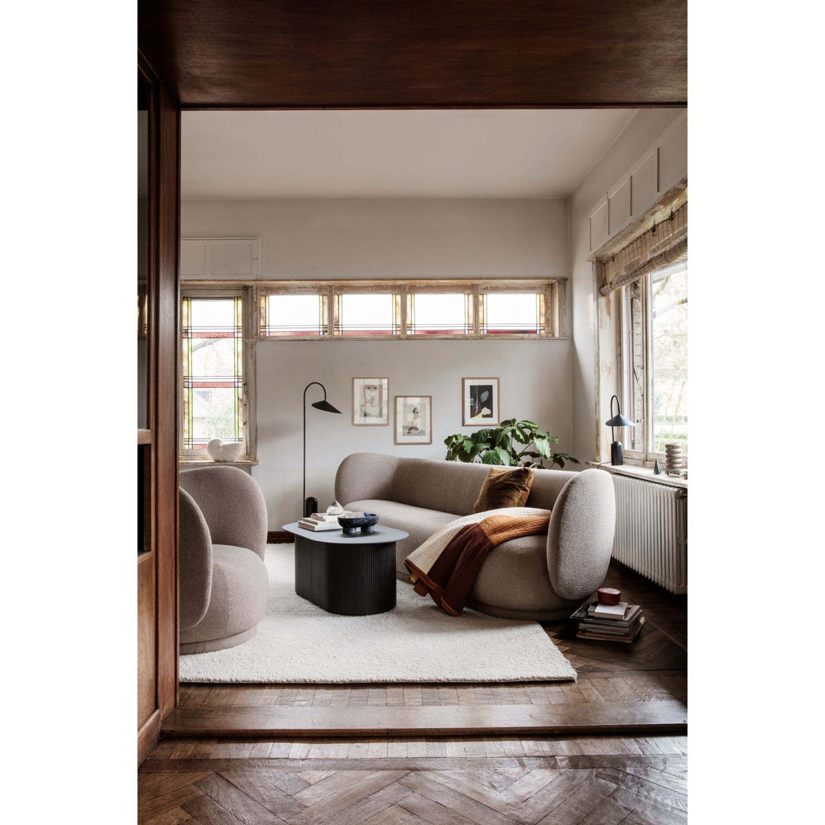 Contrasting the sturdiness of the three-seater’s frame, the sofa has an upholstery of timeless, yet easeful bouclé fabric, which is woven of uneven yarn to attain the rich, loopy texture of the surface.
