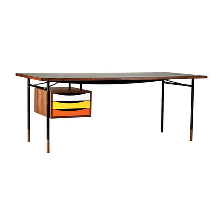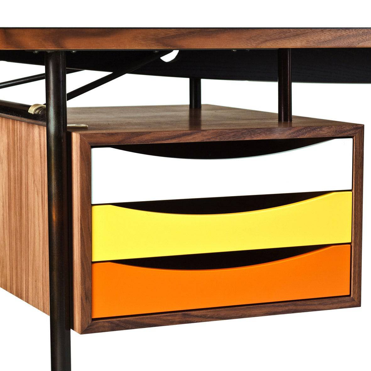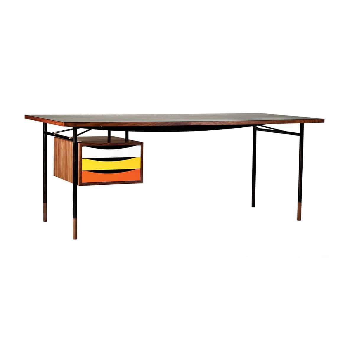 The Drawer Cabinet with three coloured trays hangs like a floating, individual element under the light steel construction of the Nyhavn Table.