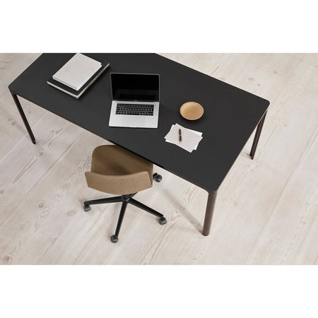 The tabletop is available in linoleum or laminate and is lacquered with a matte gloss 30 lacquer. This goes to strengthen the relaxed feel of the table even more and gives a pleasant contact surface, making it less vulnerable to scratches.