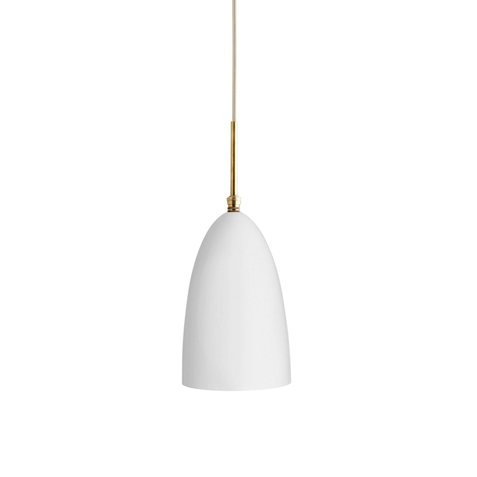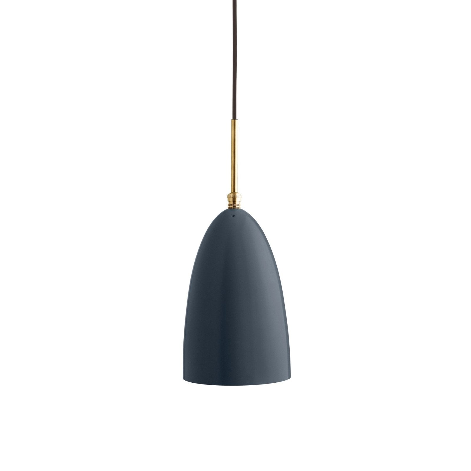The Gräshoppa shade is fixed with a brass tube and brass fittings on the top. For mounting on the ceiling, the pendant is equipped with a steel bracket covered by a half round sphere canopy in brass and a brass tube. The powder-coated shade is available in 4 colours: matt white, anthracite grey, jet black and blue-grey.