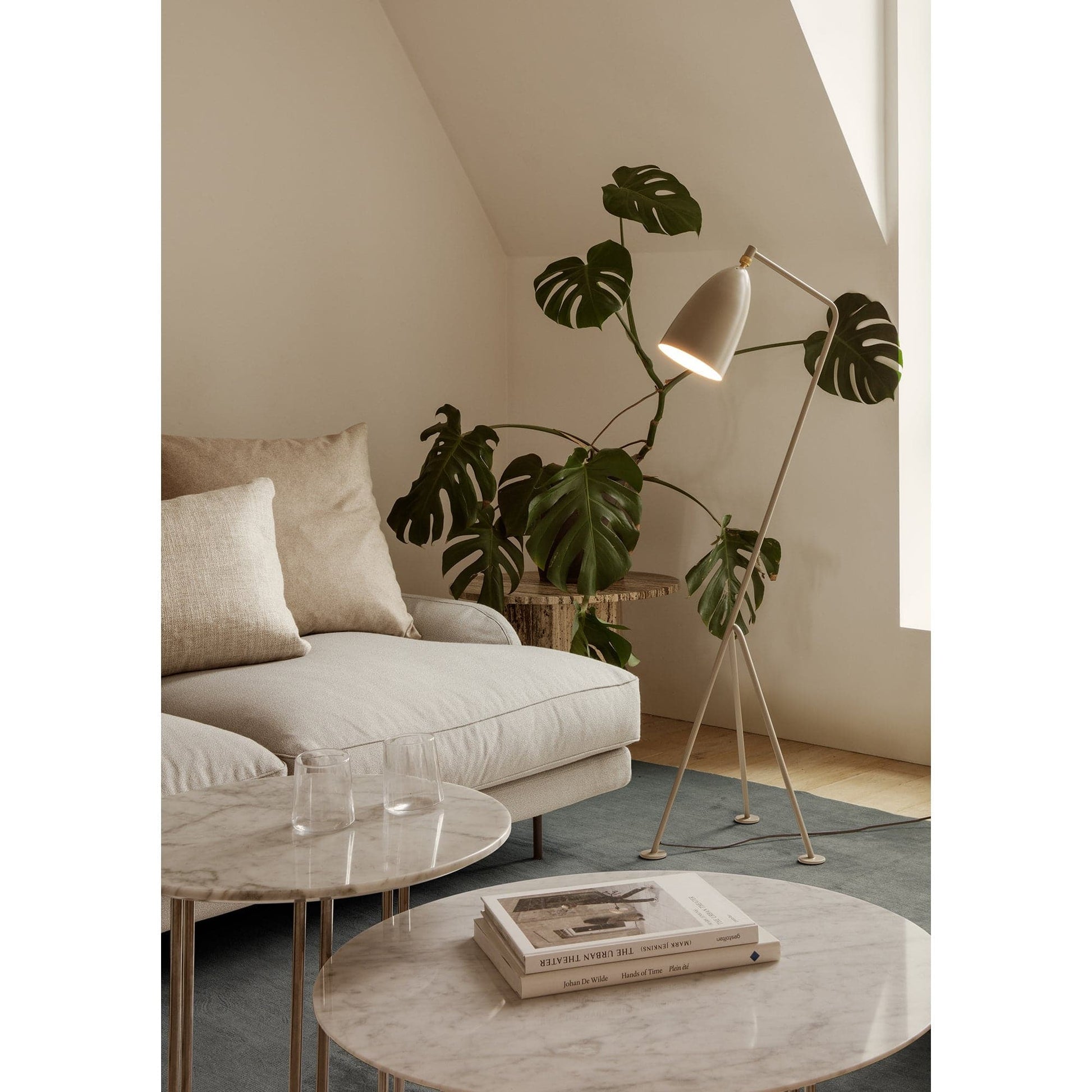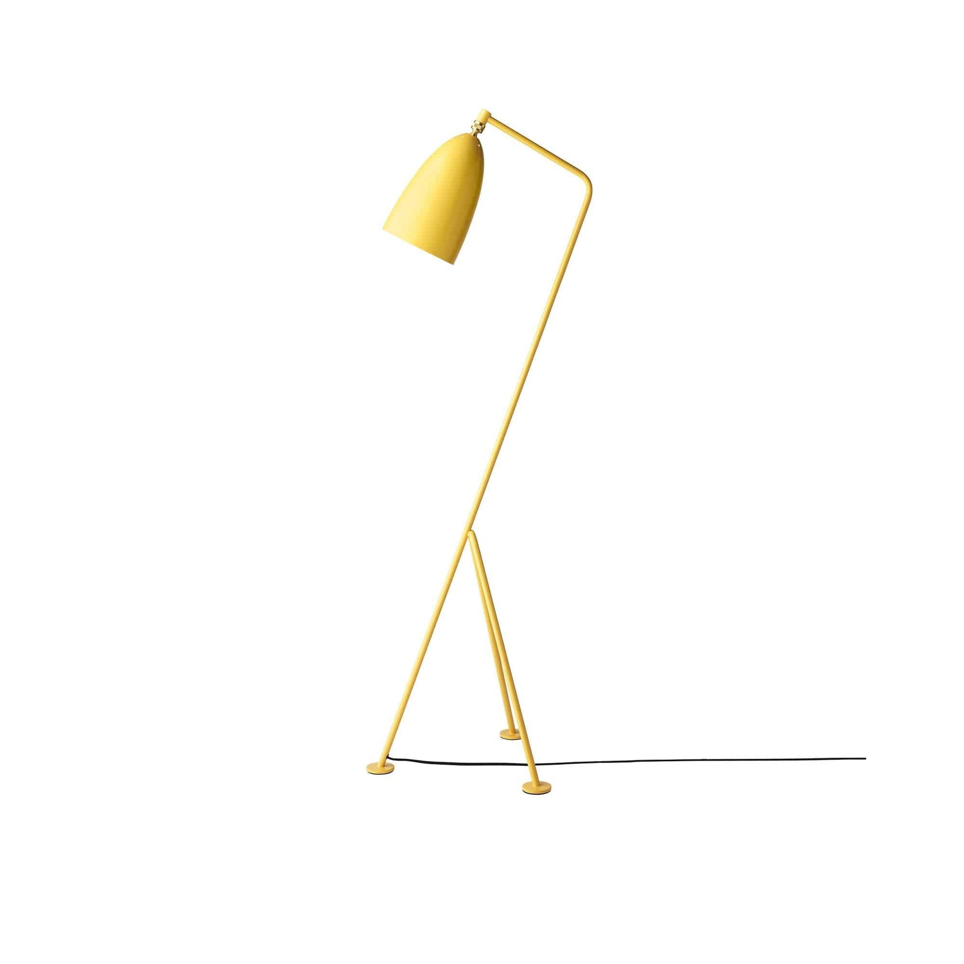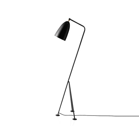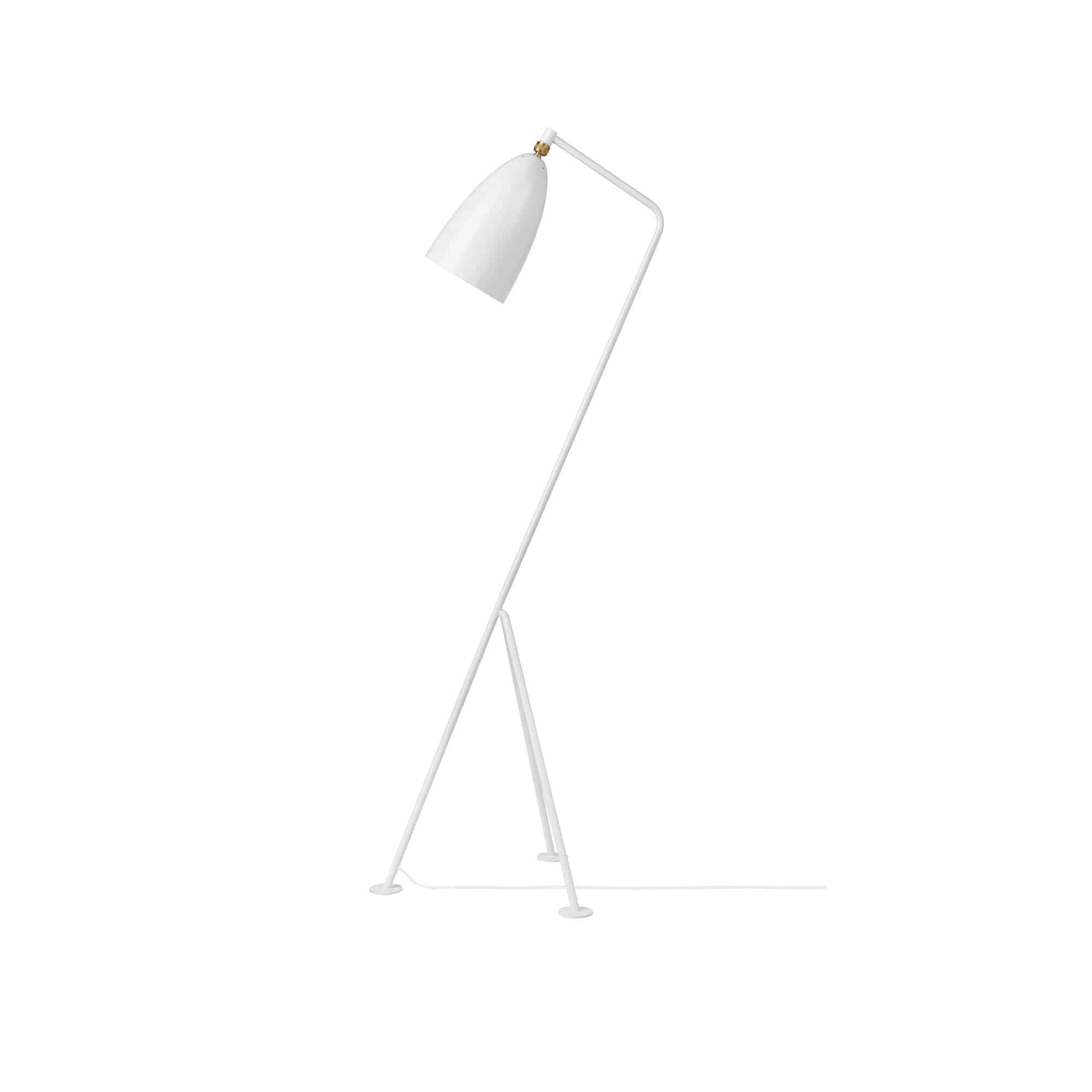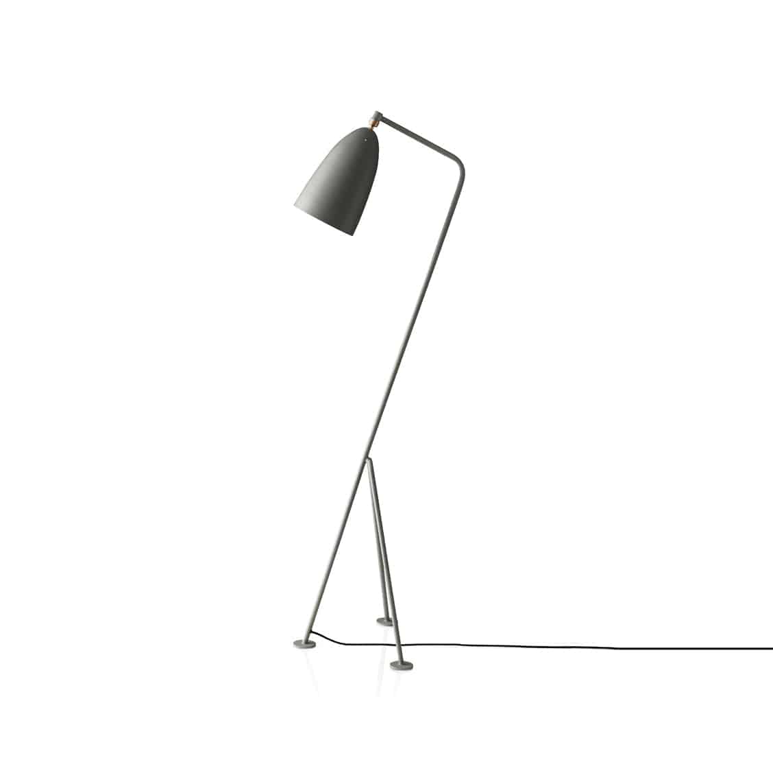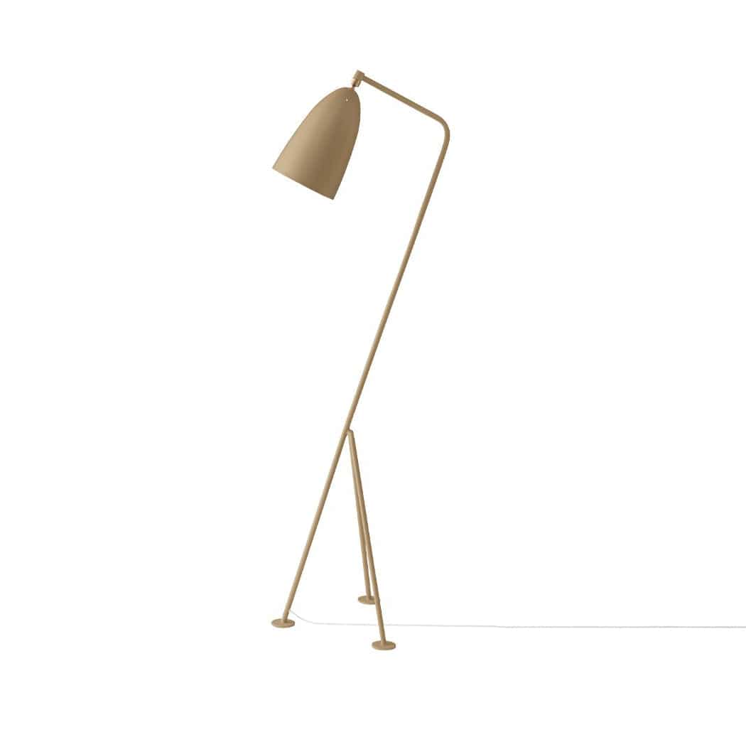 The iconic Gräshoppa lamp from Gubi was first produced in 1947. The tubular steel tripod stand is tilted backward and the elongated aluminium conical shade is ball-jointed onto the arm; so the light can be directional, yet the glare is minimal.