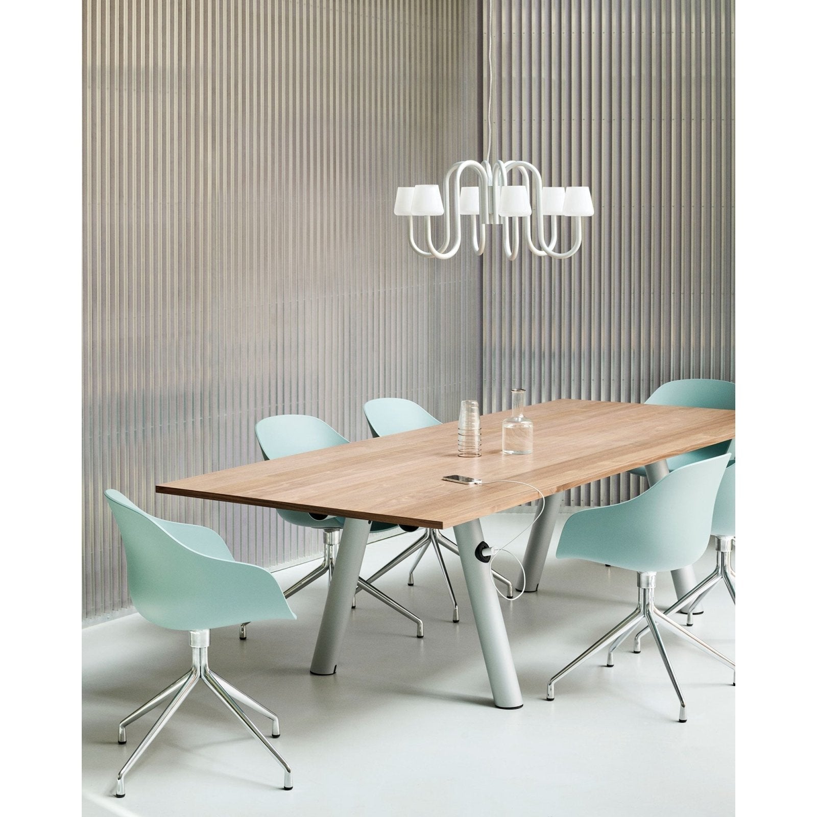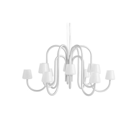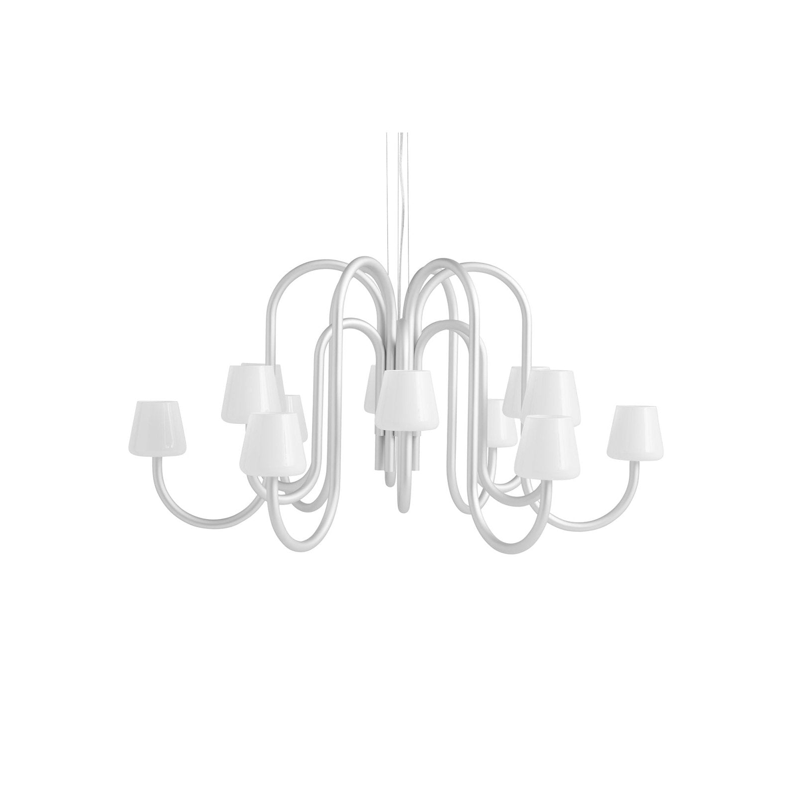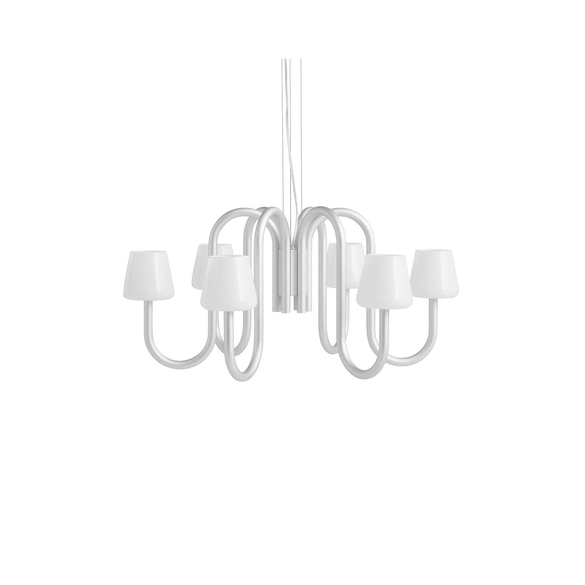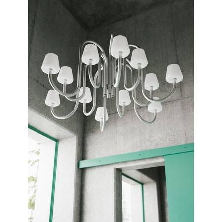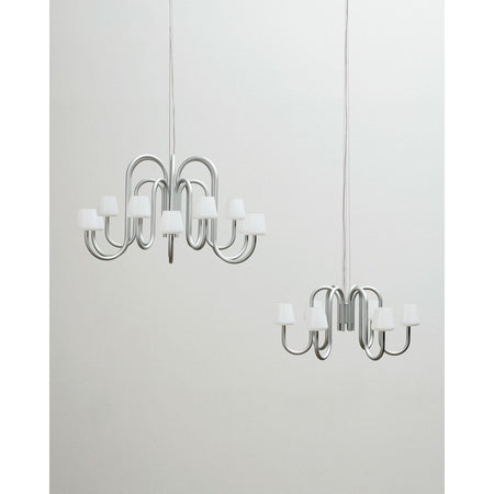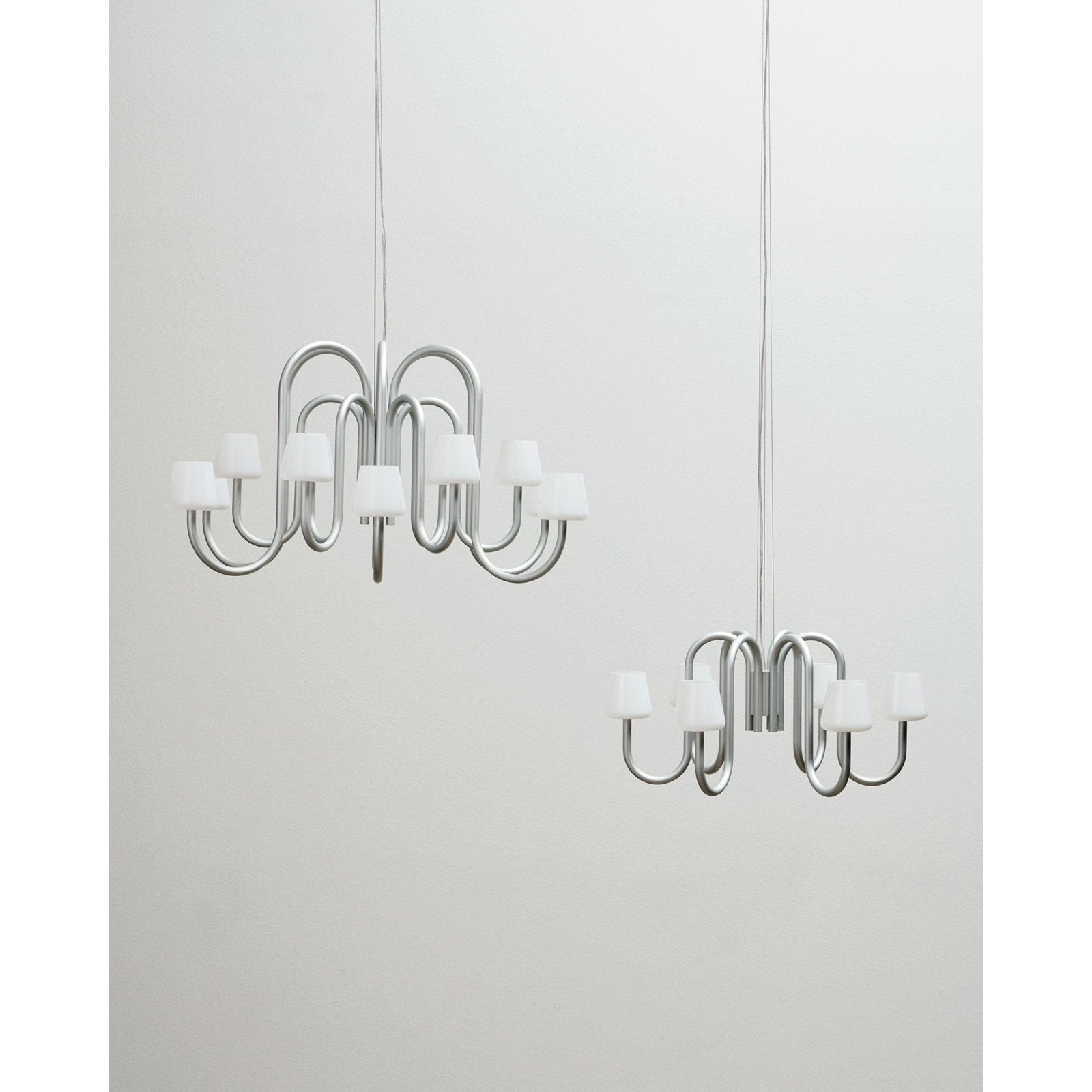 Designed by STUDIO 0405, the Apollo Chandelier is a contemporary take on a classic lamp archetype, sharing basic structural characteristics of the traditional chandelier updated in a sculptural and functional design. Comprising multiple mouth-blown opal glass shades atop curved tubular arms, creating a contrasting expression between the handcrafted, organically shaped shades and the industrial anodised aluminium tubing. The Apollo Chandelier makes an ideal room centrepiece suitable for using in a variety of private and public places. Available in two different sizes, with 6 or 12 arms.