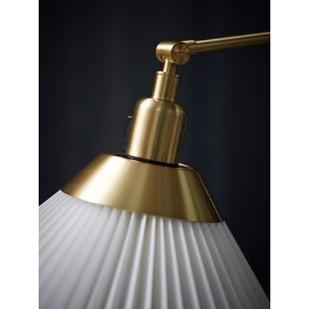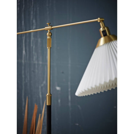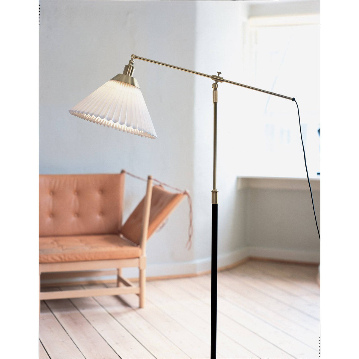 Aage Petersen designed this beautiful and practical lamp in brass and black in 1946. The stand can be extended at the top so that the total height is adjustable from 113 to 158 cm. The length and height of the transverse piece are adjustable and the lampshade can be tilted at the top, making this lamp ideal for use as a reading lamp.