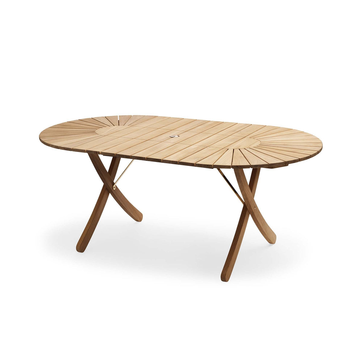 The Selandia table with curved crossover legs supports the stadium-formed and slatted table-top which is easily extendable with either one or two extension leaves. Elegant, solid, spacious – simply good craftsmanship by Skagerak.