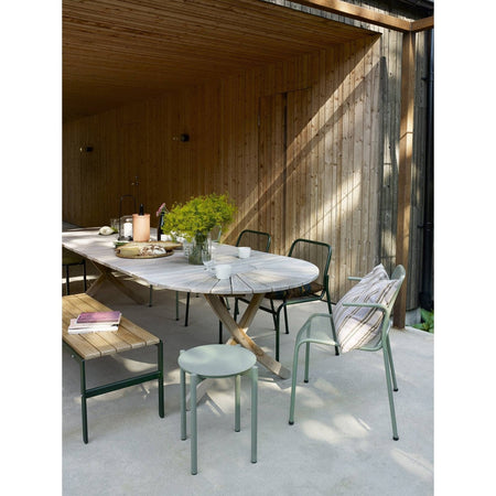 The Selandia Extendable Table from Skagerak by Fritz Hansen embodies the charm of Nordic summer living – light sea air, balcony breezes, and shared meals in the garden. With its graceful curved crossover legs and slatted, stadium-shaped tabletop, it combines elegance with robust craftsmanship. Designed for flexibility, the table is easily extendable with one or two additional leaves, making it as suitable for intimate dinners as it is for larger gatherings. Crafted with care, the Selandia Table reflects the timeless quality and functionality of Scandinavian outdoor design.