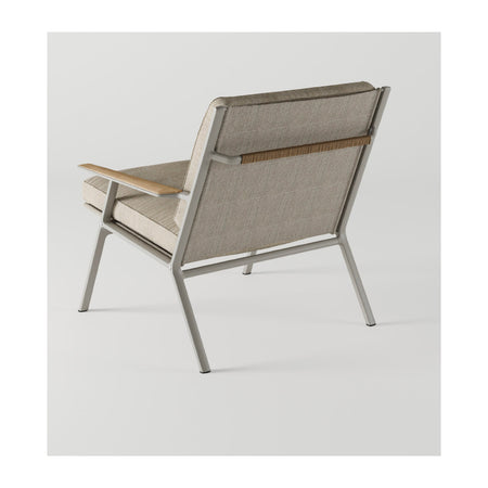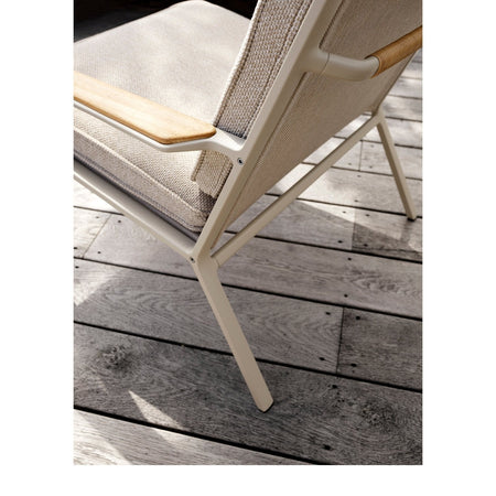 The chair features an aluminium frame, teak armrest details, and weather-resistant cushions with washable covers.
