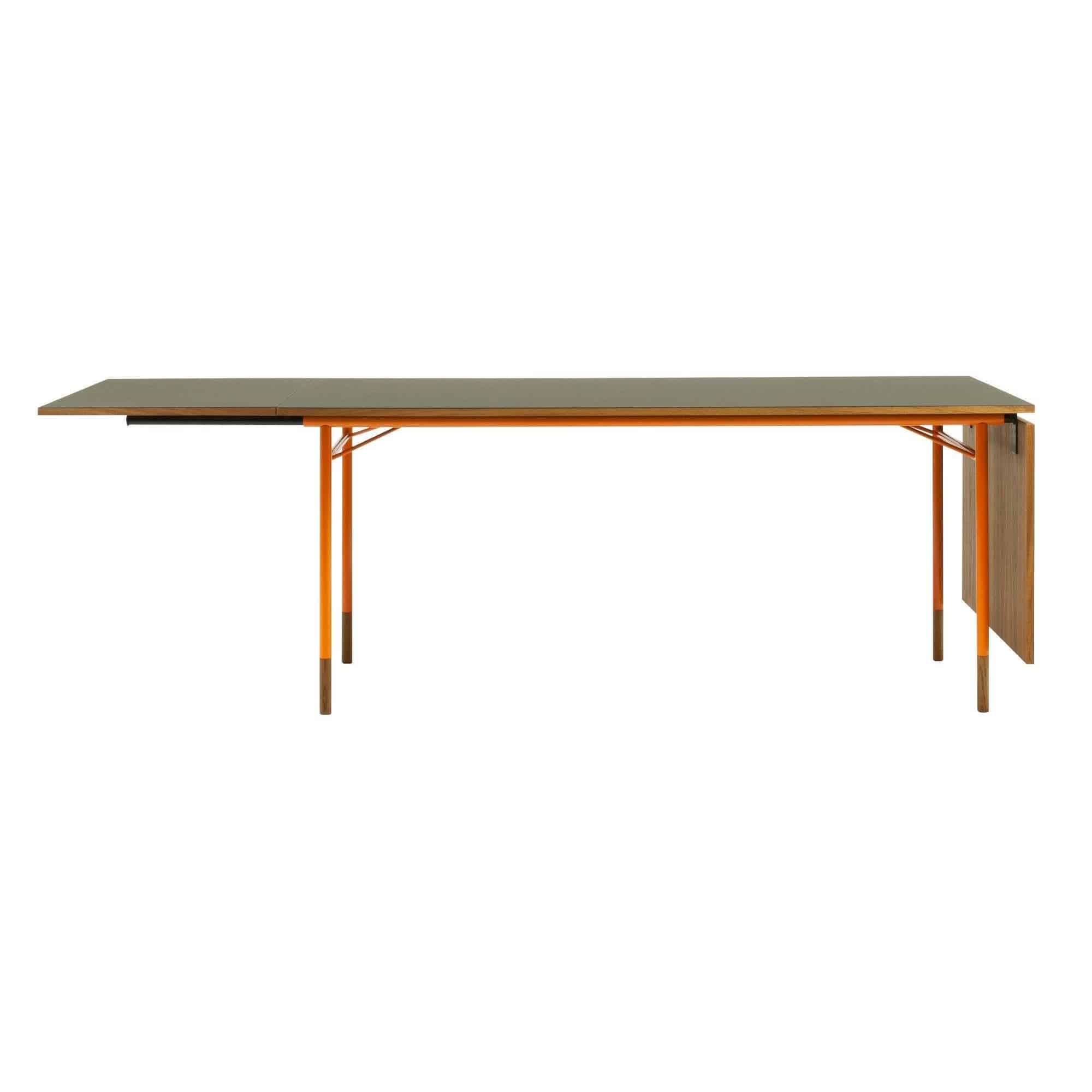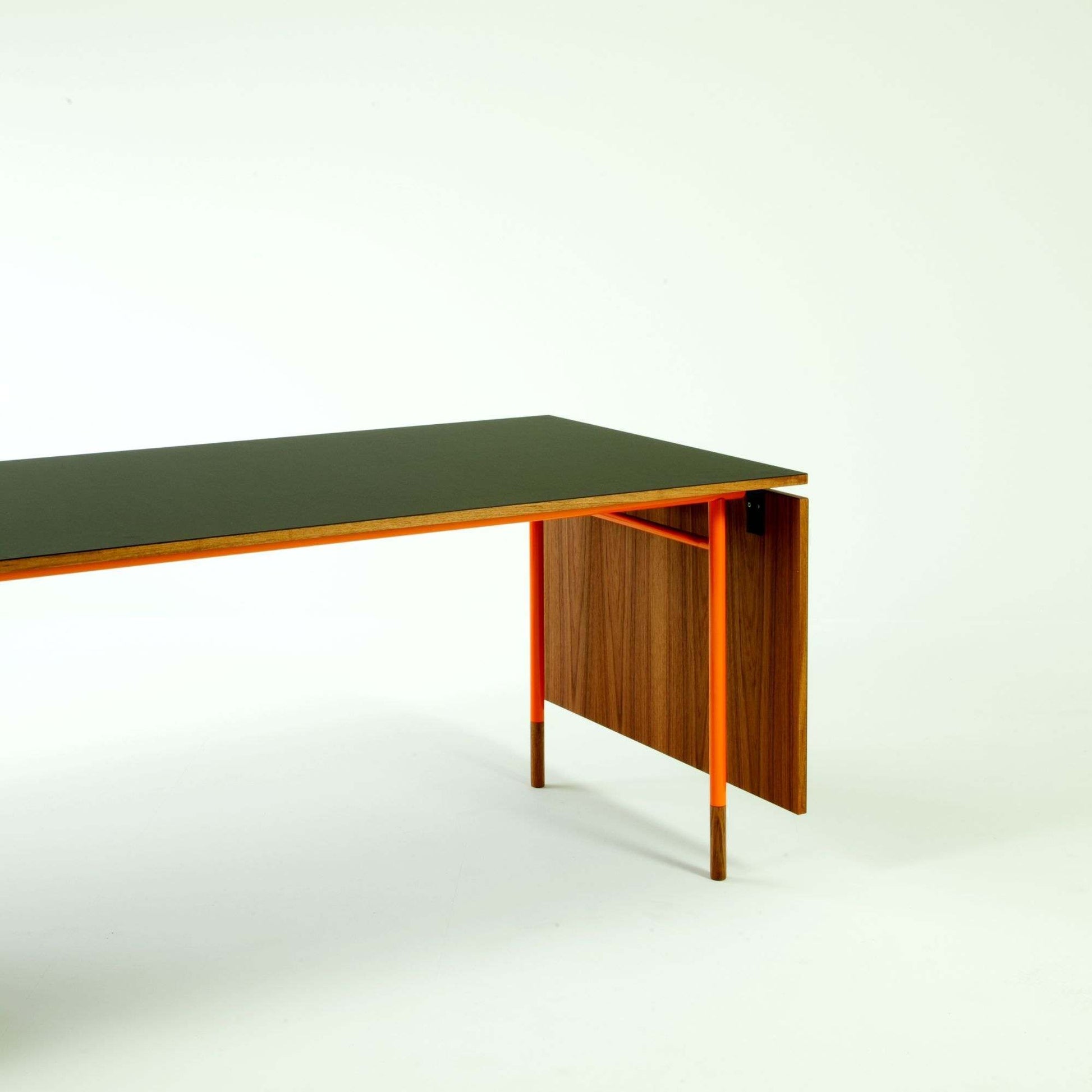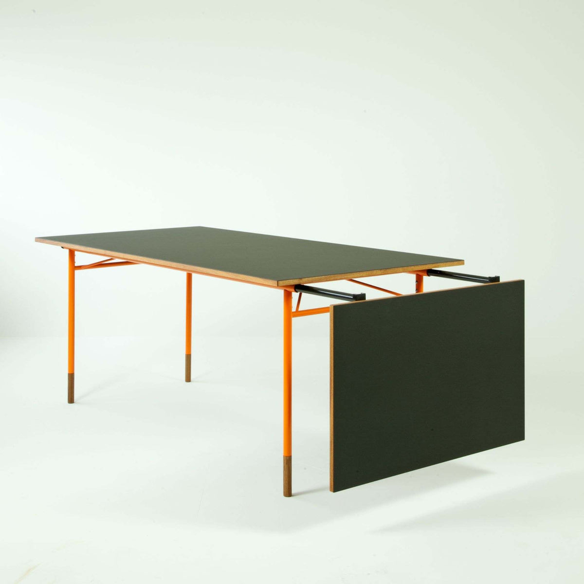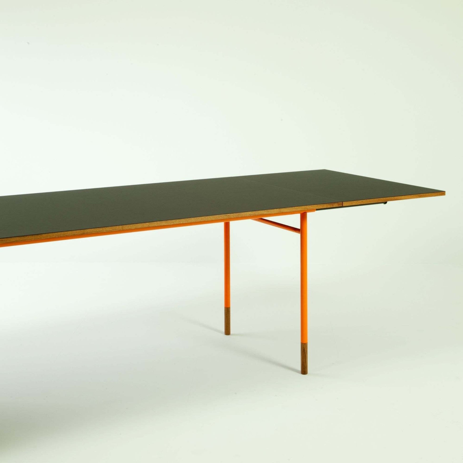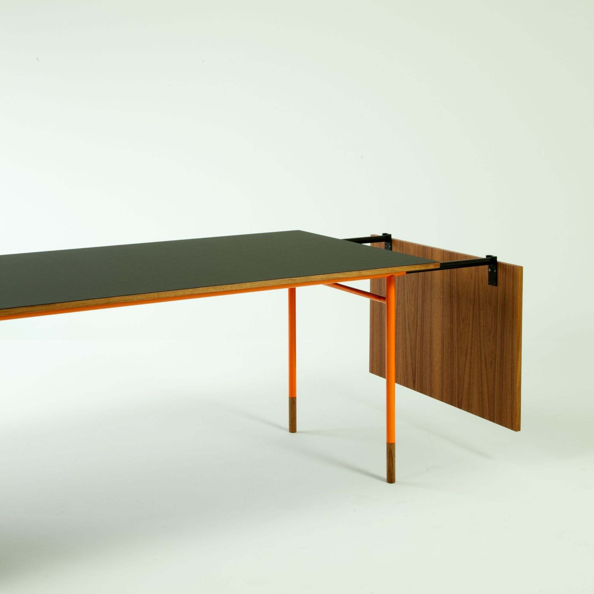 A design from the 1950s, a beautifully bright orange frame unites with walnut wood and black linoleum to form both a playful and sophisticated design that can stand the test of time. Designed to adapt to your space, the dining table is defined by special brackets that allow for two drop leaves to hang vertically at both ends, allowing for you to easily minimise and maximise your dining environment for changing purposes and occasions. A unique design bursting with intricate detail and character, the Nyhavn Dining Table is both a practical piece and elegant design statement all in one.