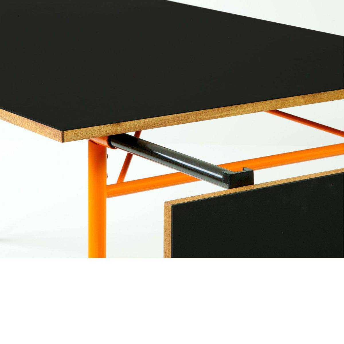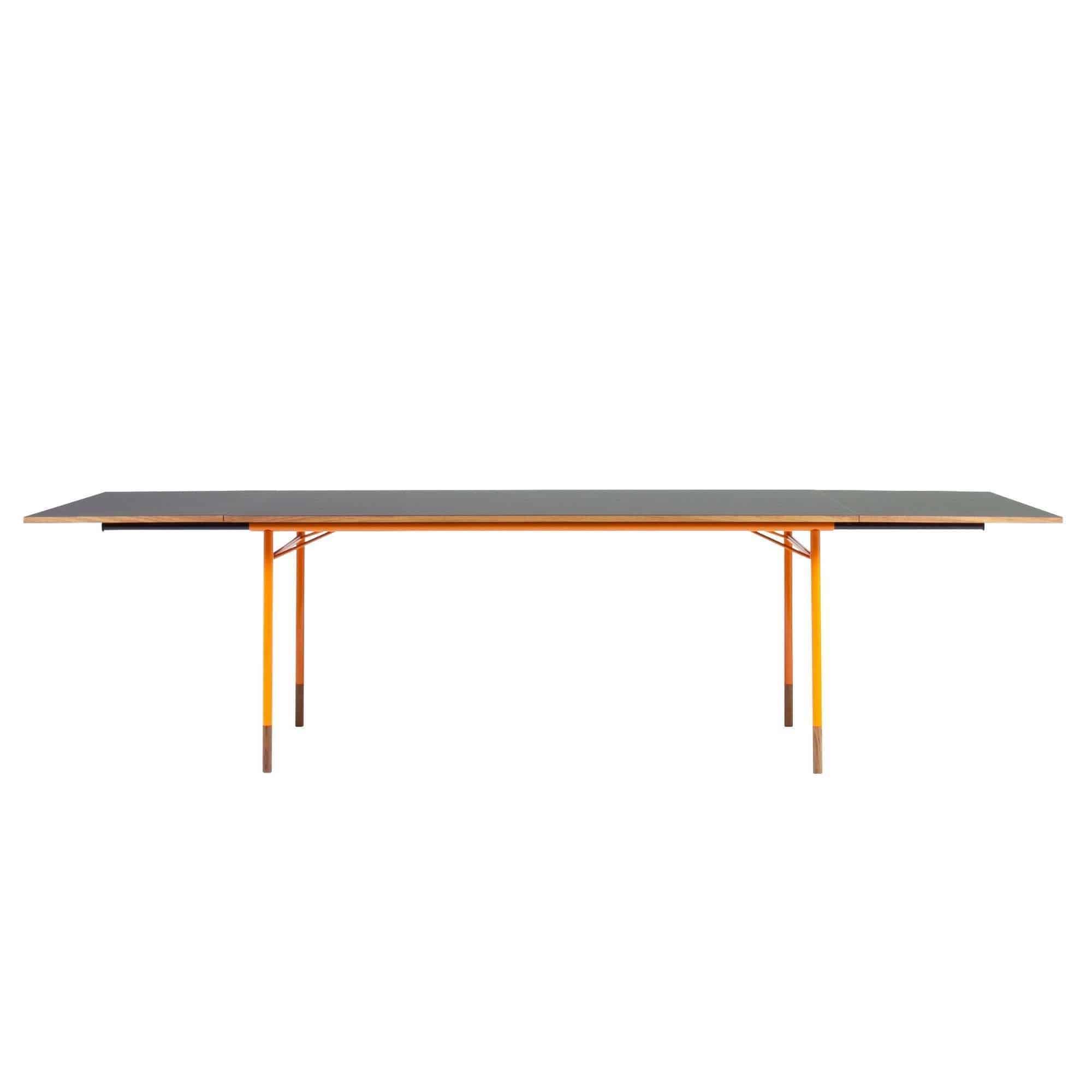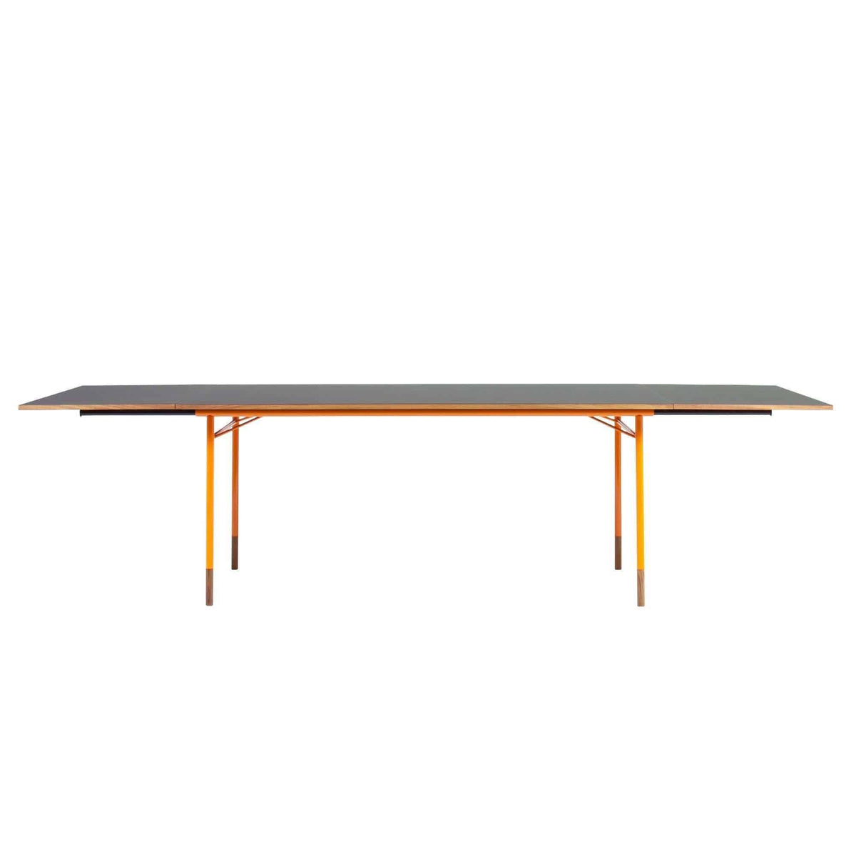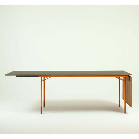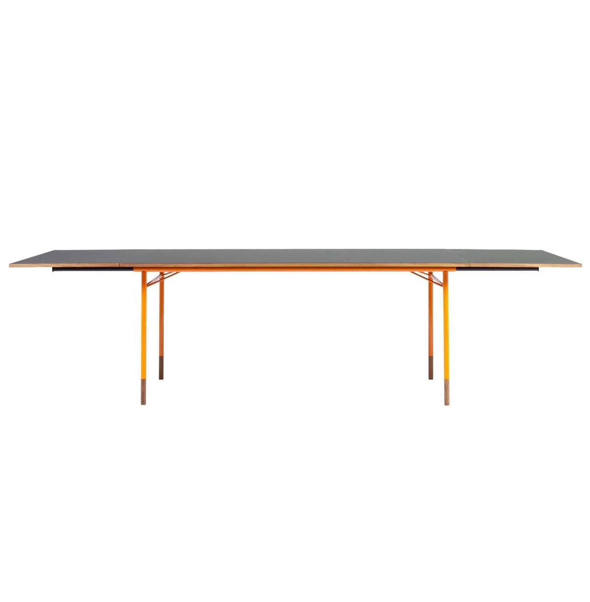 A design from the 1950s, a beautifully bright orange frame unites with walnut wood and black linoleum to form both a playful and sophisticated design that can stand the test of time. Designed to adapt to your space, the dining table is defined by special brackets that allow for two drop leaves to hang vertically at both ends, allowing for you to easily minimise and maximise your dining environment for changing purposes and occasions. A unique design bursting with intricate detail and character, the Nyhavn Dining Table is both a practical piece and elegant design statement all in one.