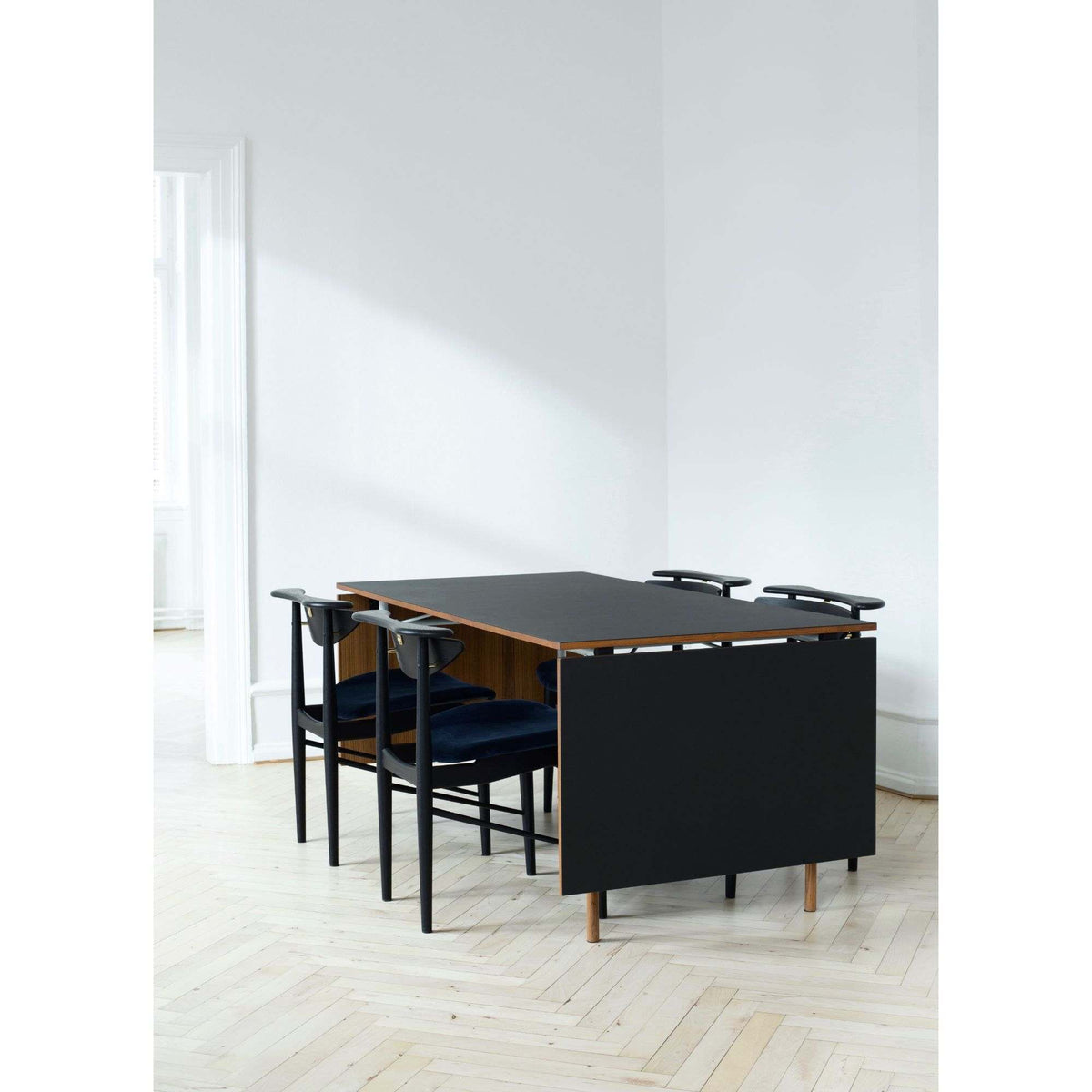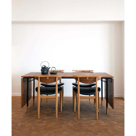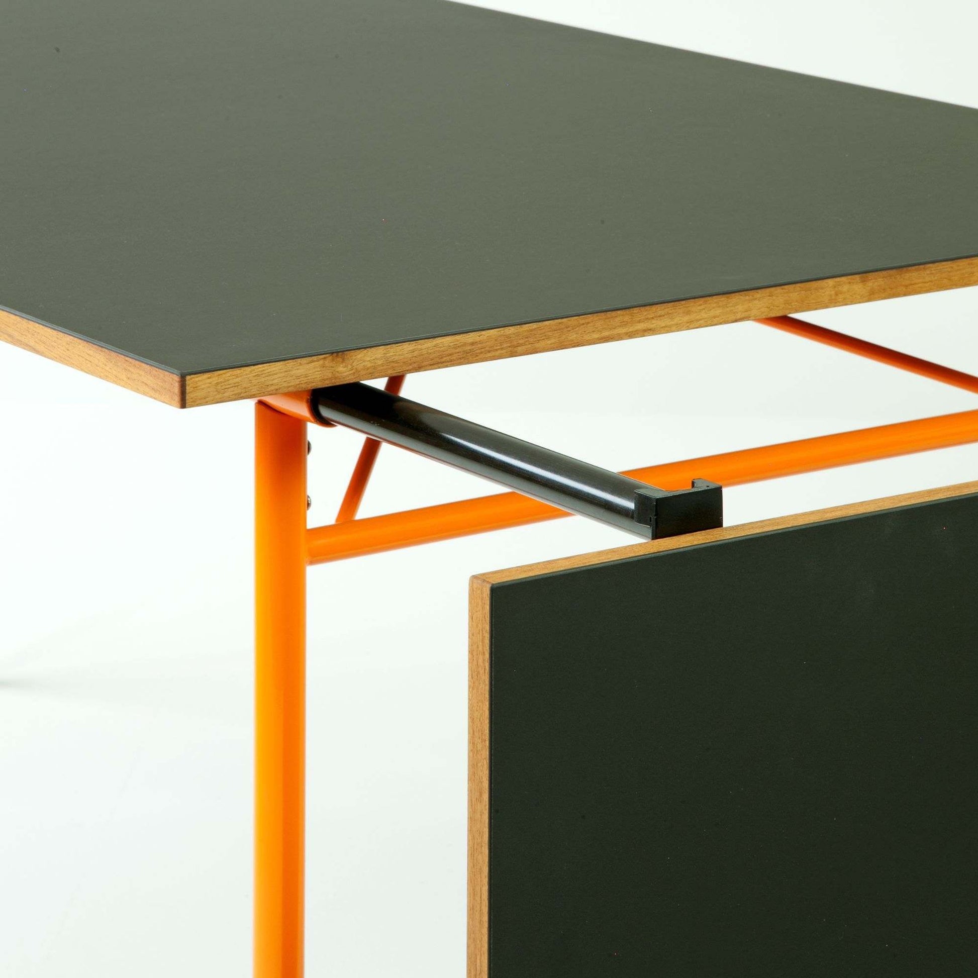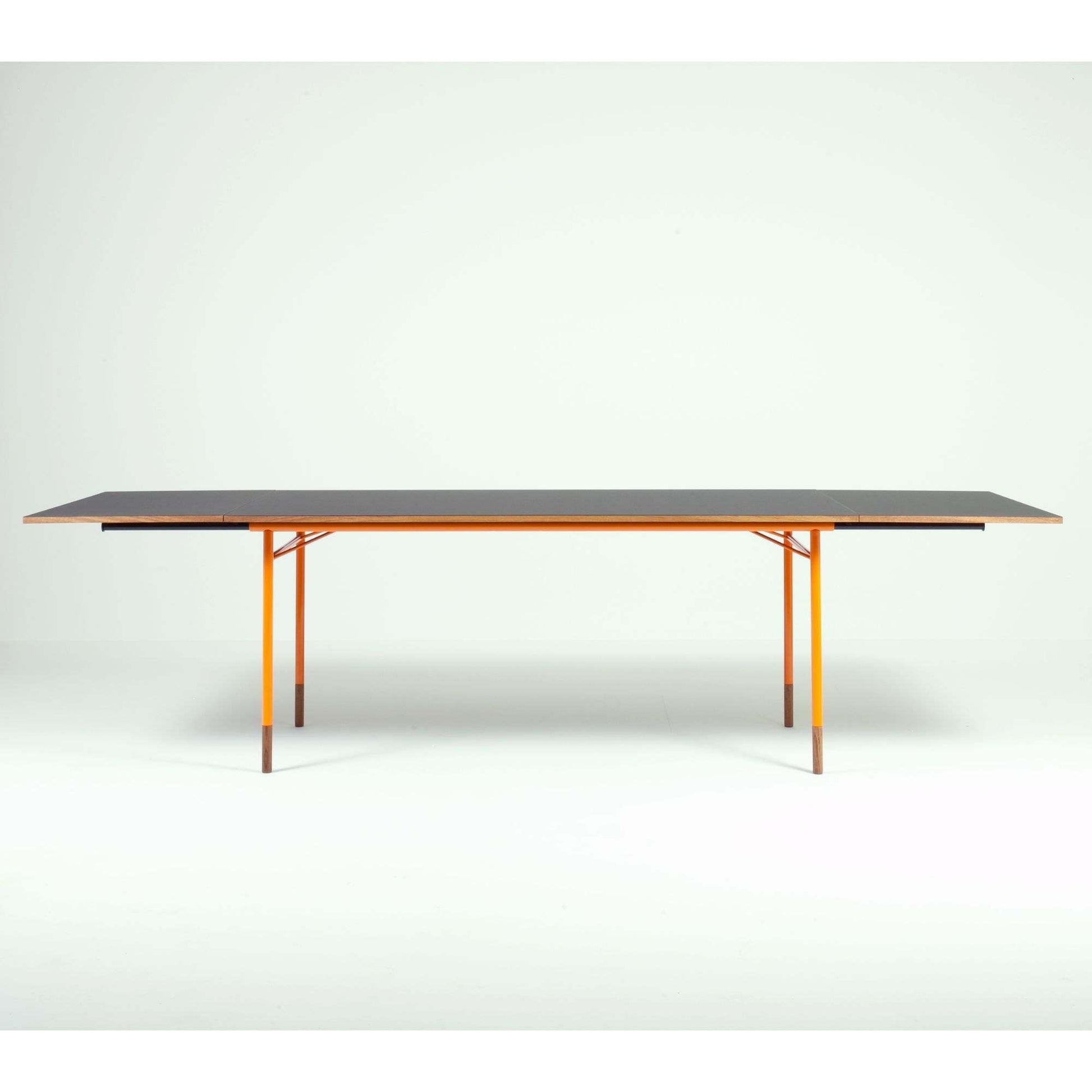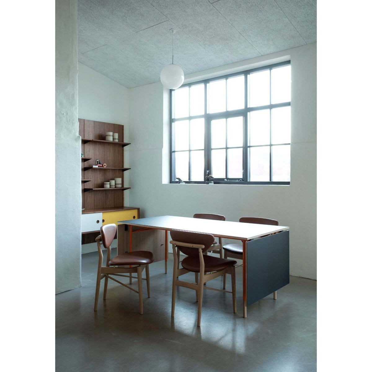 A design from the 1950s, a beautifully bright orange frame unites with walnut wood and black linoleum to form both a playful and sophisticated design that can stand the test of time. Designed to adapt to your space, the dining table is defined by special brackets that allow for two drop leaves to hang vertically at both ends, allowing for you to easily minimise and maximise your dining environment for changing purposes and occasions. A unique design bursting with intricate detail and character, the Nyhavn Dining Table is both a practical piece and elegant design statement all in one.