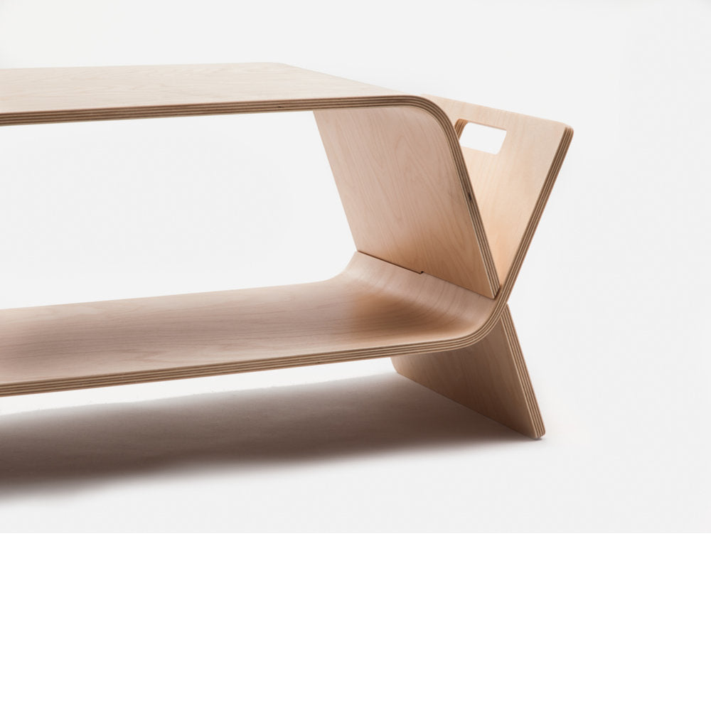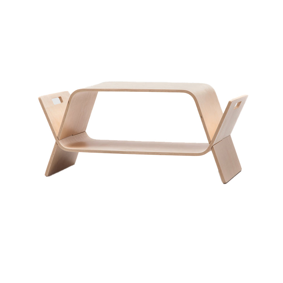 The award-winning piece of furniture naturally forms two low modern tables that are then 'embraced' together in order to form a storage unit / magazine rack / occasional table.