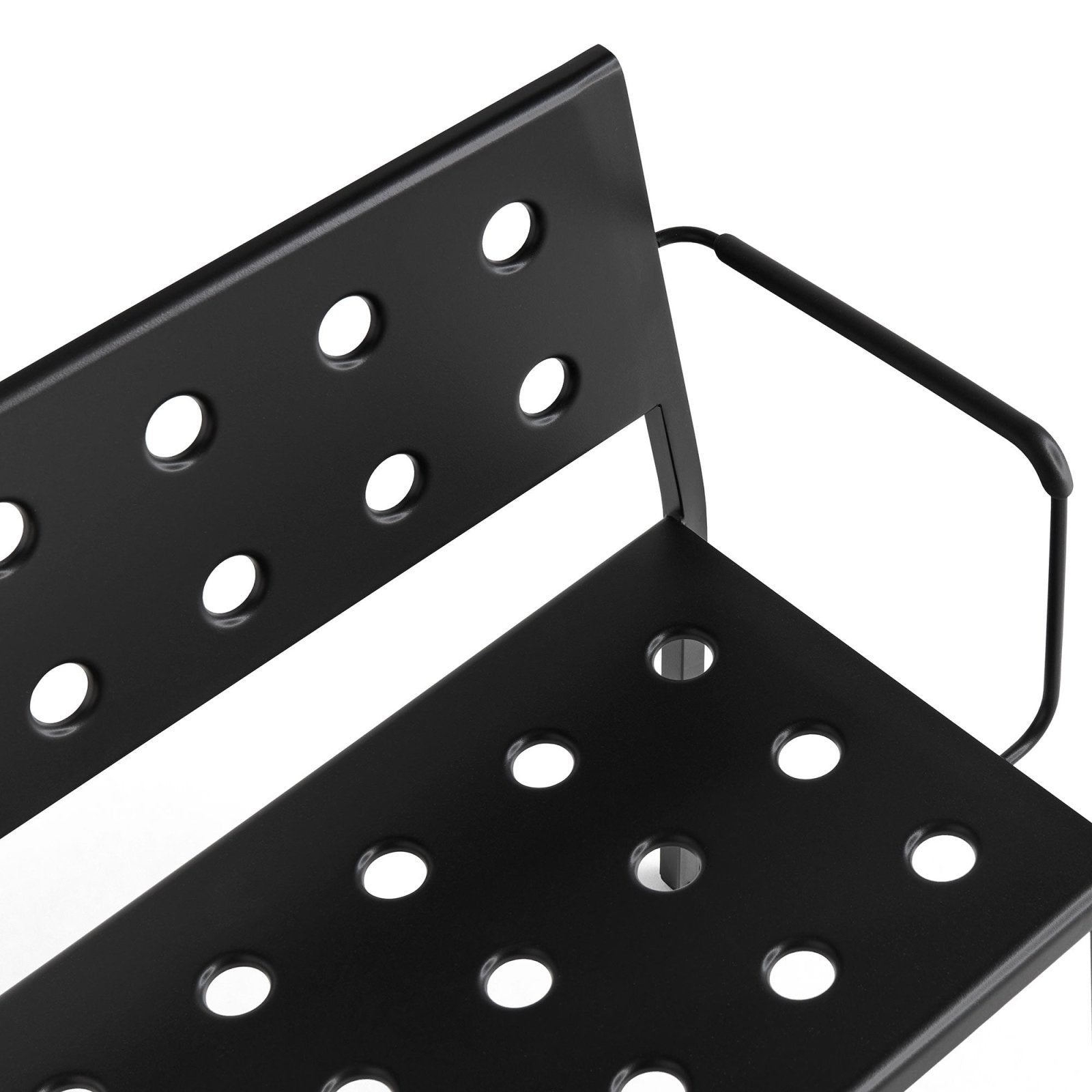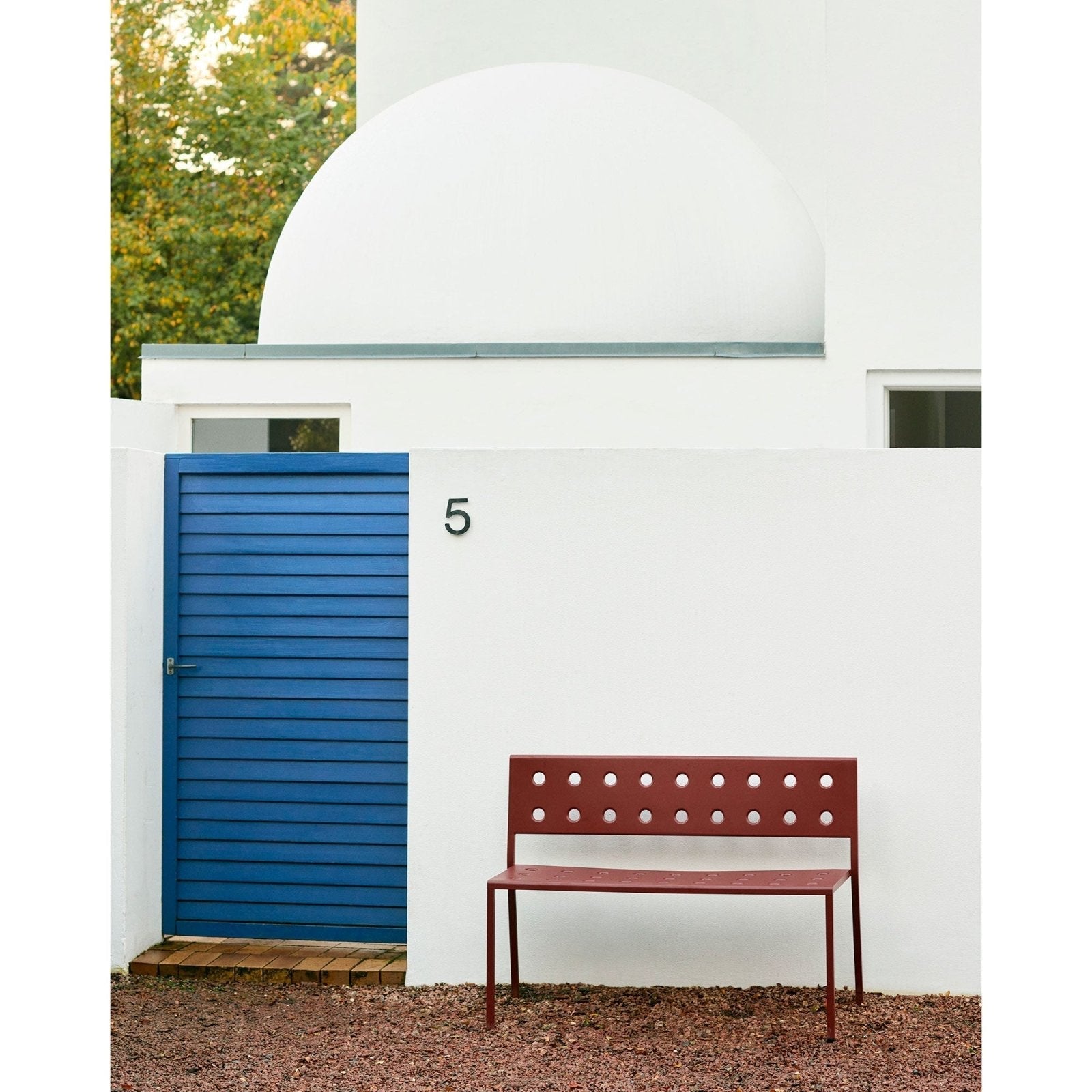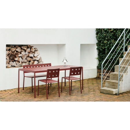 Designed for HAY by Ronan and Erwan Bouroullec, the Balcony Dining Bench is an elegant and compact seating solution for outdoor use. The simple rectangular design is softened by the slender legs, with the multiple holes in the seat and back strengthening the construction, as well as creating a distinct expression.
