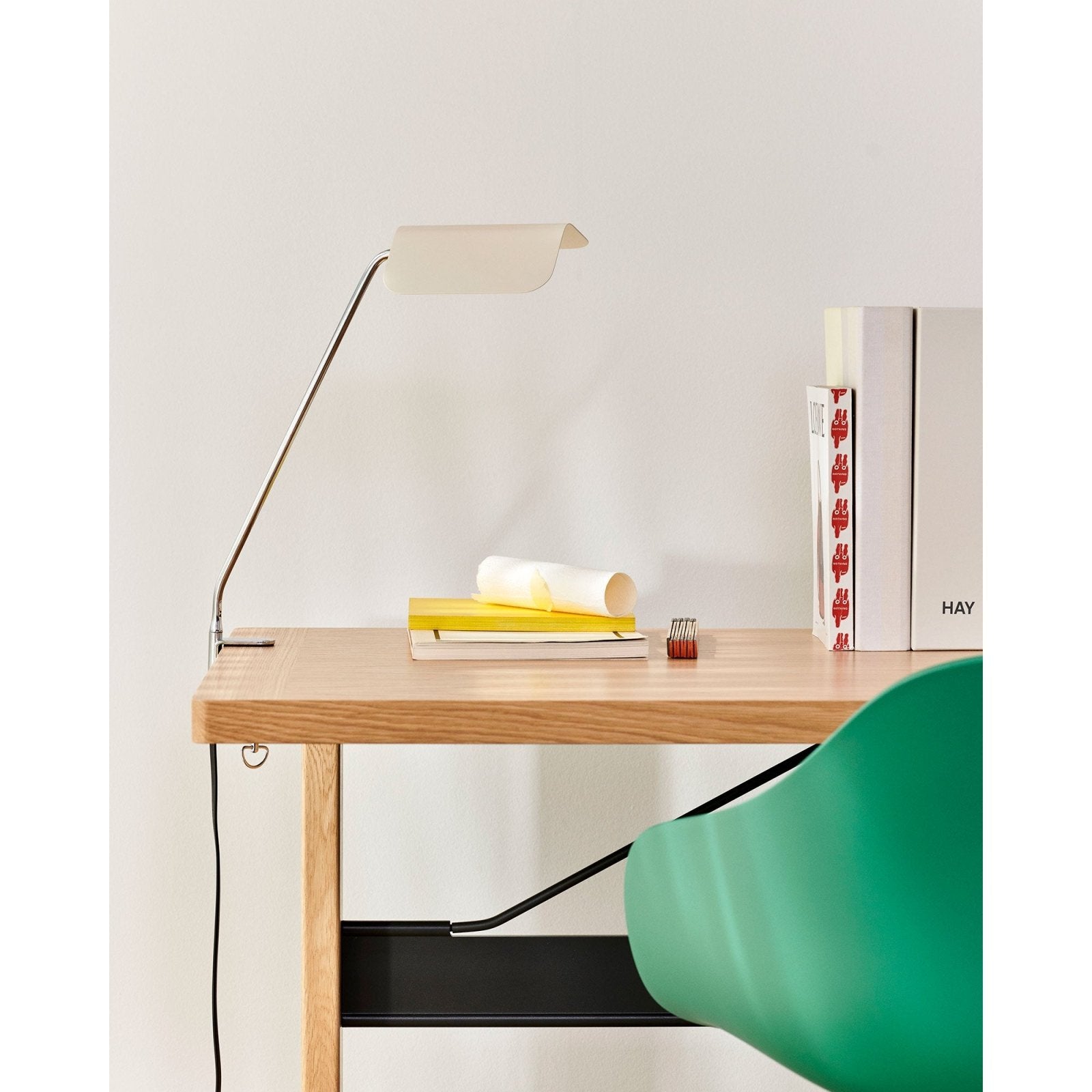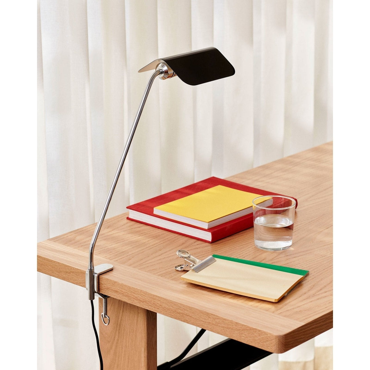 Taking cues from the classic Banker’s Light, British designer John Tree merged archetypal references with his contemporary, colourful sensibility to create the Apex Desk Clip Lamp. The folded steel shades create a peaked roofline silhouette, providing the inspiration behind the lamp’s name as well as offering a graphic contrast to the chrome-plated bases. Featuring an adjustable clip that enables the lamp to be fixed to a wide variety of horizontal surfaces, both the colourful shade and angled arm can rotate 360 degrees, giving users optimal control to aim the light in any direction. The Apex Desk Clip Lamp offers a functional lighting solution for a multitude of spaces and uses, from a task light on a desk to a reading lamp over a sofa.