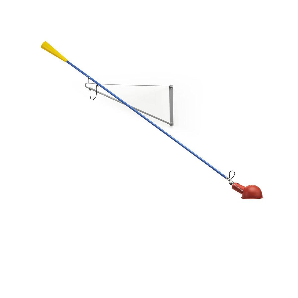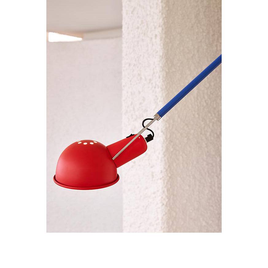 The Wall Lamp's innovative design enables the user to adjust the lamp to their desired position, featuring a yellow tapered counterweight, perfectly balancing the diffuser for ease of movement and a connecting blue arm supported via a slender steel wall fitting.