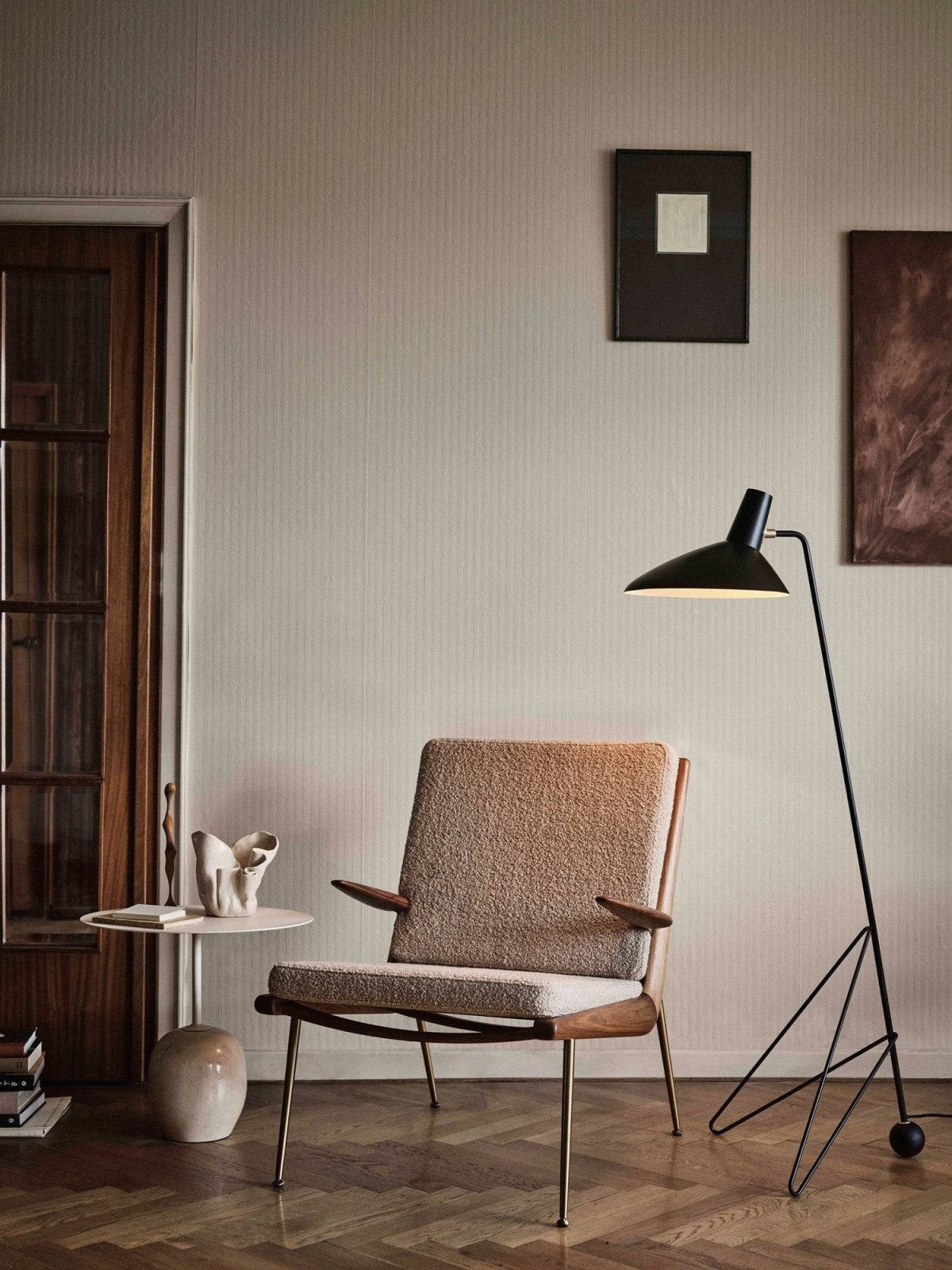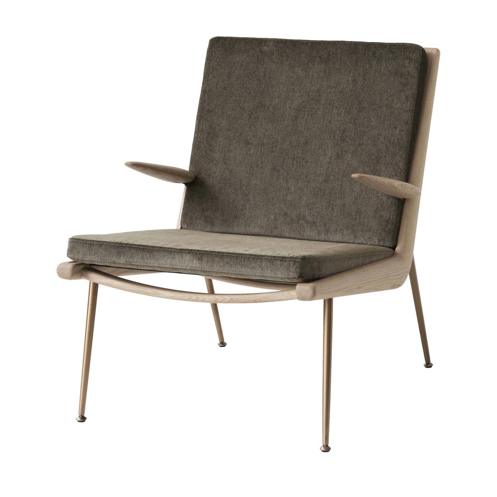 Debuted in 1956, the lounge chair by duo Hvidt & Mølgaard for  &Tradition has a no-frills, streamlined form From the hand-polished wooden frame, to its slender brass legs, the Boomerang endures as a masterpiece of Danish design.