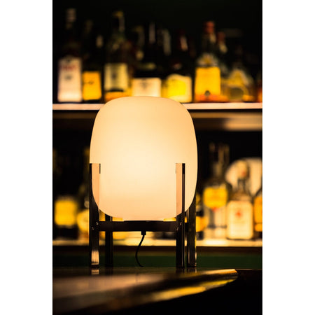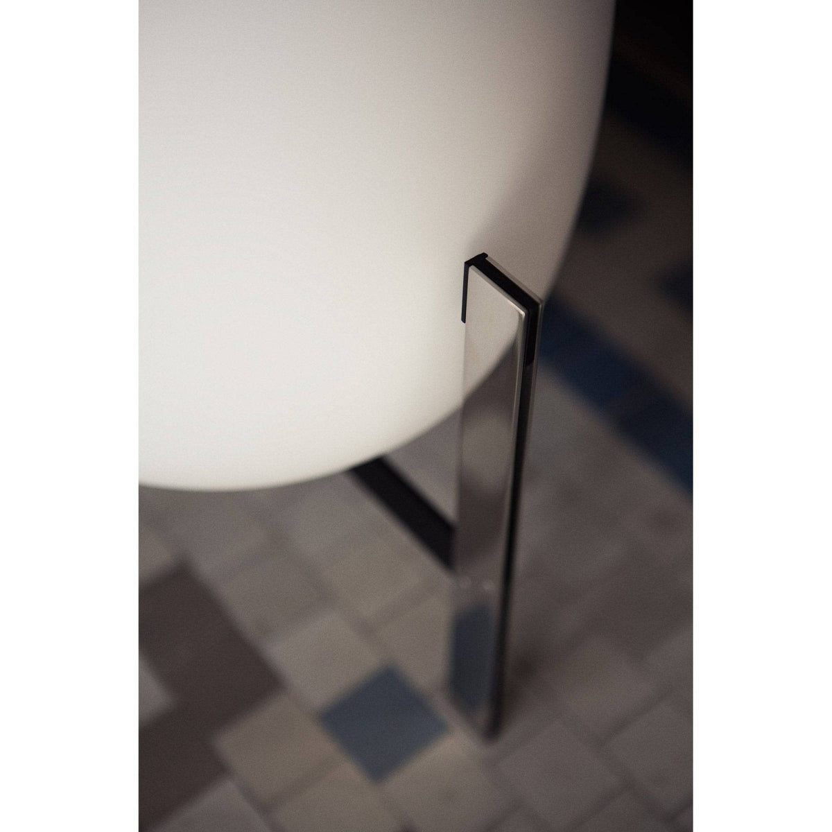 A solid and iconic stainless steel structure holding a globe of white opaline light with or without leather handle.