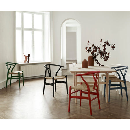 Versatile style: The softened surface creates a subtle contrast when paired with natural wood furniture such as Wegner’s CH327 dining table in soap-treated beech.
