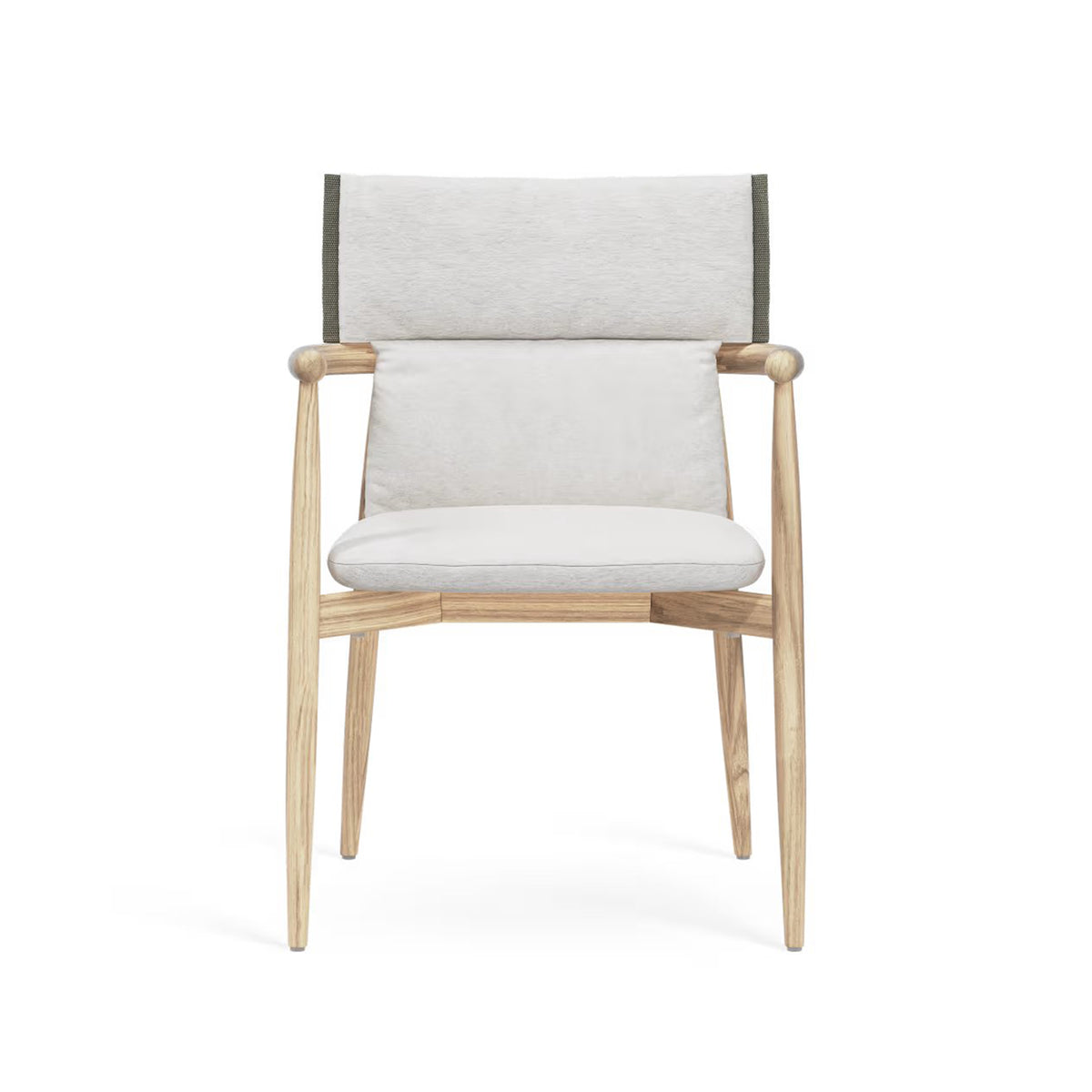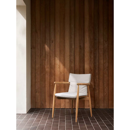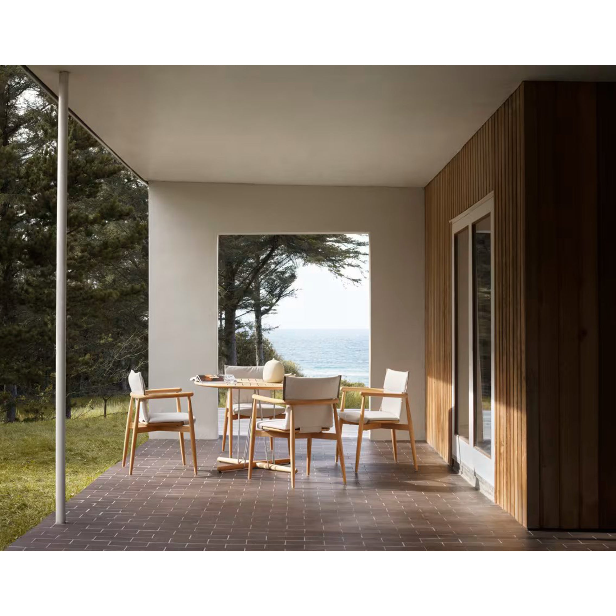 The cushion for the E008 Embrace Outdoor Dining Chair is upholstered in Agora Life textile, a weather-resistant and recycled fabric designed for outdoor durability. With its padded comfort and refined detailing, it elevates the chair’s natural teak frame while adding a soft, indoor-like expression.