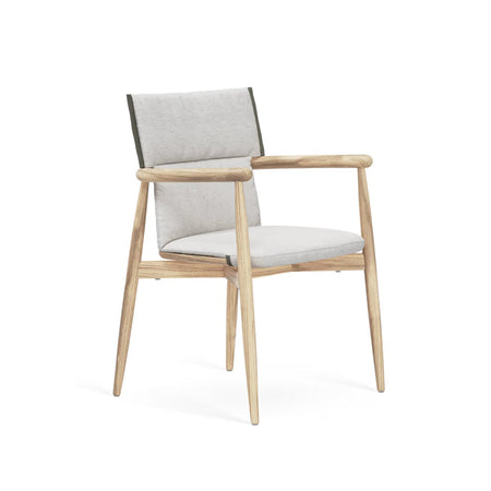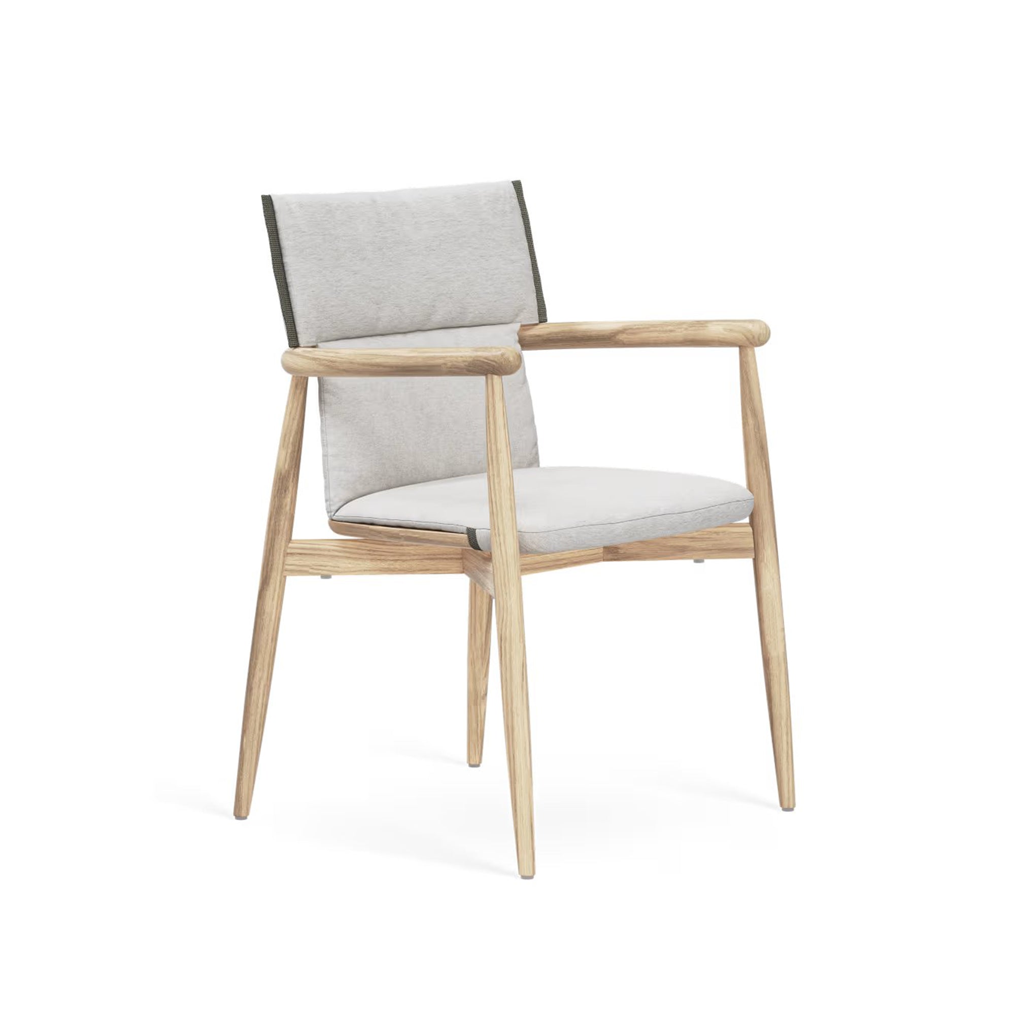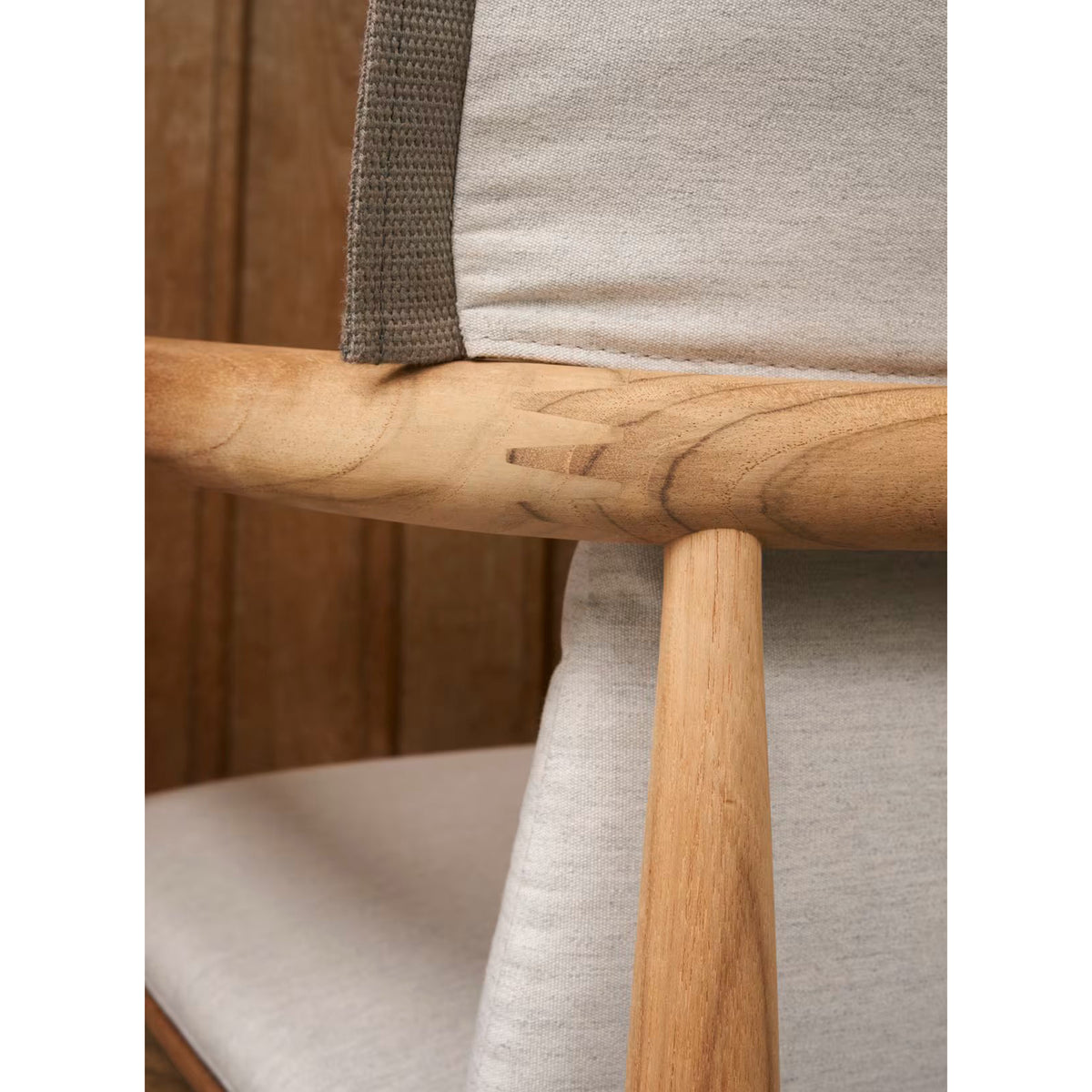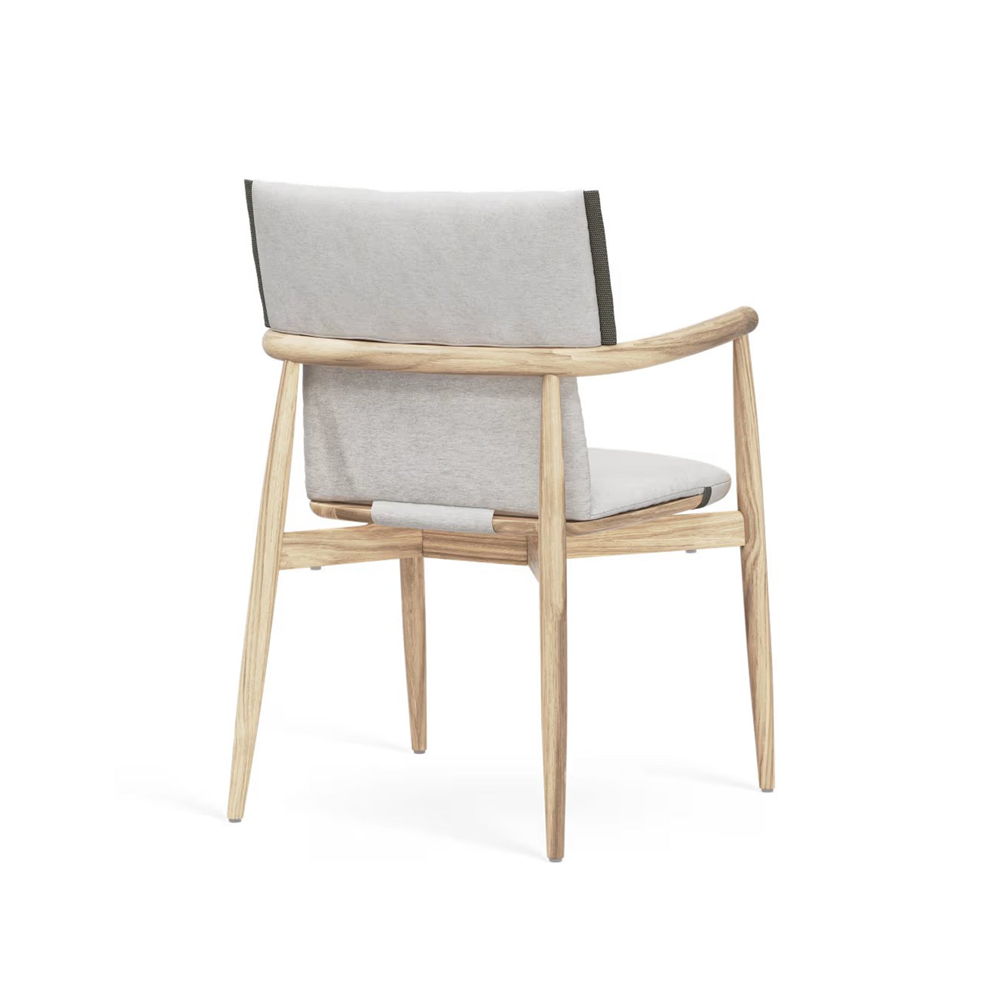 The cushion for the E008 Embrace Outdoor Dining Chair is upholstered in Agora Life textile, a weather-resistant and recycled fabric designed for outdoor durability. With its padded comfort and refined detailing, it elevates the chair’s natural teak frame while adding a soft, indoor-like expression.