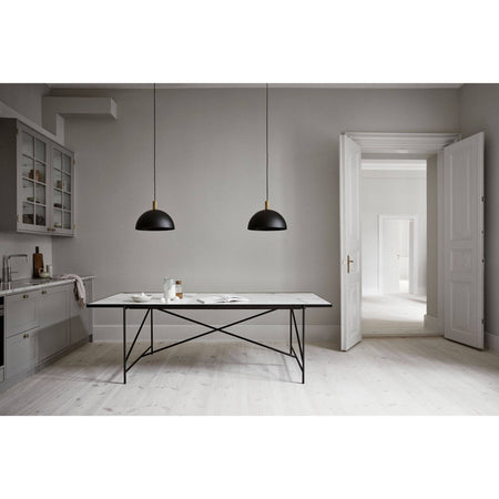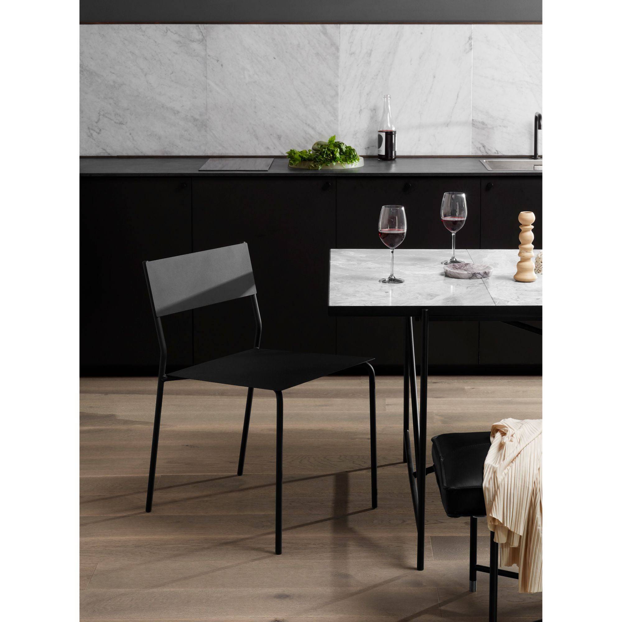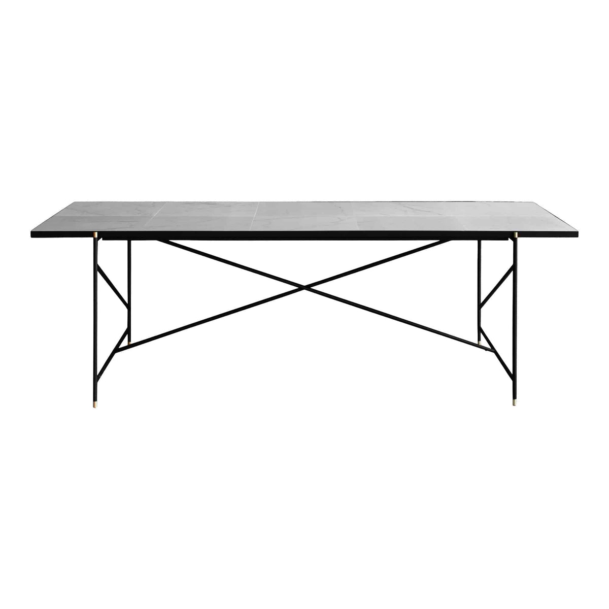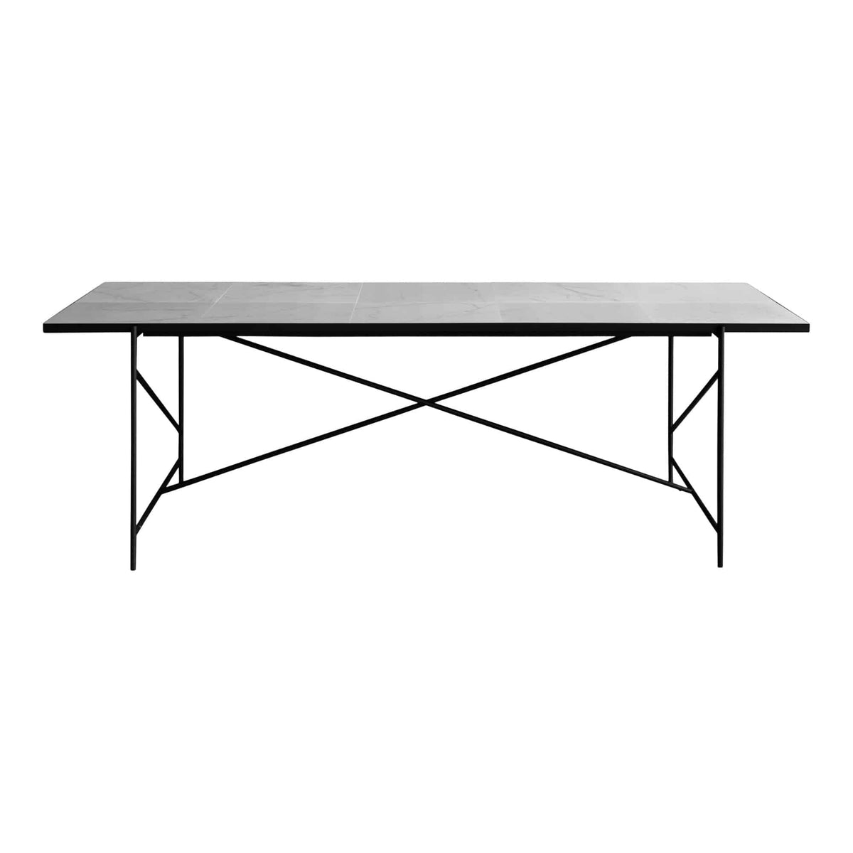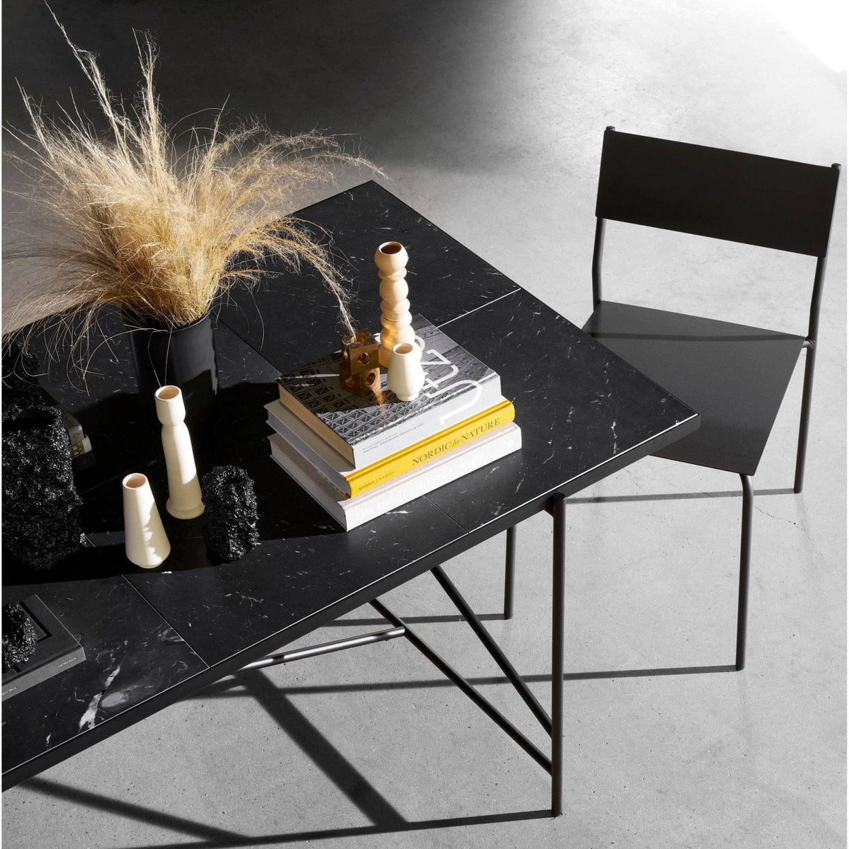 A marble topped statement piece exudes luxurious Nordic appeal. The range of sleek dining tables is an ultra-modern take on a tile top table, with large pieces of Italian marble mounted in a slender steel frame, that almost defies gravity. The natural variations and veins of the marble make each table truly unique.