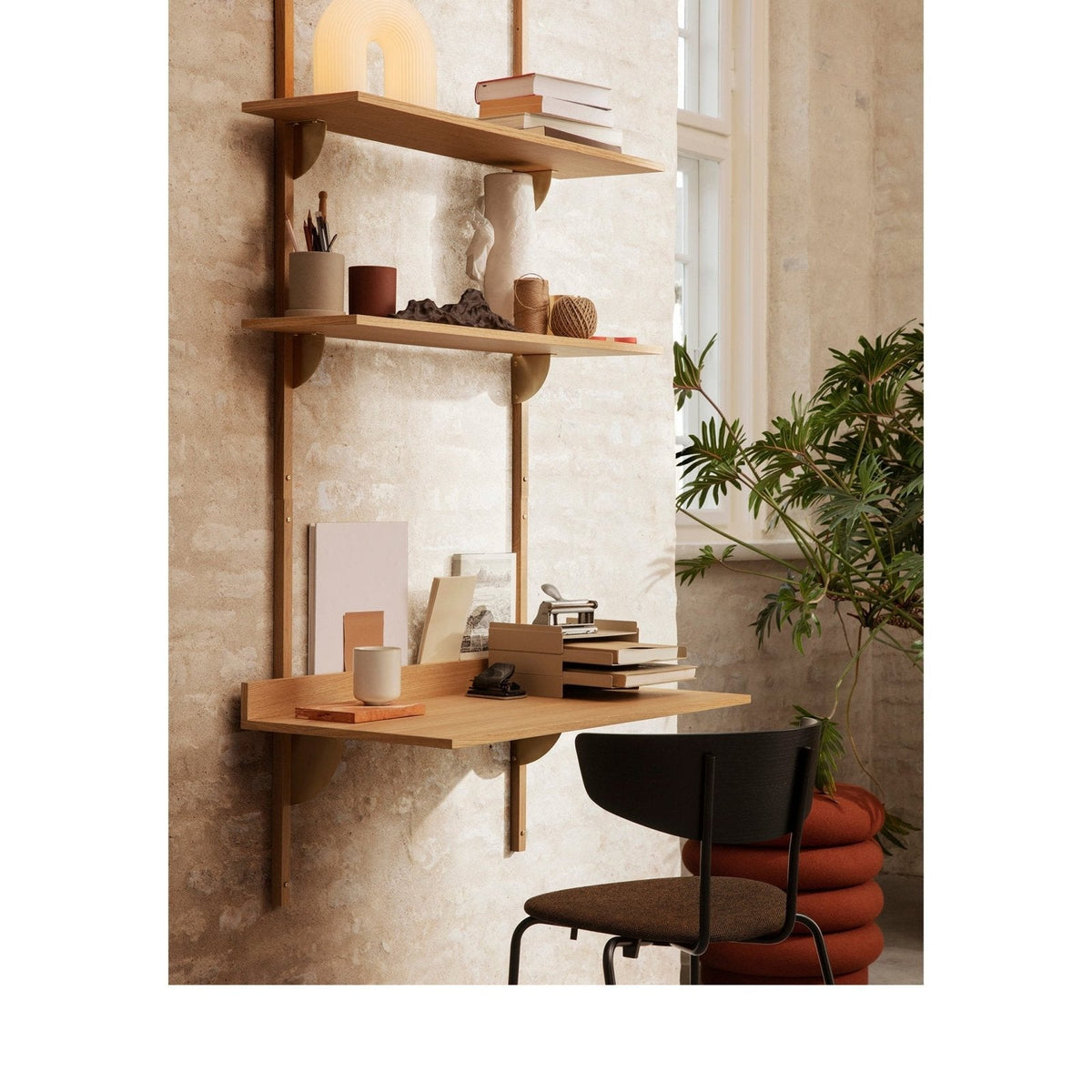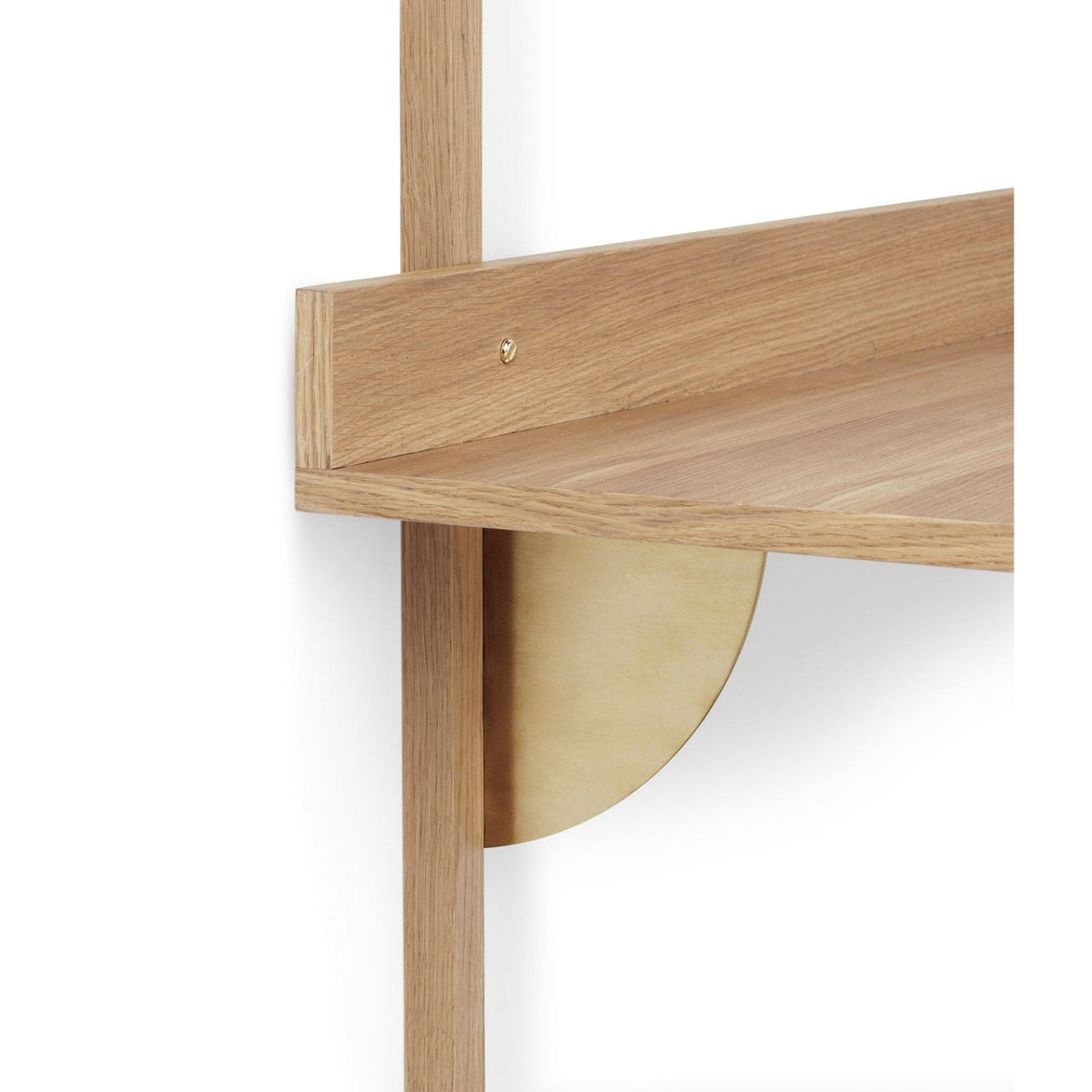 The Sector Desk by Ferm Living is a contemporary and modern take on Mid-century shelving units, characterised by its strong simplicity and the combination of classic wood and brass.