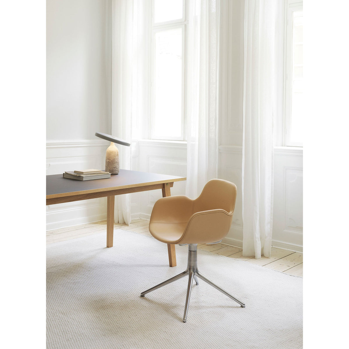 The upholstered version of the chair emphasizes the main concept of the design, and is a beautiful illustration of how Form’s strong design language and well considered silhouette gets a different, sensuous dimension and increased comfort. Luxurious woolen textiles and exclusive leather soften the expression and add warmth, while the specially developed mounting solution also gets a new appearance, taking the look in new directions.