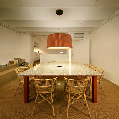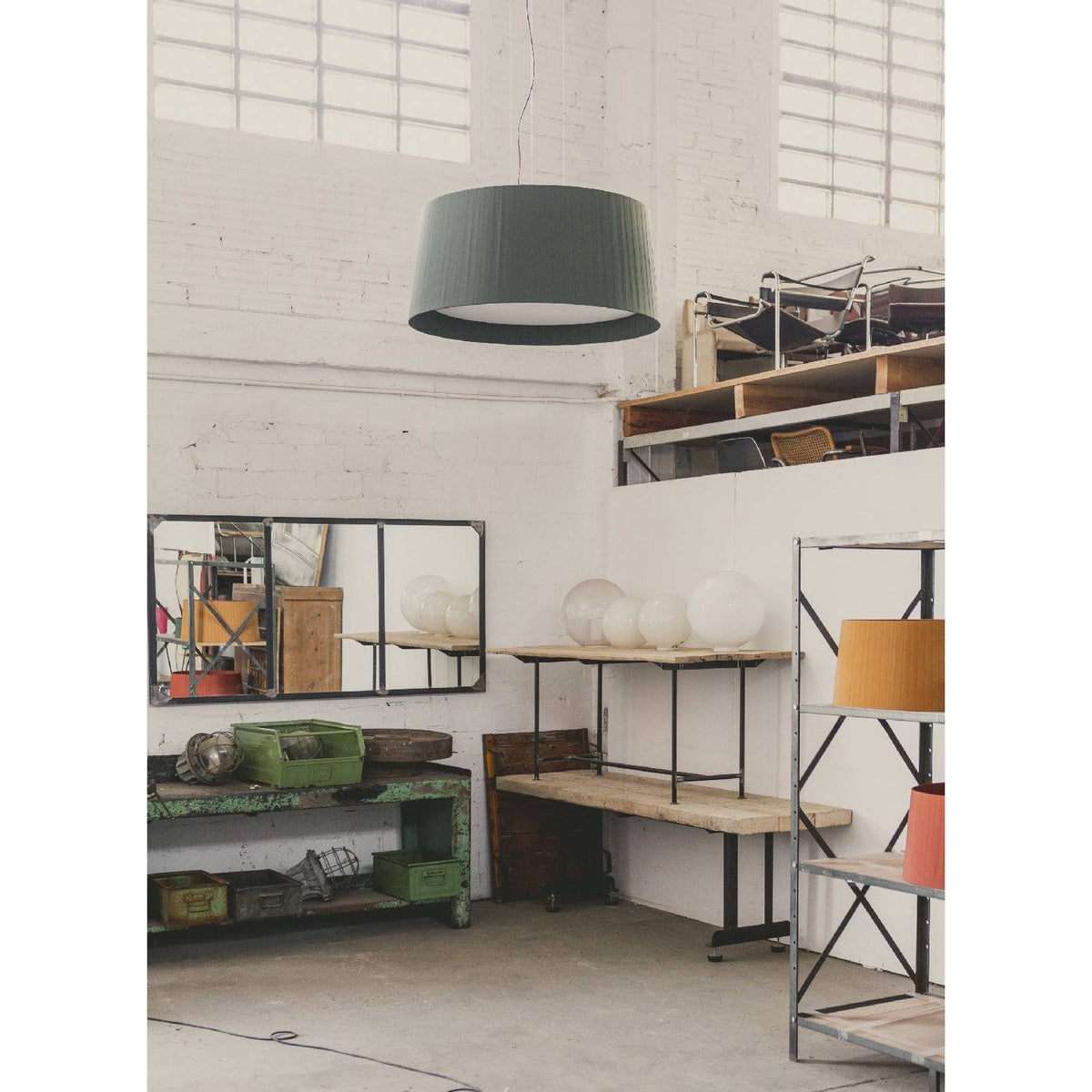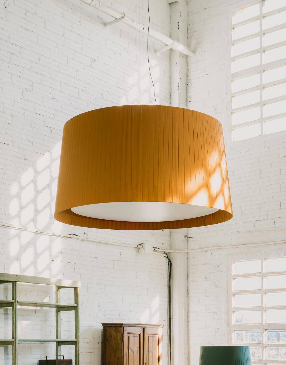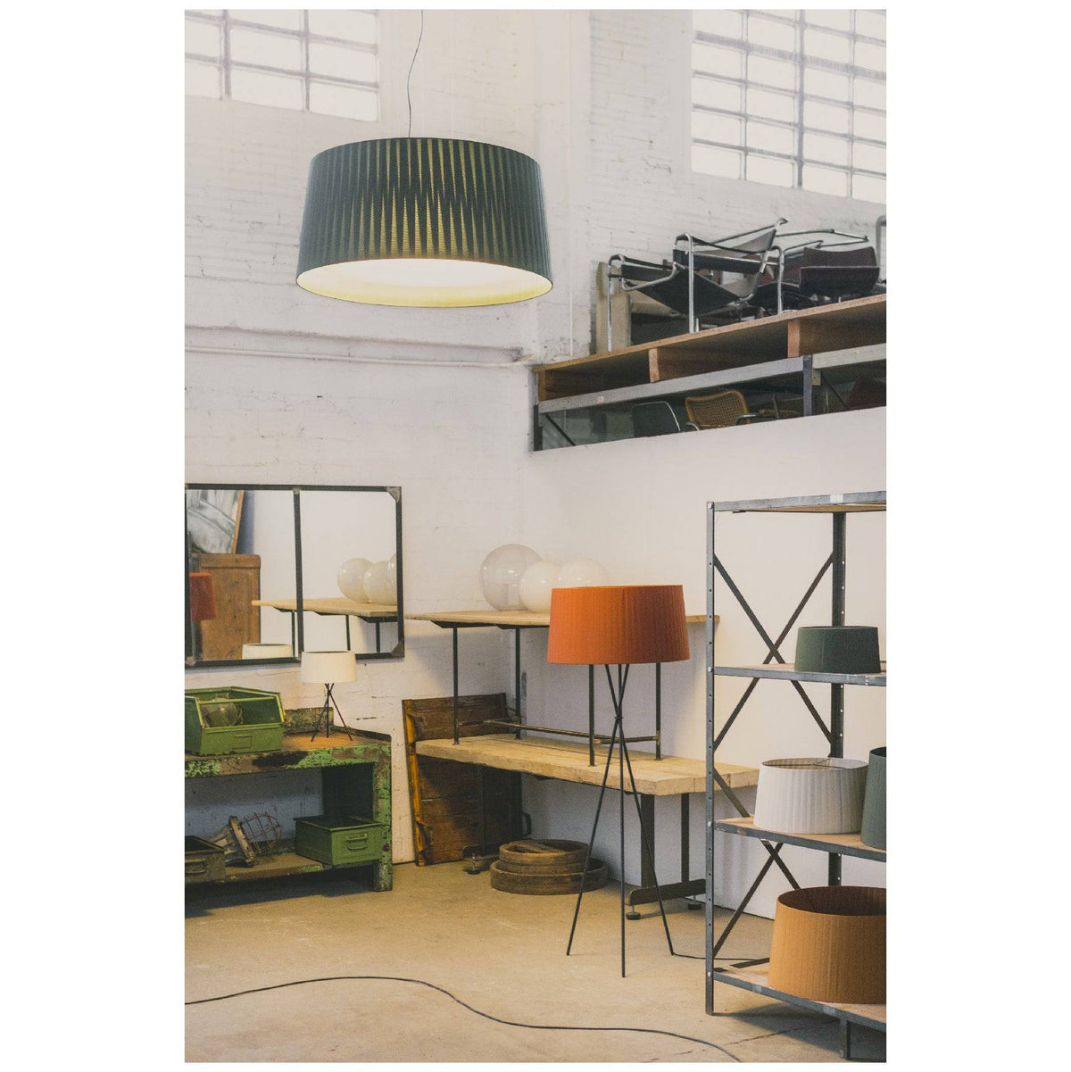 The GT1000 and GT1500 are voluminous pendant lamps with ribbon shades, especially designed for projects with expansive spaces. Both lamps feature a large translucent disc that hides the powerful dimmable LED plate and pleasantly diffuses the light. Designed in 1994, the GT5 pendant lamp was the first of a large family created as an alternative to the use of cardboard, methacrylate, or solid textile shades; the use of handmade cotton ribbon reincorporates traditional craftsmanship. Then came the GT6, followed by the large format GT7, GT1000 and GT1500 designed for public spaces.