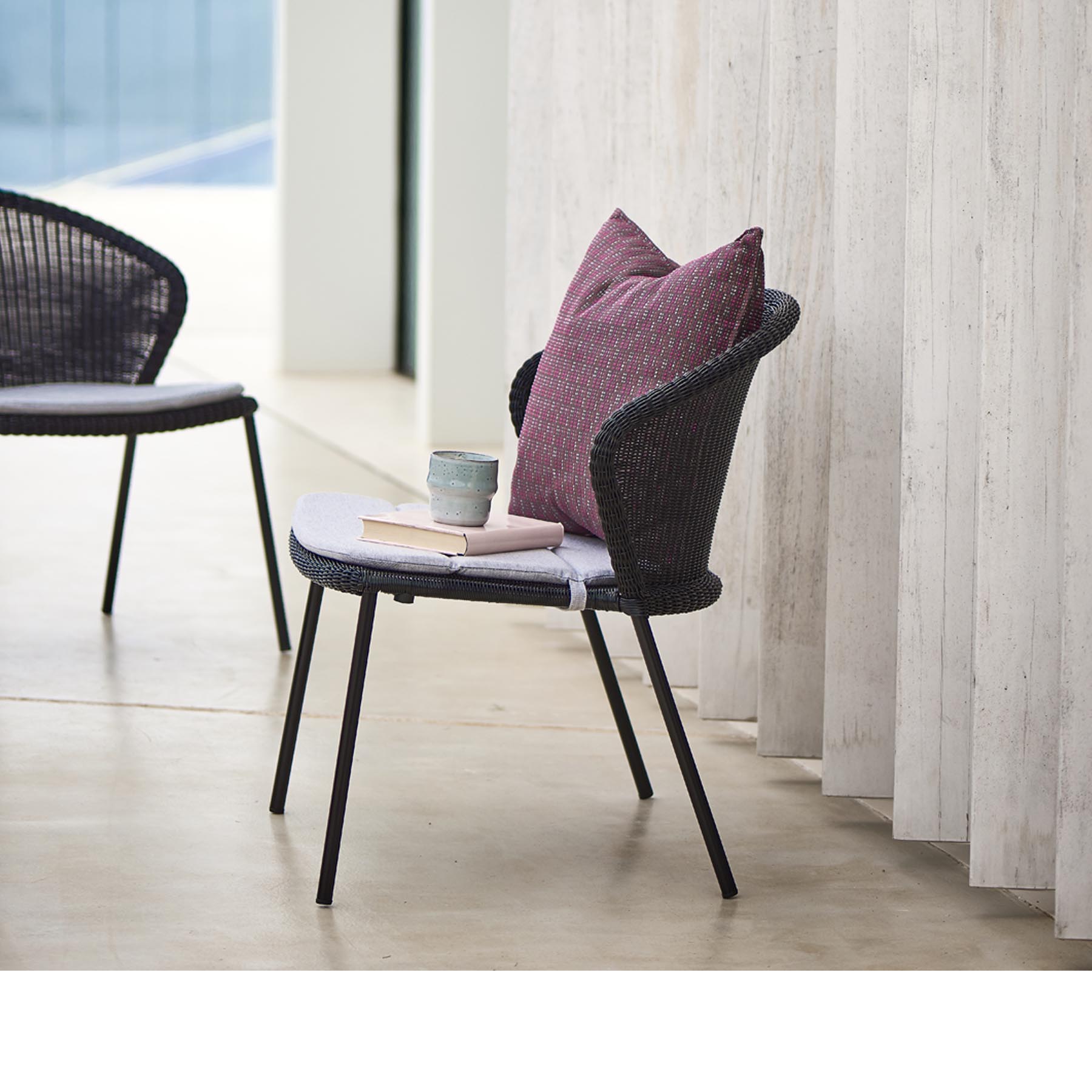The Lean Chair is eminently practical as it is stackable and manufactured in black Cane-line Weave®. The furniture can be outside all year as it dries quickly after rainfall. The grey cushions are made from moisture and water-resistant fabric.