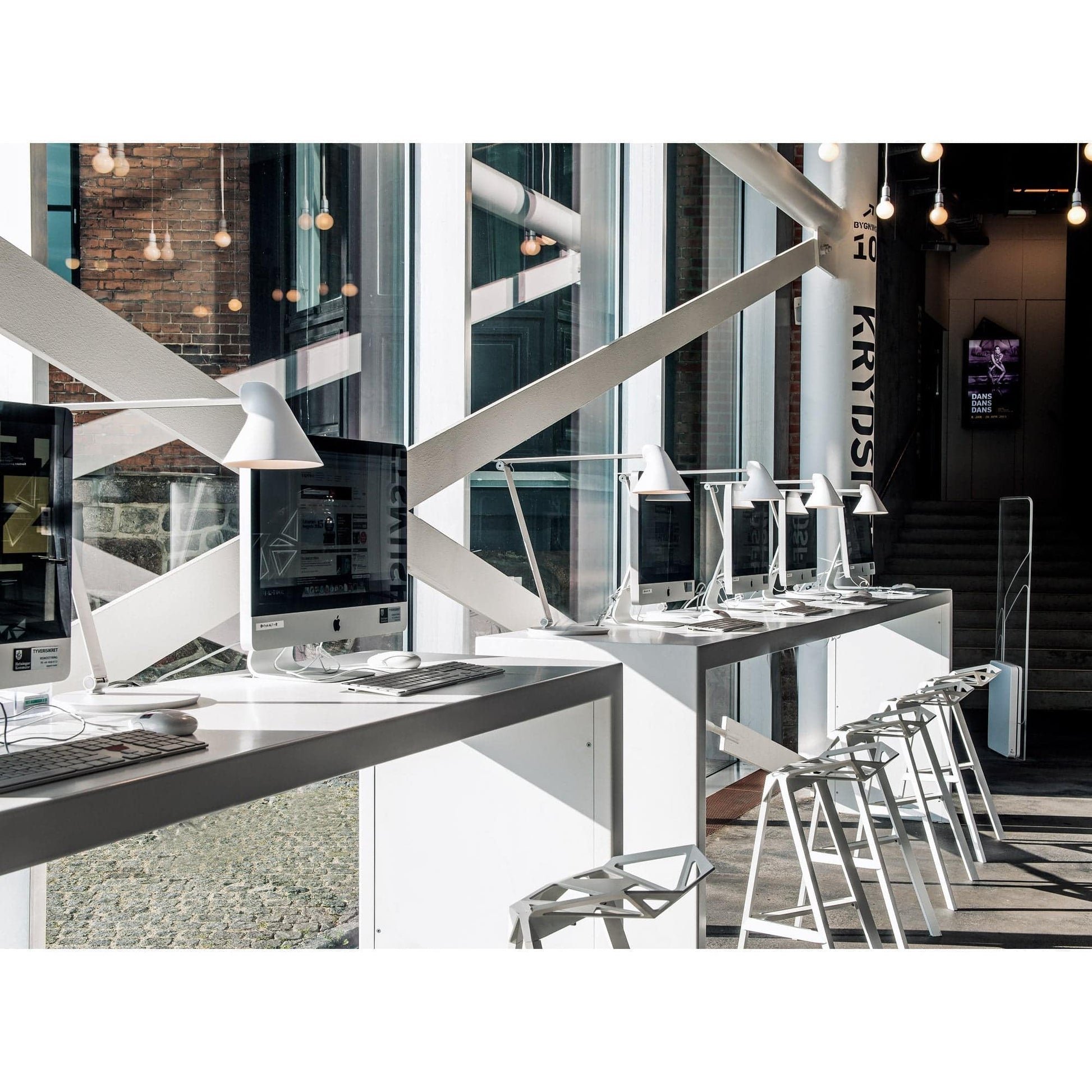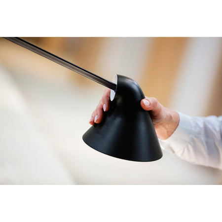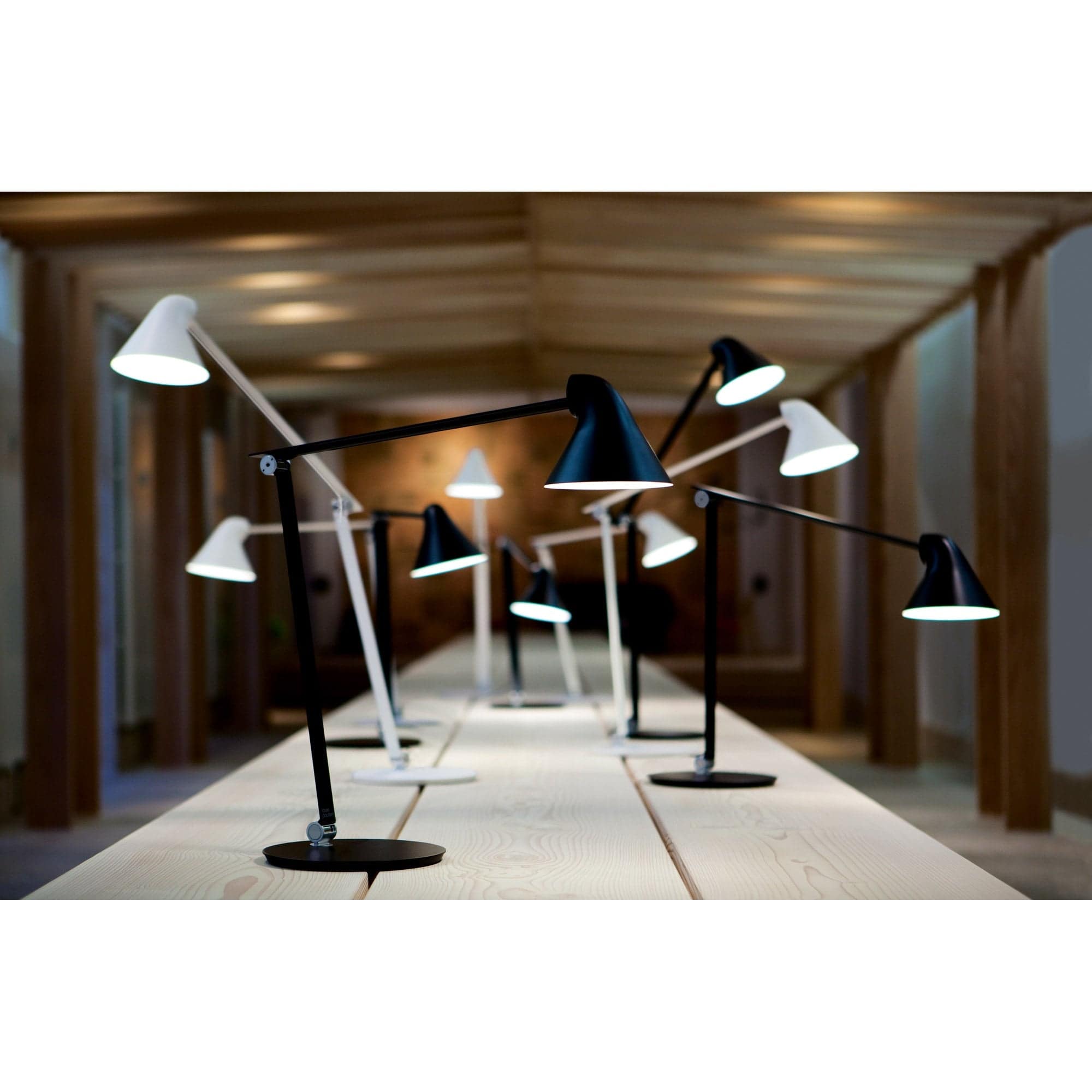 The NJP Table Lamp by Louis Poulsen was designed by Nendo design studio of Japan and designer Oki Sato as a new interpretation of the classic architect lamp. Its simple and honest look bares the lamp's functional components, and makes it self-explanatory in its expression. The lamp's applications have been considered in every detail: The two joints on the arm offers great flexibility making it easy to set the lamp position. As an added touch, the springs are exposed in the arm joints, and contribute to the lamp's decorative expression. In the same way, the rear shade opening towards the arm provides stepless adjustment of the head and ventilation for the LED units.