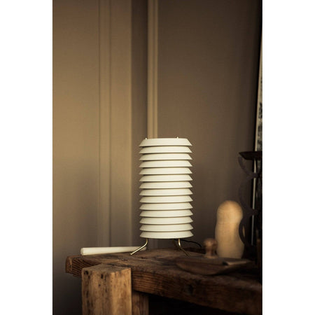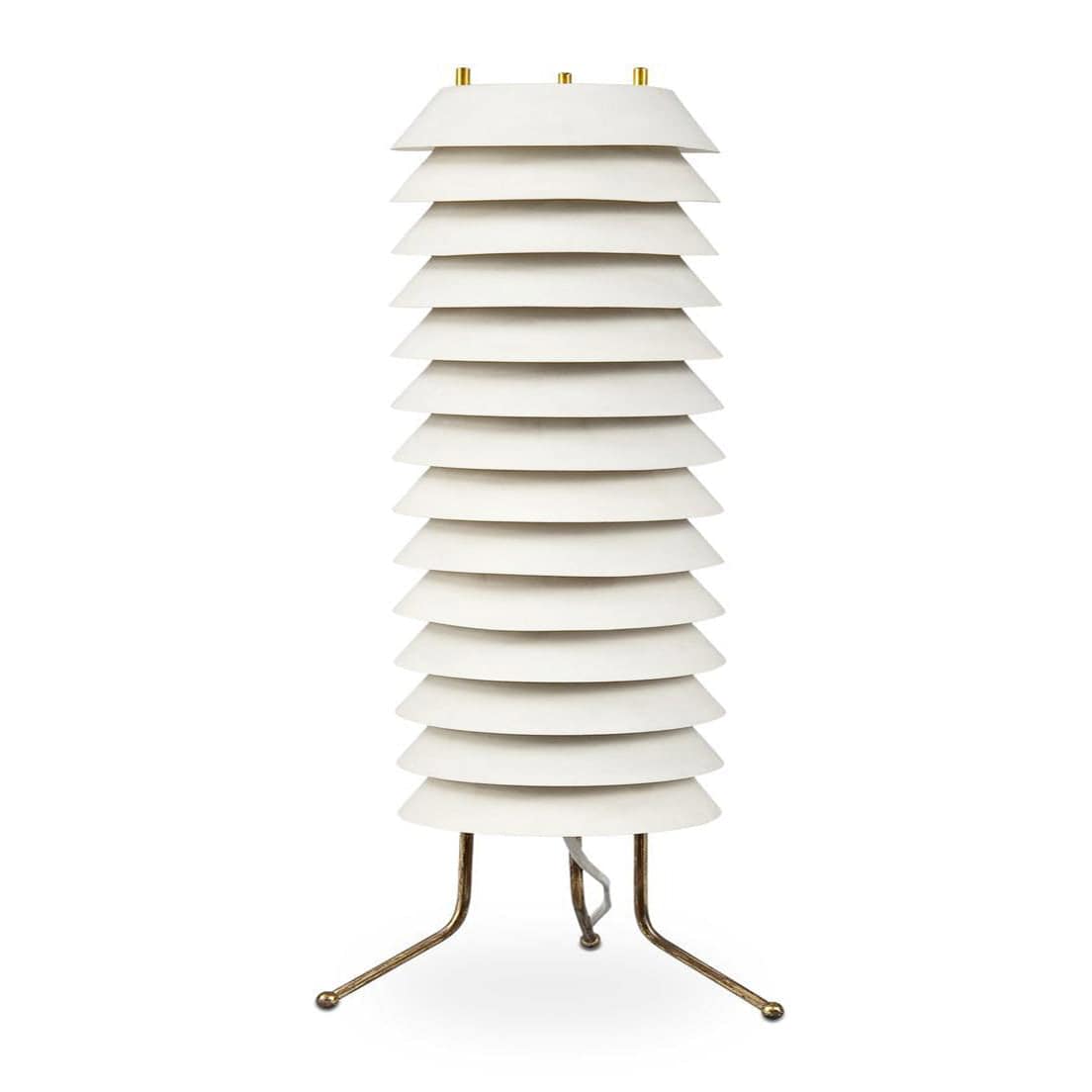 In the language of Finnish functionalism, the Maija series conveyed the feeling of Baltic light from the inside outwards, with a graceful, durable structure reminiscent of the childish honeycomb of naughty honey bee Maya, the heroine of stories and cartoons that originally inspired its name. Maija was a very popular lamp from the start. It was the only one made by this first major Finnish industrial non-architect designer after Alvar Aalto, and who is now recognised as a maestro of generations. An opaque body with a brass structure fragmented into superimposed plates, filters and directs its happy inner light. The whole series of the famous Finnish classic comprises floor, table top and hanging versions.