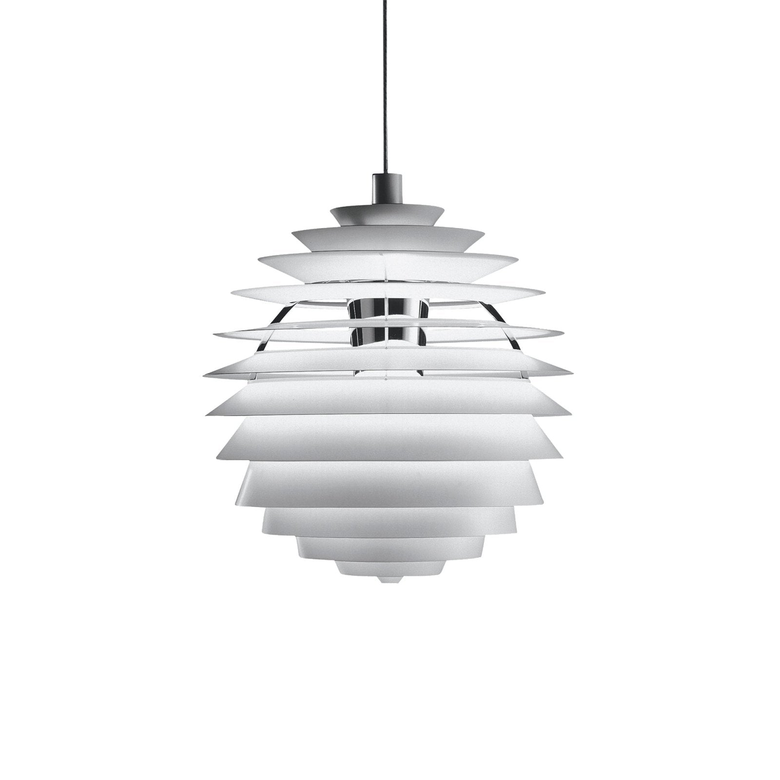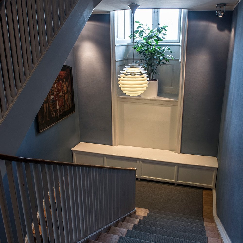 The stunning PH Louvre was designed by Poul Henningsen for the Adventist Church in Skodsborg, Denmark in 1957. The globe-shaped fixture is made up of 13 shades mounted on four supports. It is a simplification of an earlier light Poul Henningsen designed in 1942, called the Spiral.