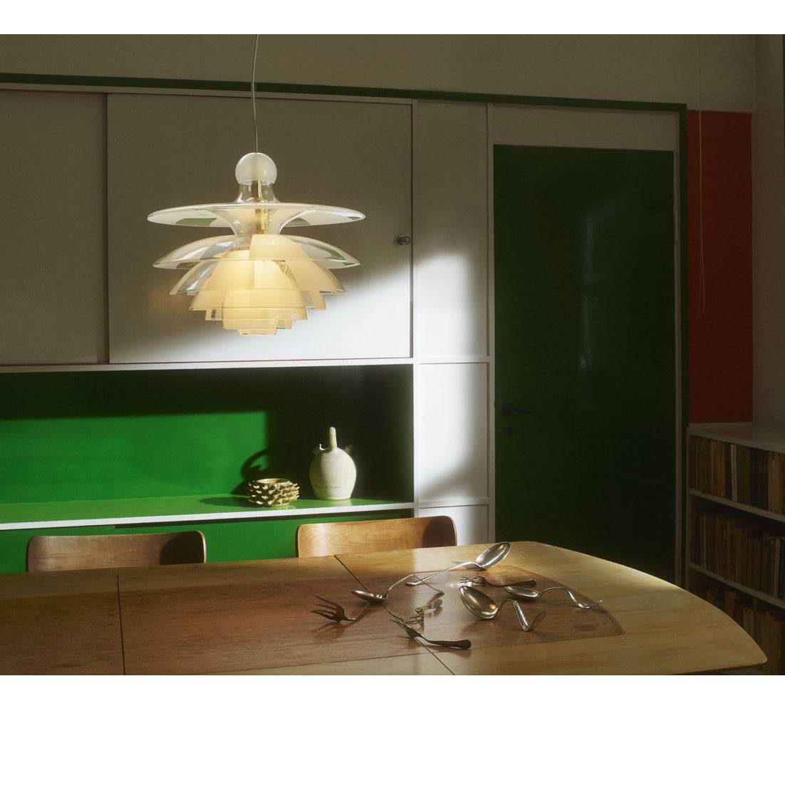 First shown as a prototype in 1928 at the Danish Museum of Decorative Art, now Designmuseum Danmark, the Septima pendant is defined by its sophisticated, seven-shade glass crown.
