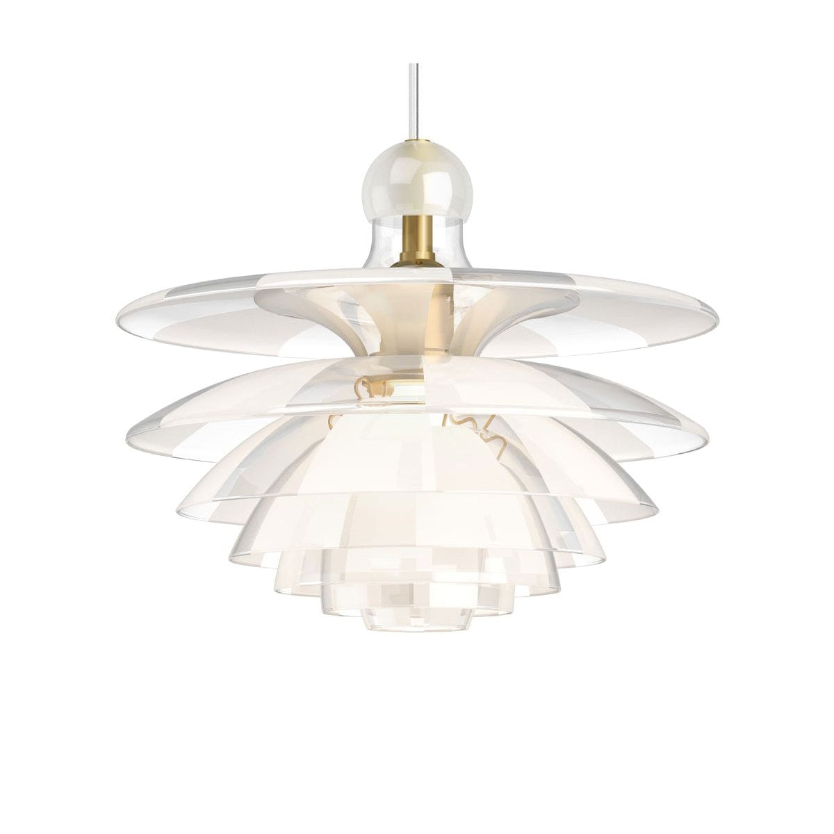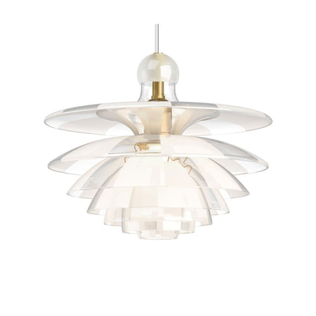 Based on Henningsen's iconic three-shade system, the additional shades create a sculptural piece that embodies both strength and delicacy. The structure has been finished with a mix of clear and frosted glass, allowing the shades to spread the light in a more diffused manner.