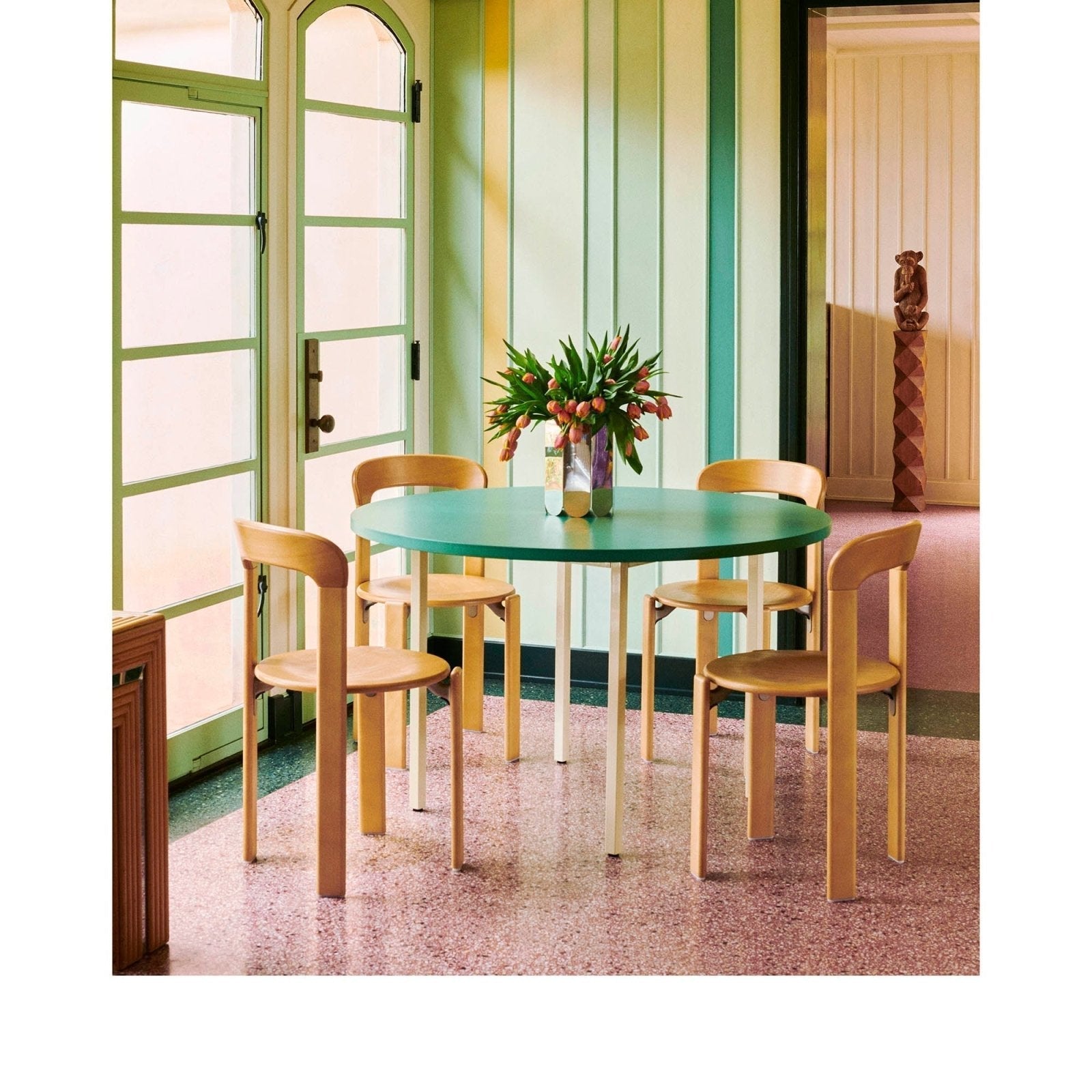 With its distinctively rounded edges and curved backrest, it was the first chair to be patented with Dietiker’s unique screwless wood-to-metal connection and has become one of the most successful Swiss chairs of all time.