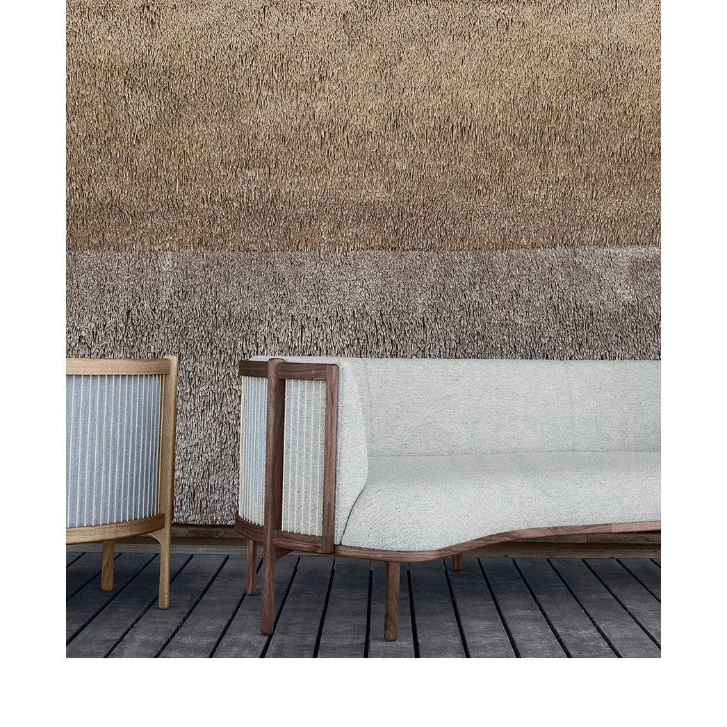 The sofa is crafted from solid wood, steam-bent backrest elements, woven paper cord, and textile upholstery.