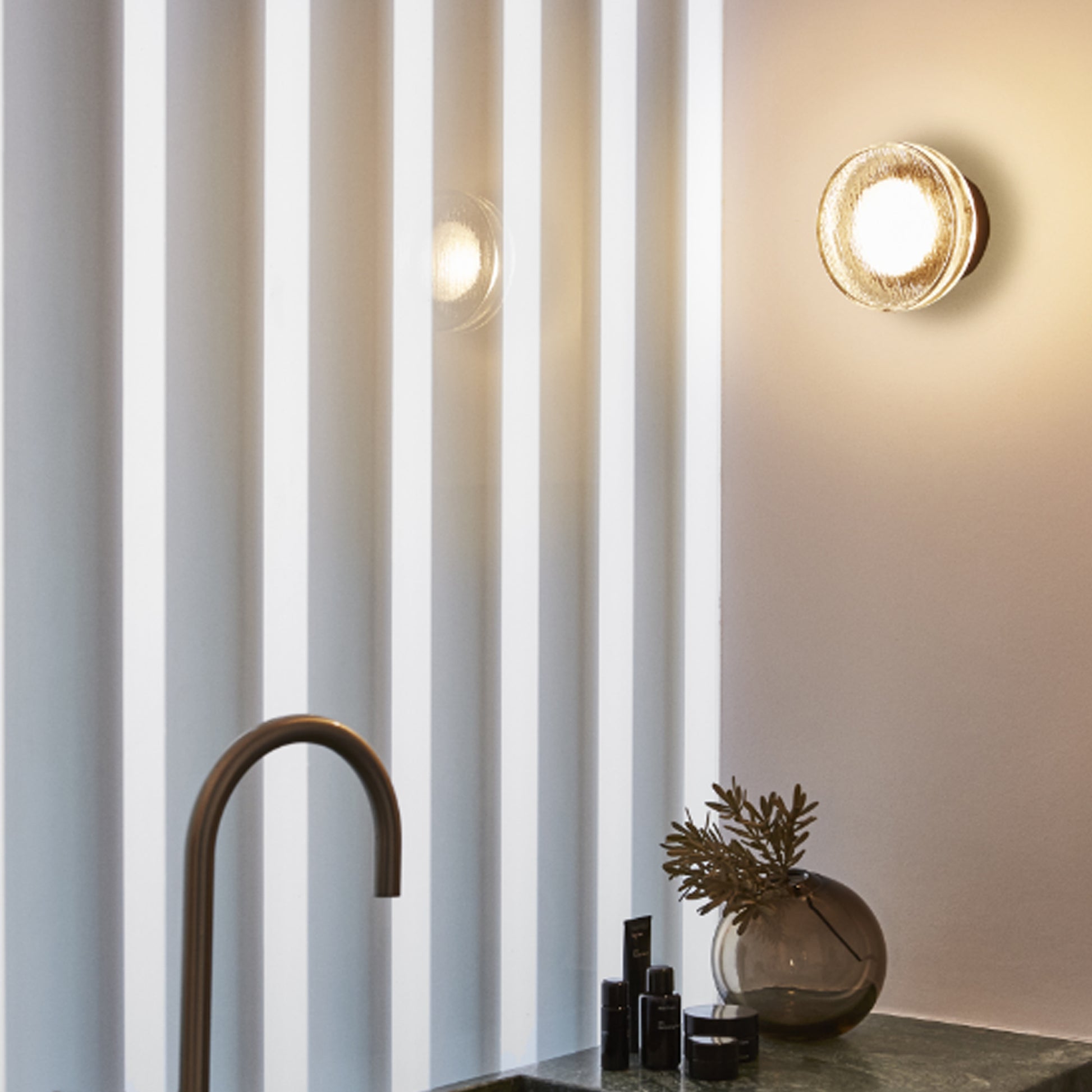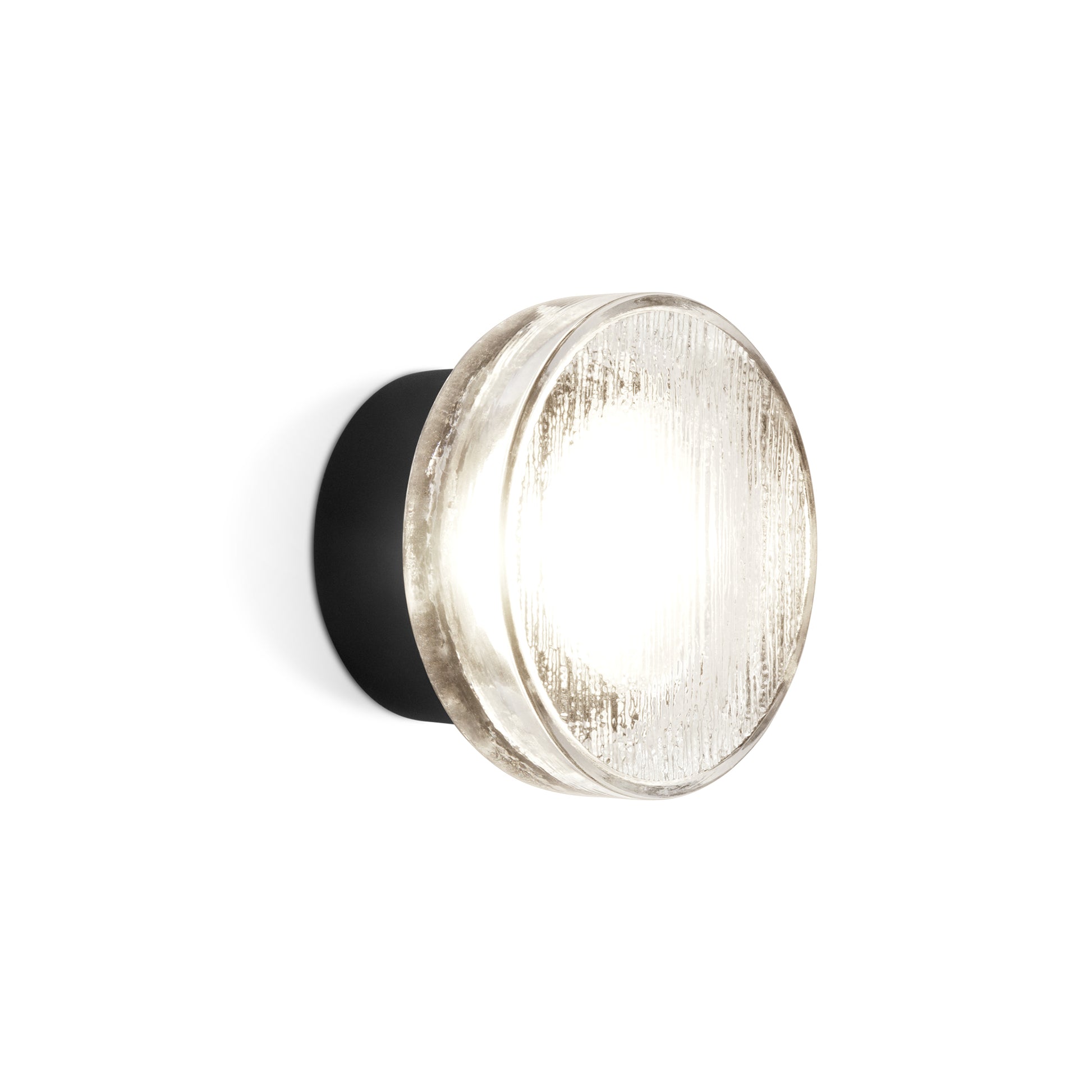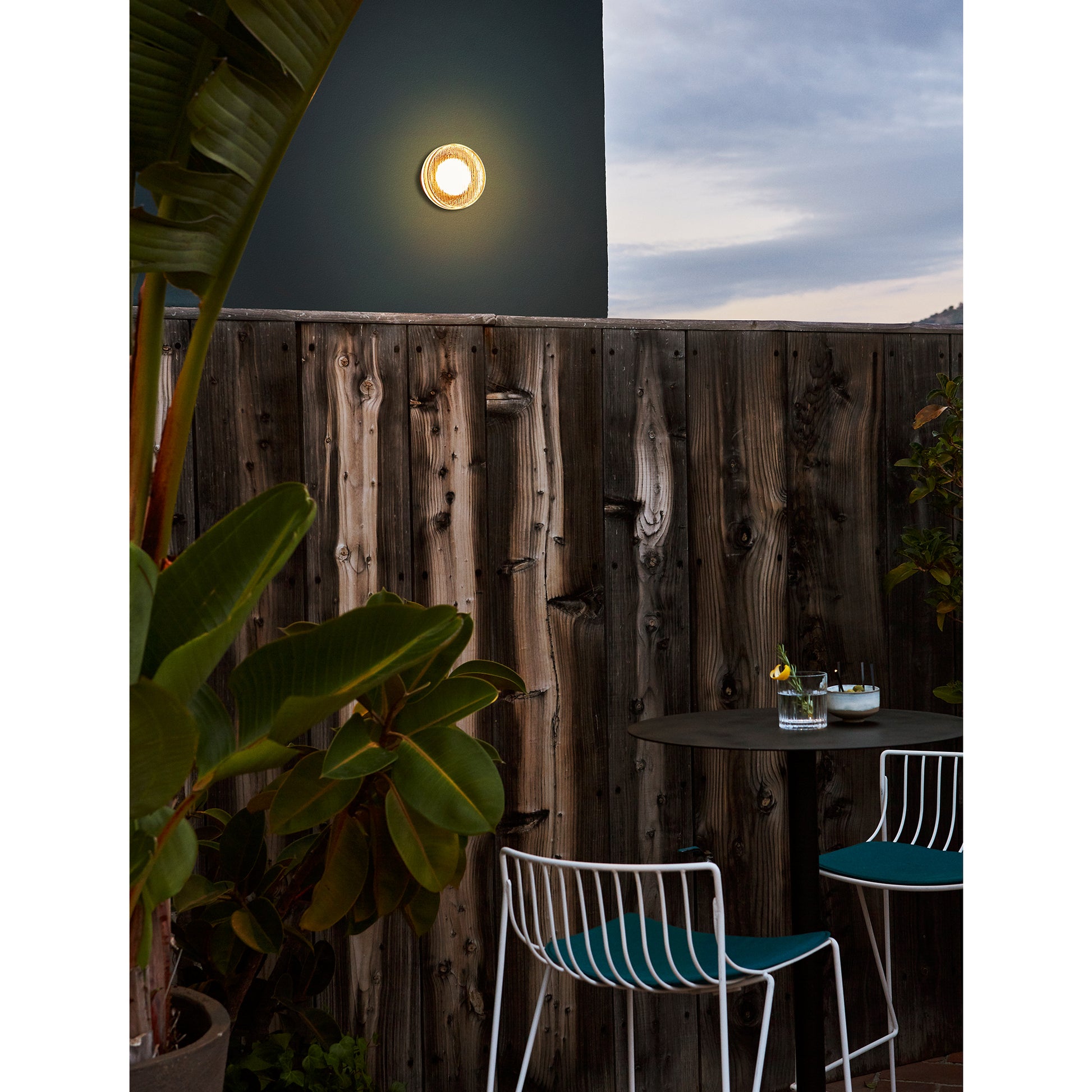 Compact indoor and outdoor wall lamp with a pressed glass diffuser. Its undulating shade covers the light, blurring it. It doesn’t settle for just providing light, it also manages to create an ambiance.