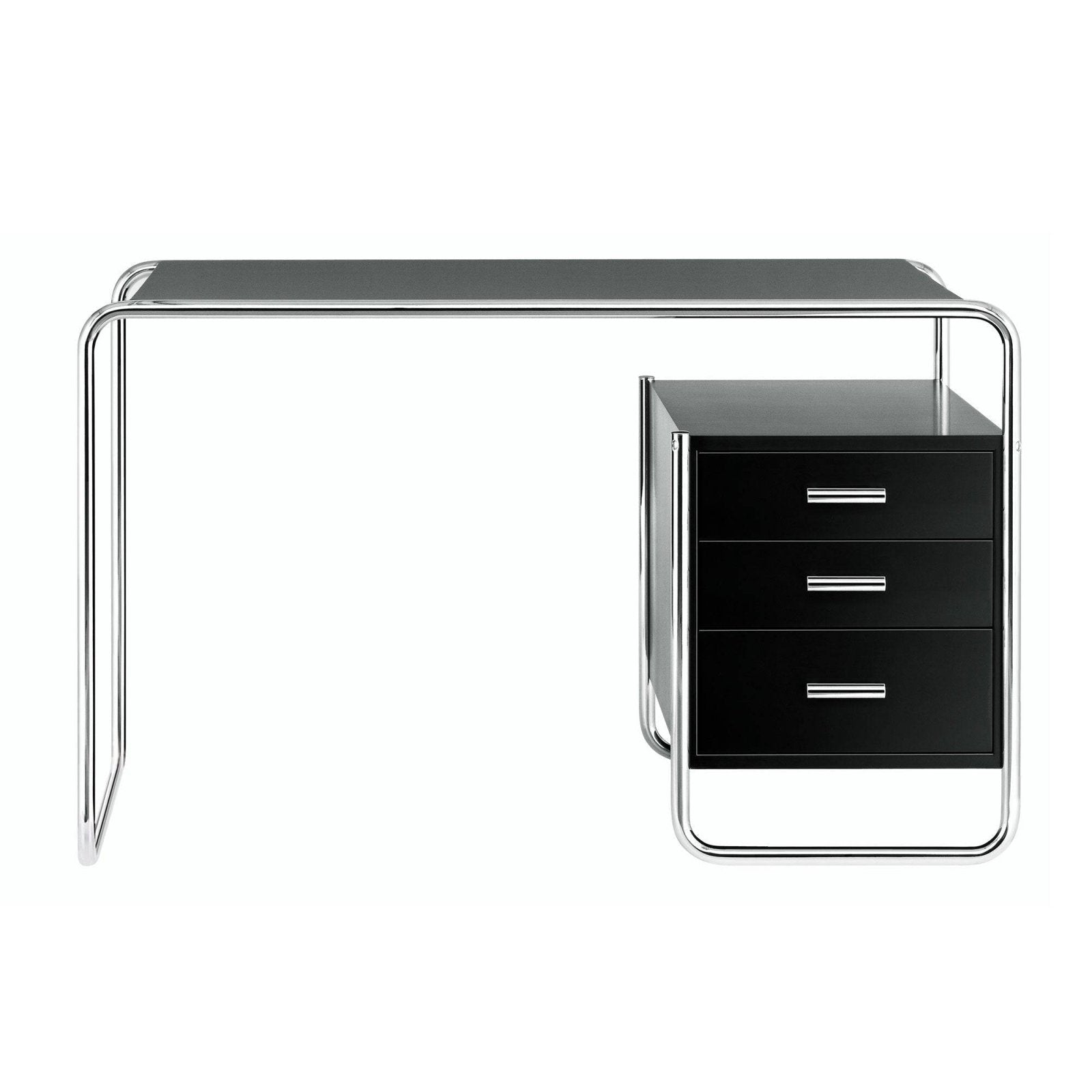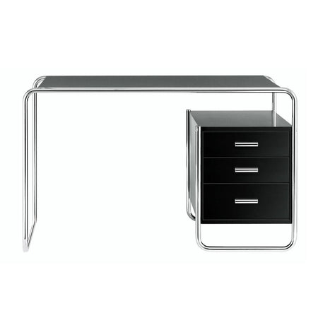 This tubular steel desk is a successful example of the Bauhaus' programmatic claim of combining art and technology into a formal unit. The tabletop and storage elements made of varnished or stained wood harmonically fit in with the tubular steel design. The supporting frame consists of a single line; the wooden elements seem to float in it. The simple piece of furniture, which is formally balanced in its proportions, represents an expressive piece of contemporary history known as "The New Objectivity." We produce various versions of this model.