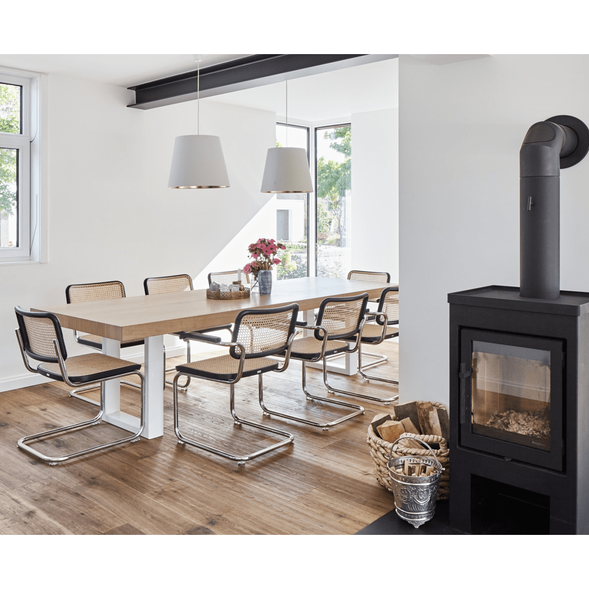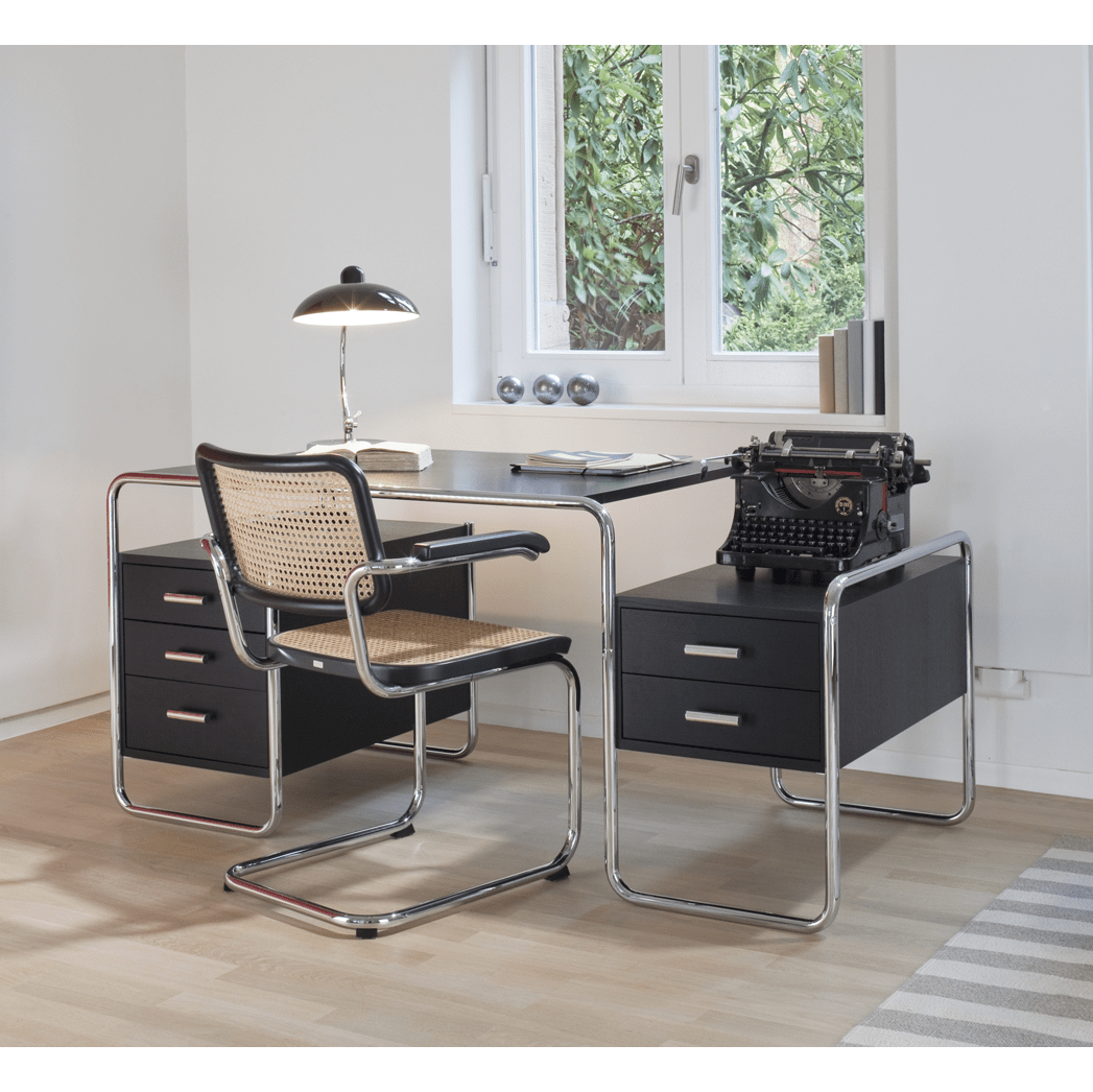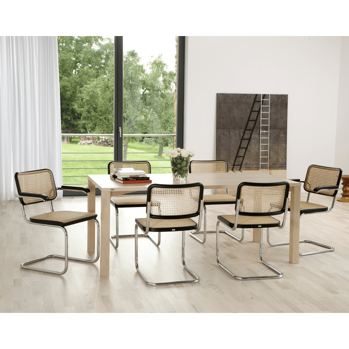 Among the tubular steel furniture models, the cantilever chair S 64 is especially versatile. It is at home in various design worlds and fits in with uncompromisingly modern interior design as well as in a diversified mix that gives space to different epochs and styles. The cantilever chair S 32 and the version S 64 with armrests are the most famous tubular steel classics. The appealing combination of new and old contribute to their popularity: Thonet’s tradition in the production of bentwood furniture with characteristic Vienna wickerwork, in contrast with the revolutionary use of tubular steel. Seat and backrest made of bent solid wood with wickerwork represent tradition, and the frame represents the present and future. With their versatility, they became best selling cantilever chairs and still are today. Marcel Breuer designed the S 32 and S 64 during his time in Berlin in 1928. Thonet has been producing both models since 1930. Due to their aesthetic reduction and clarity combined with the airy wickerwork, the classics fit into the most diverse environments, from conference rooms and waiting areas to restaurants and private homes.