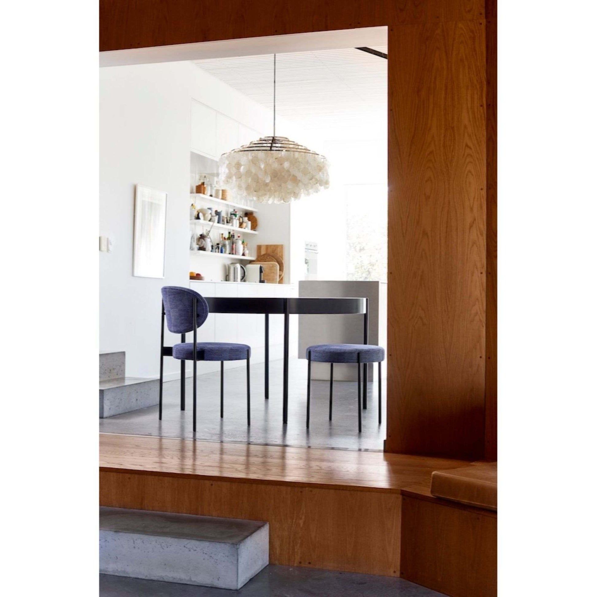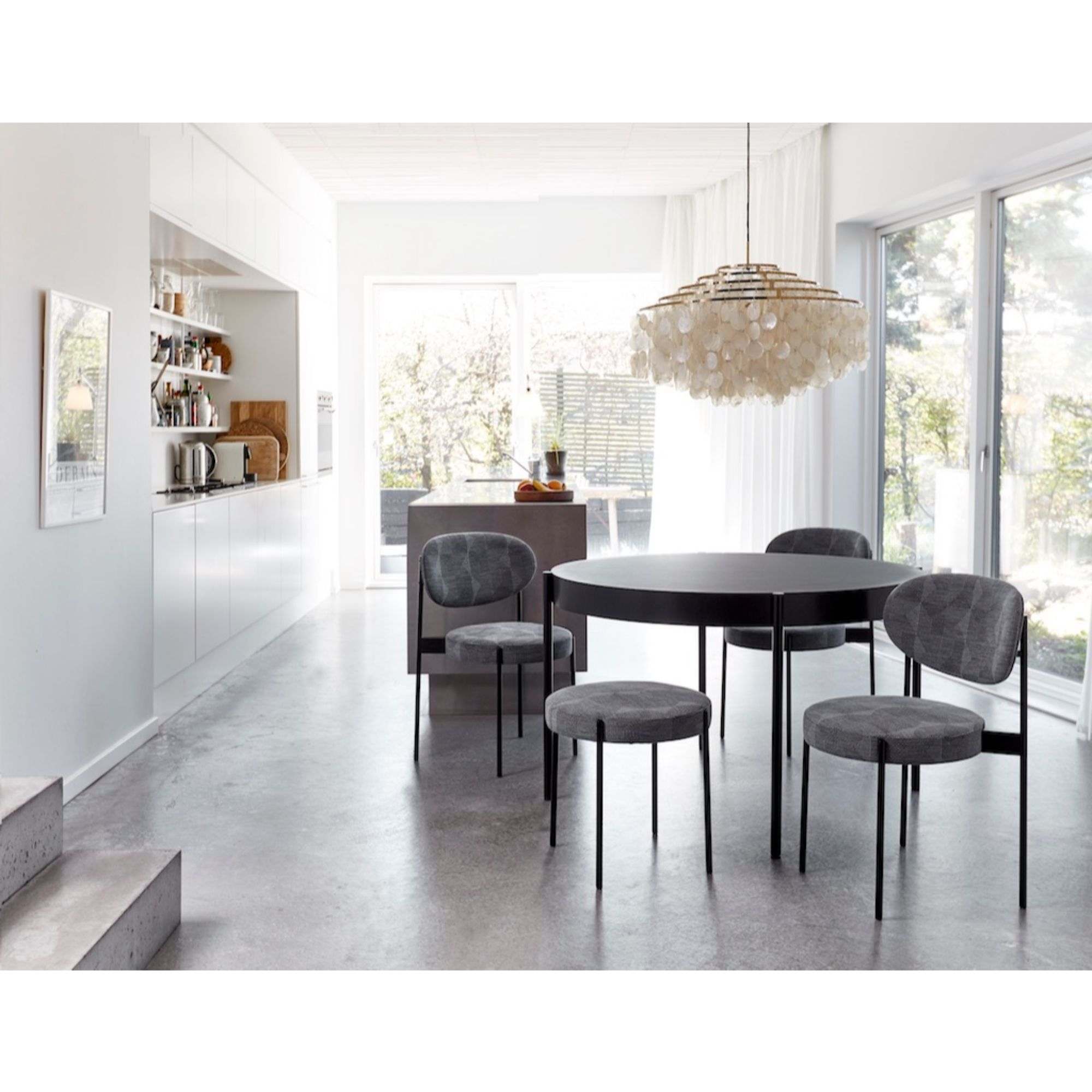 Round dining table with obvious frame. Legs placed outside the frame of the table