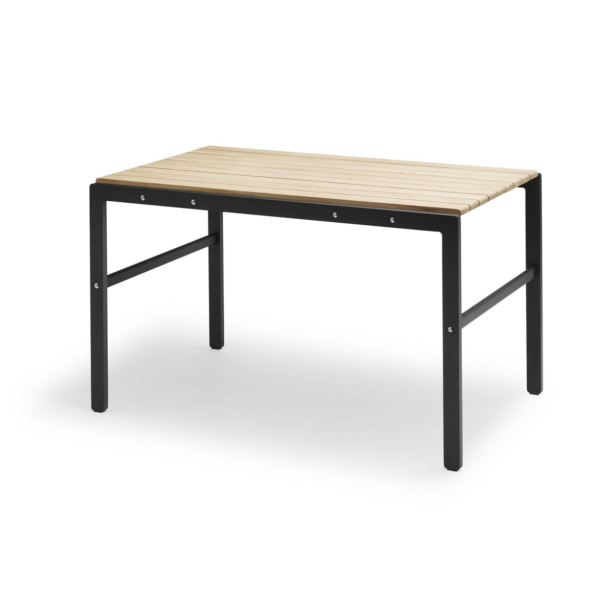 The table features an untreated teak tabletop supported by a powder-coated aluminium frame with visible fittings.