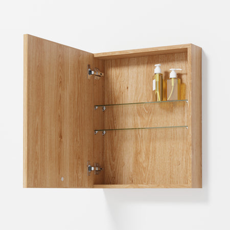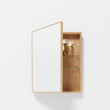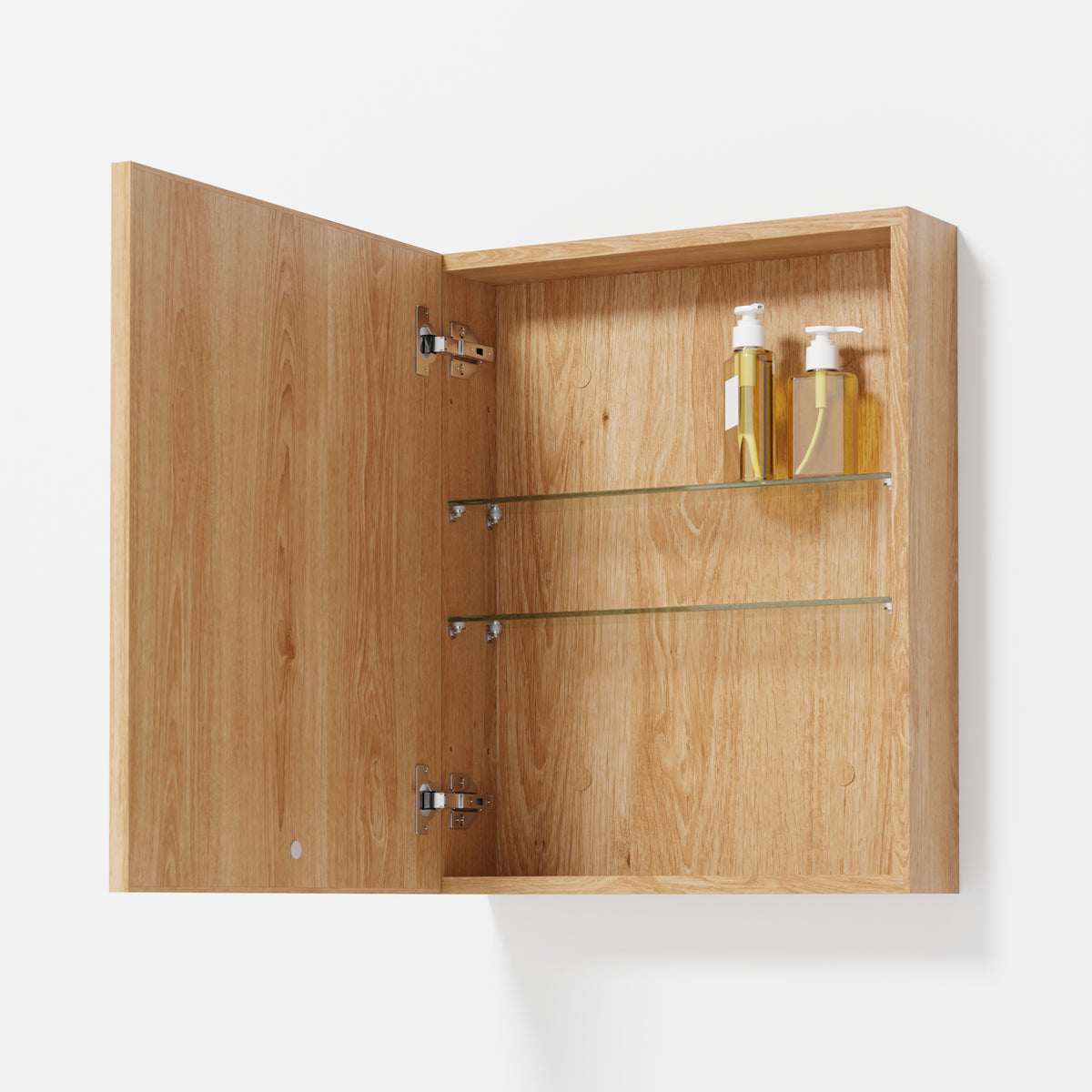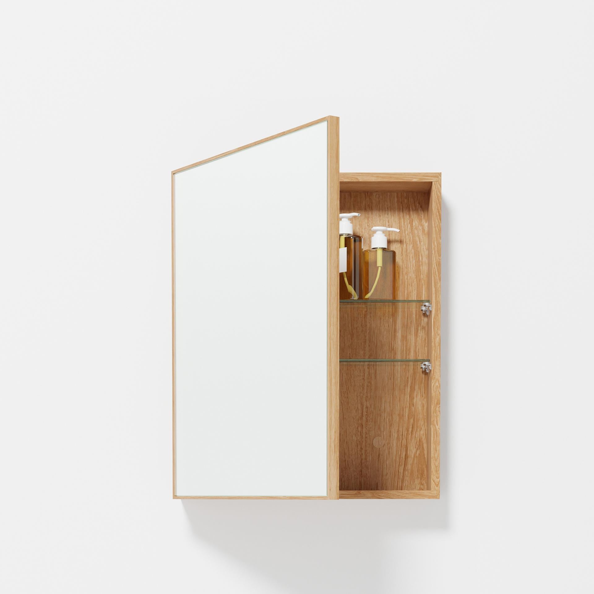 Slimline Cabinet 550 is a highly contemporary product. It has a calm minimalist style, emphasised by the super-slim oak-profile mirror edge.