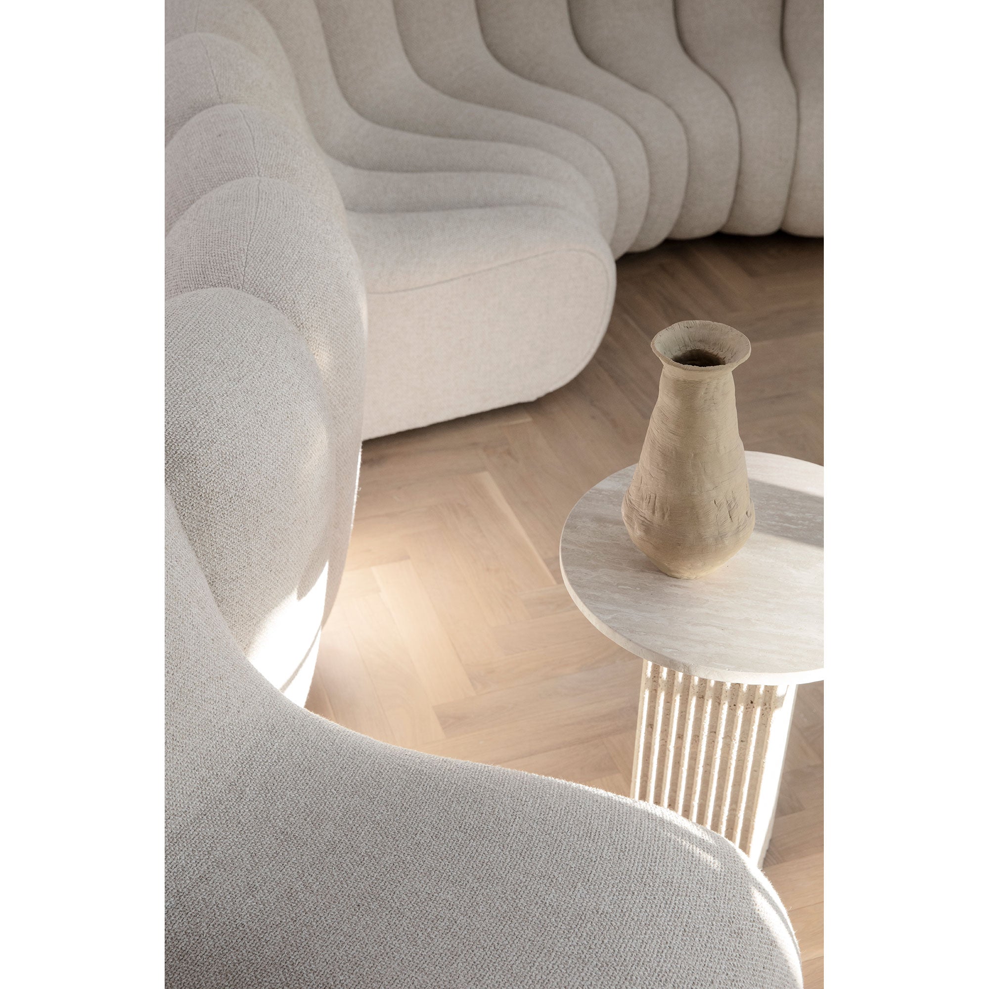 Rich in architectural references, the Soho collection reminisces architectural building facades to create a vertical and slim table design. The fluted surface of natural stone adds tactility, while shadows play upon the sense of depth and character of the stone’s surface throughout the day. Made from travertine plates, the table is still lightweight and easy to move around.