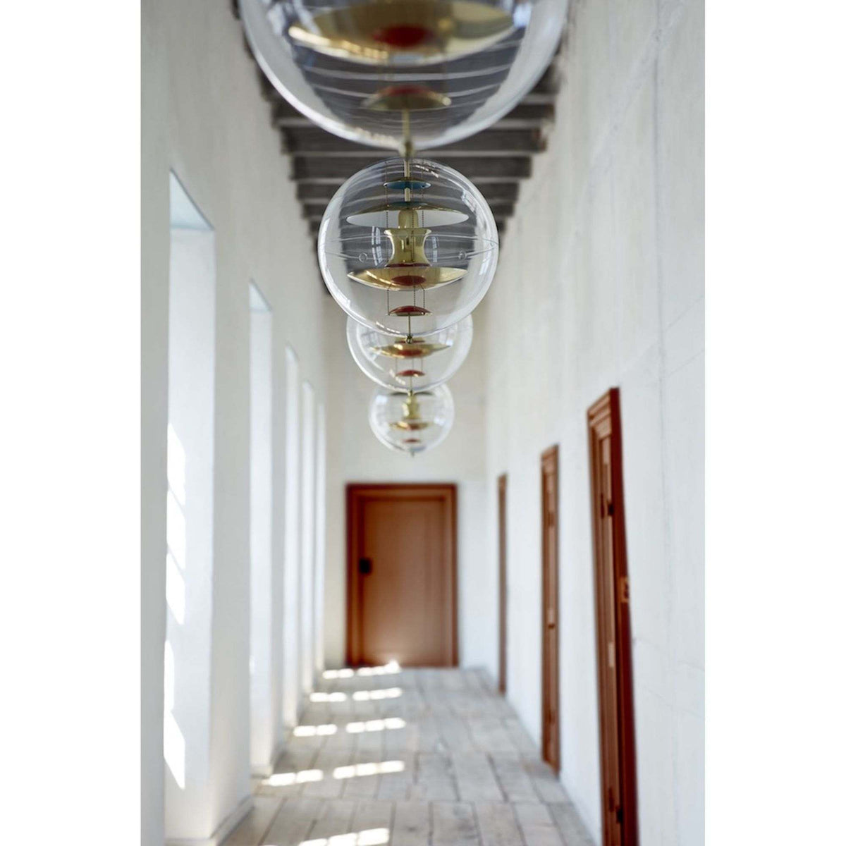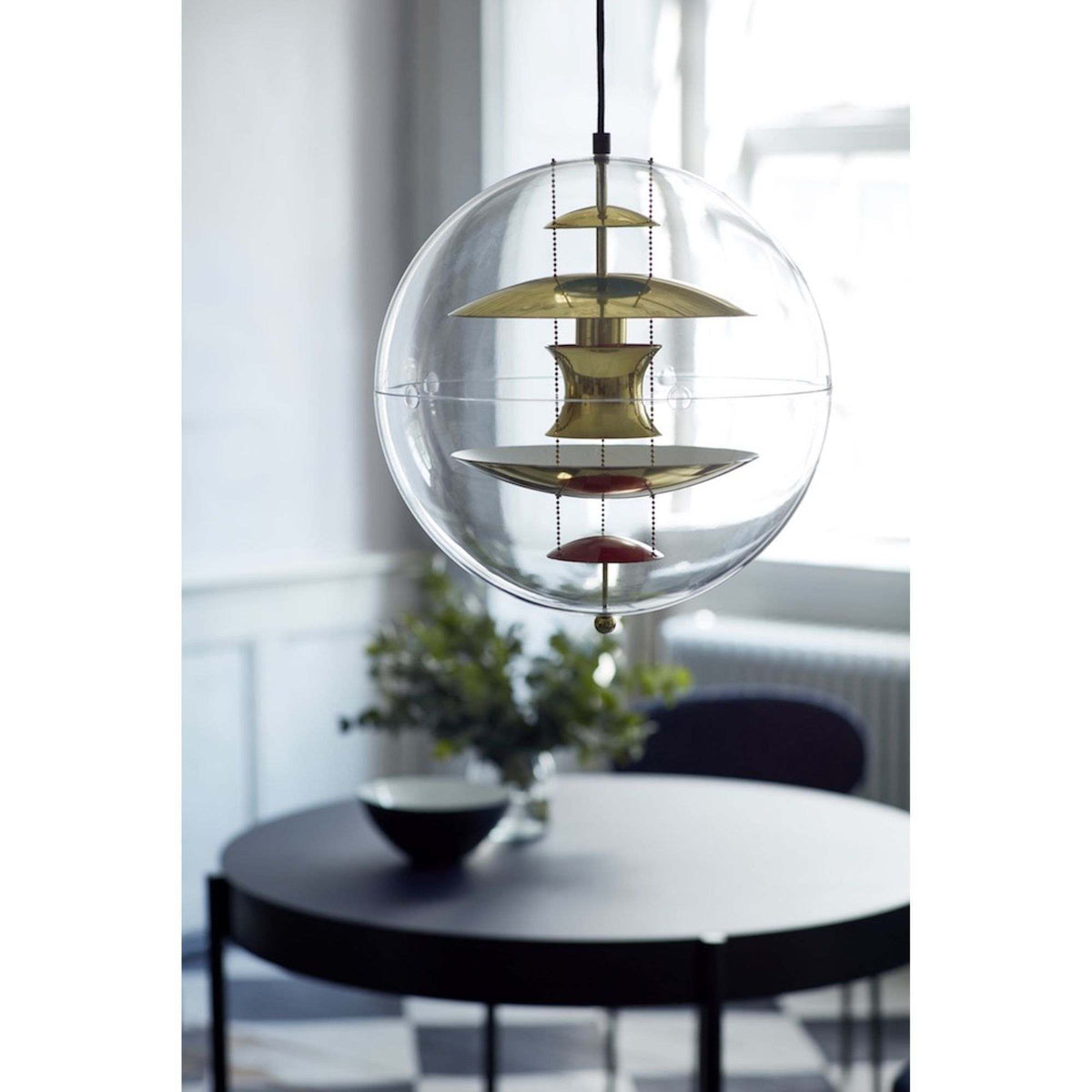 Verpan's VP Globe pendant in brass features a crystal clear transparent acrylic outer sphere with five internal reflectors suspended by three steel chains. Splashes of red and blue add the finishing touches to the futuristic sculptural design and highlights the unmistakable Panton design DNA.