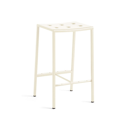 Designed for HAY by Ronan and Erwan Bouroullec, the Balcony Bar Stool is an elegant and functional stool for outdoor use. The rectangular design is softened by the slightly bowl-formed seat and slender legs, with the multiple holes in the seat strengthening the construction, as well as creating a distinct expression.