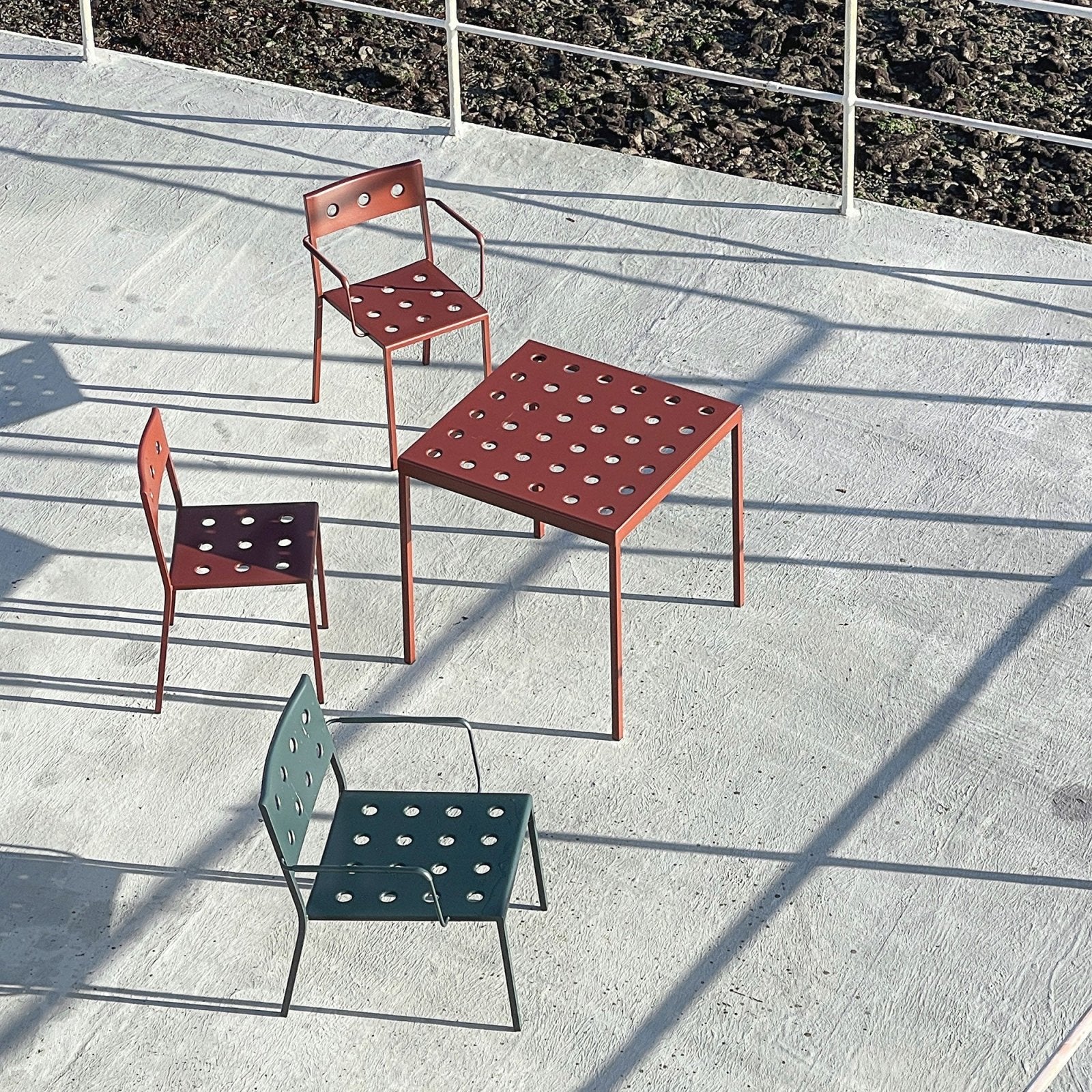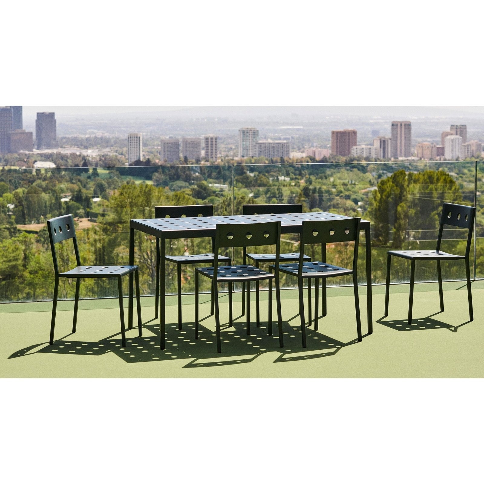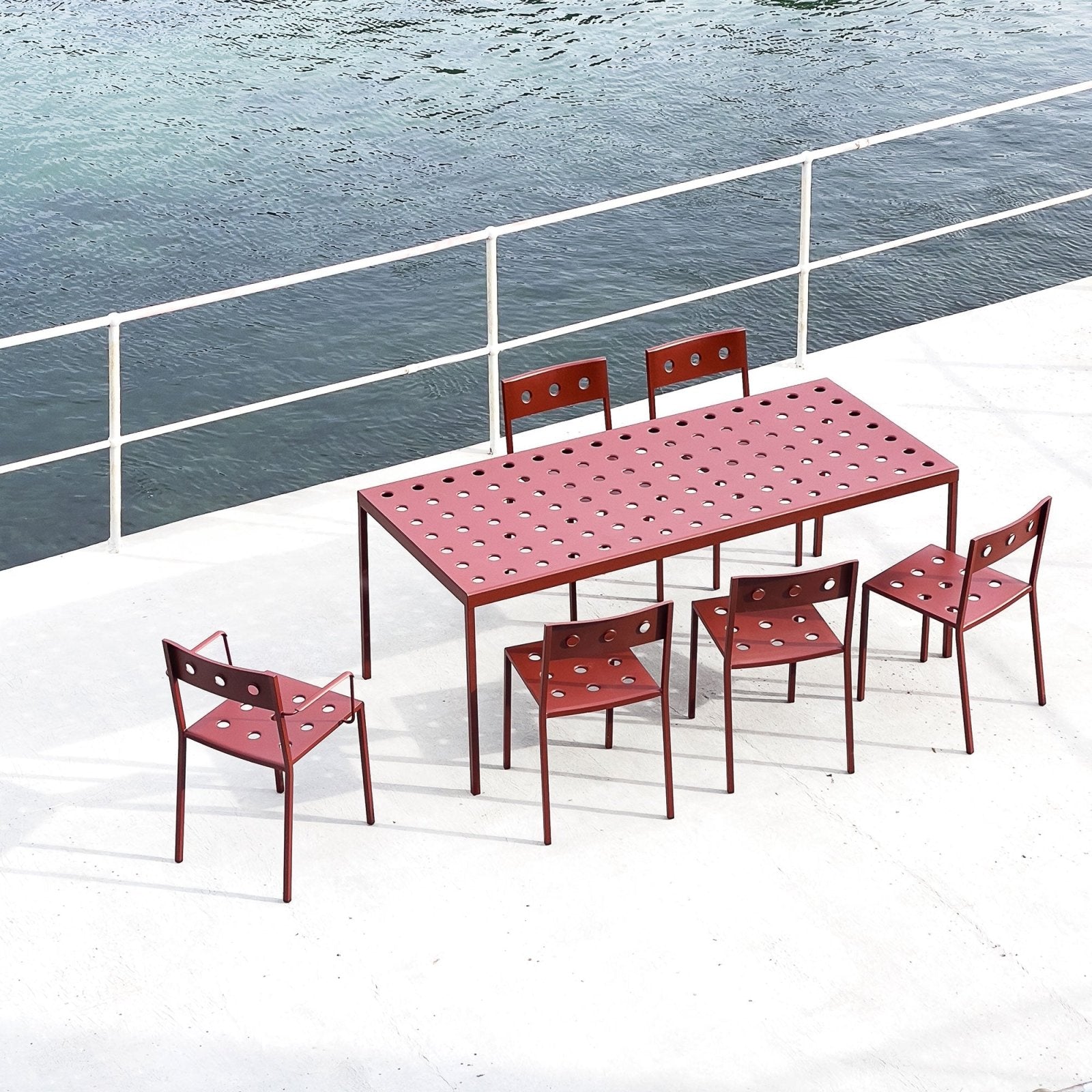 Designed for HAY by Ronan and Erwan Bouroullec, the Balcony Table is an elegant dining table for outdoor use. The simple rectangular design is softened by slender legs, with the multiple holes on the table's surface strengthening the construction, as well as creating a distinct expression.