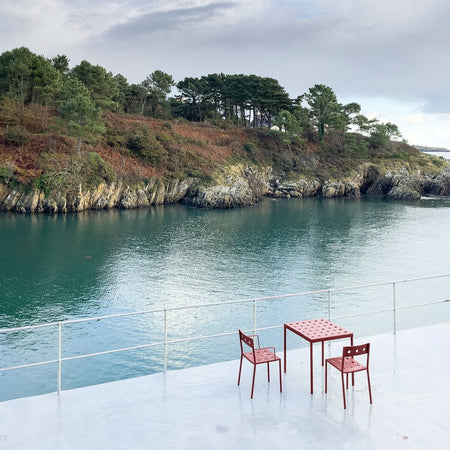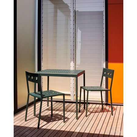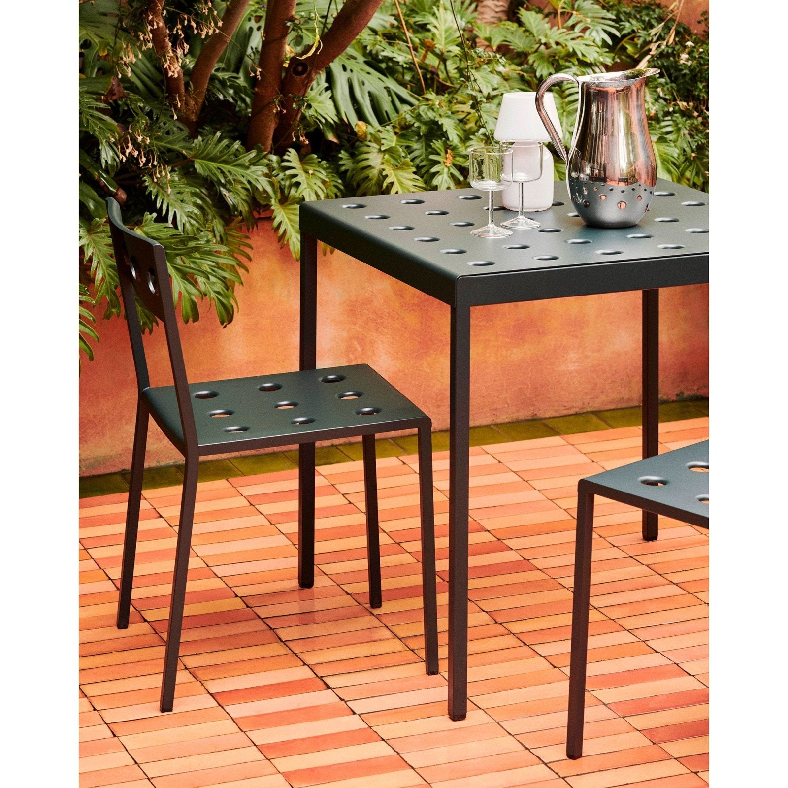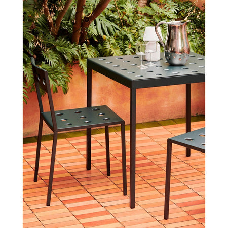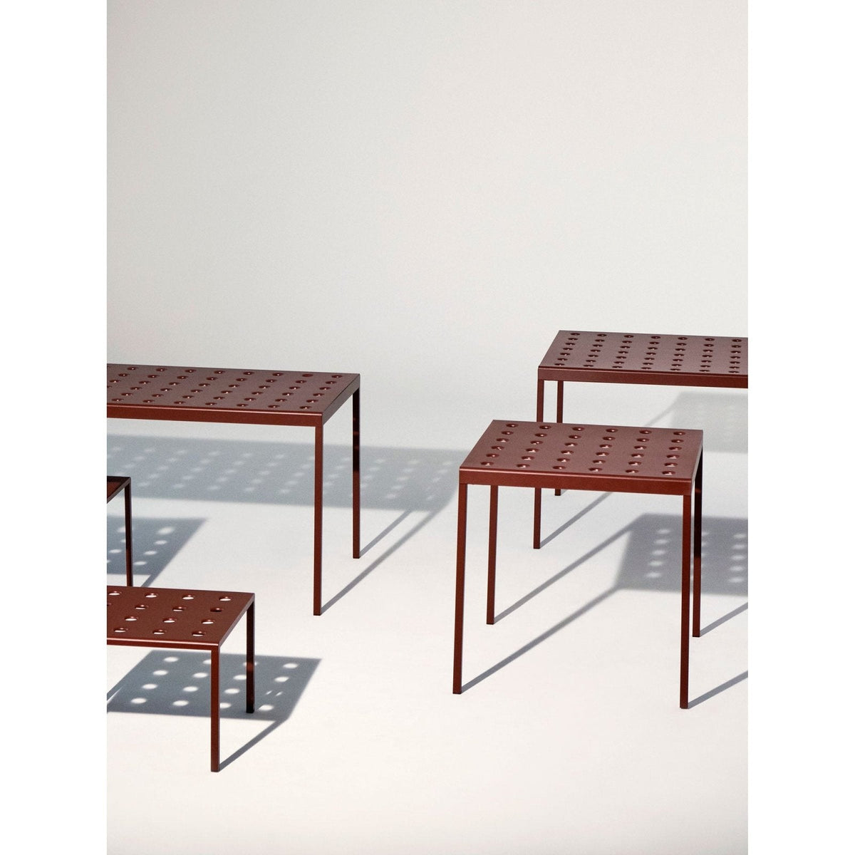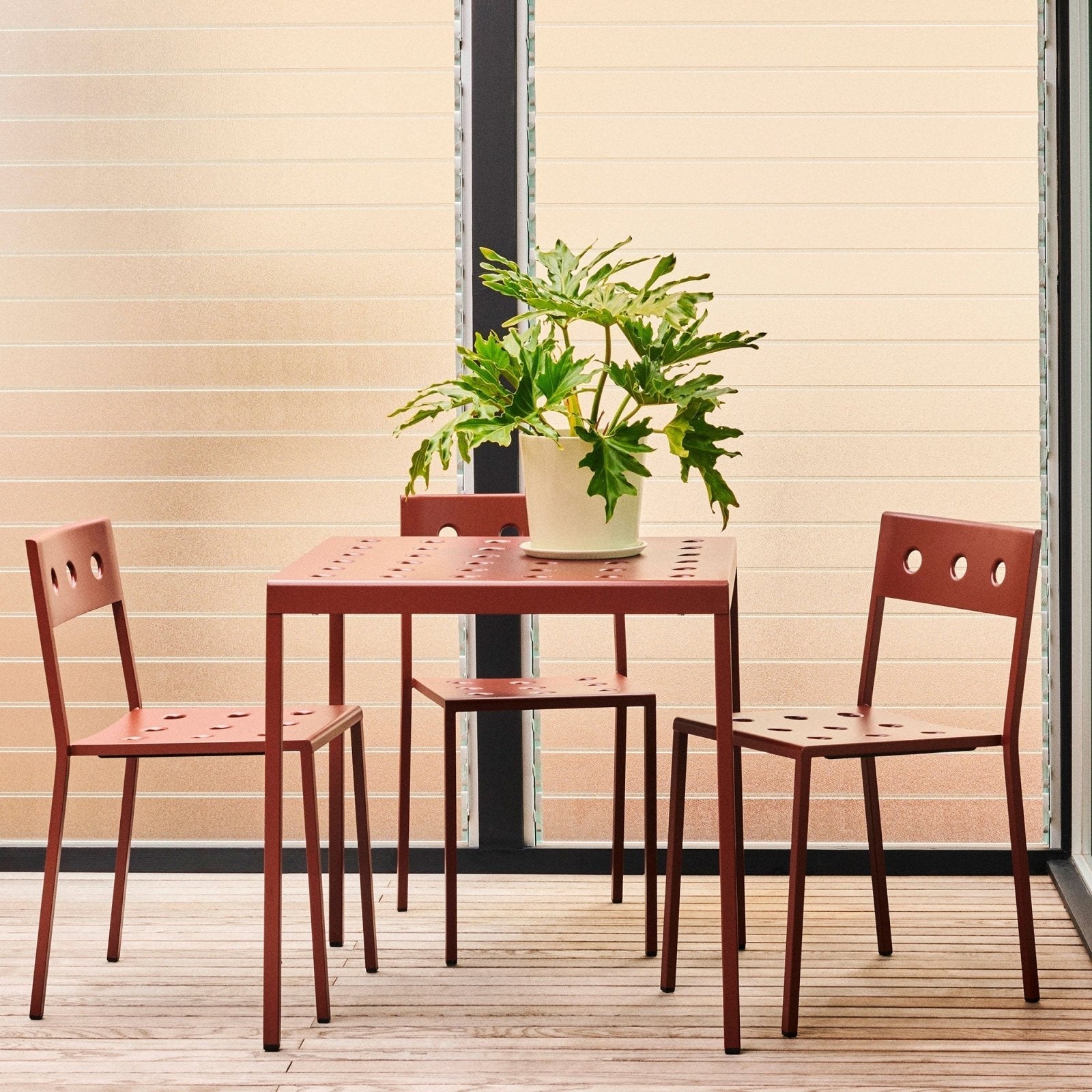 Designed for HAY by Ronan and Erwan Bouroullec, the Balcony Table is an elegant dining table for outdoor use. The simple rectangular design is softened by slender legs, with the multiple holes on the table's surface strengthening the construction, as well as creating a distinct expression.