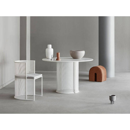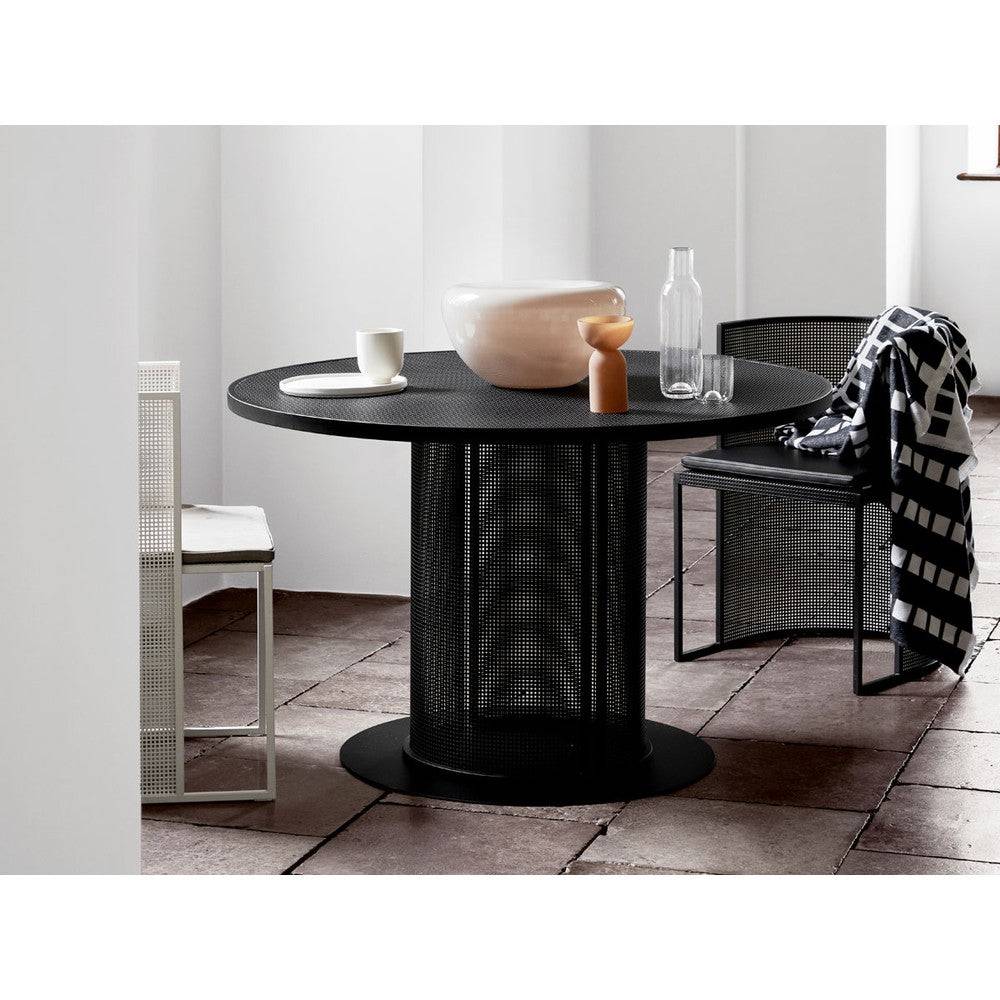 The Bauhaus Dining Table shares the same characteristic design as the rest of the rest of the Bauhaus furniture series, thus making it easy to match. The round tabletop made of perforated steel softens the engineered expression and gives the table a transparent and light appearance.