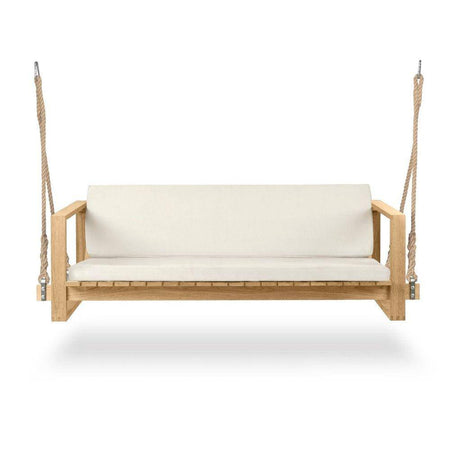 The swing sofa is crafted from solid teak and suspended from knotted ropes.