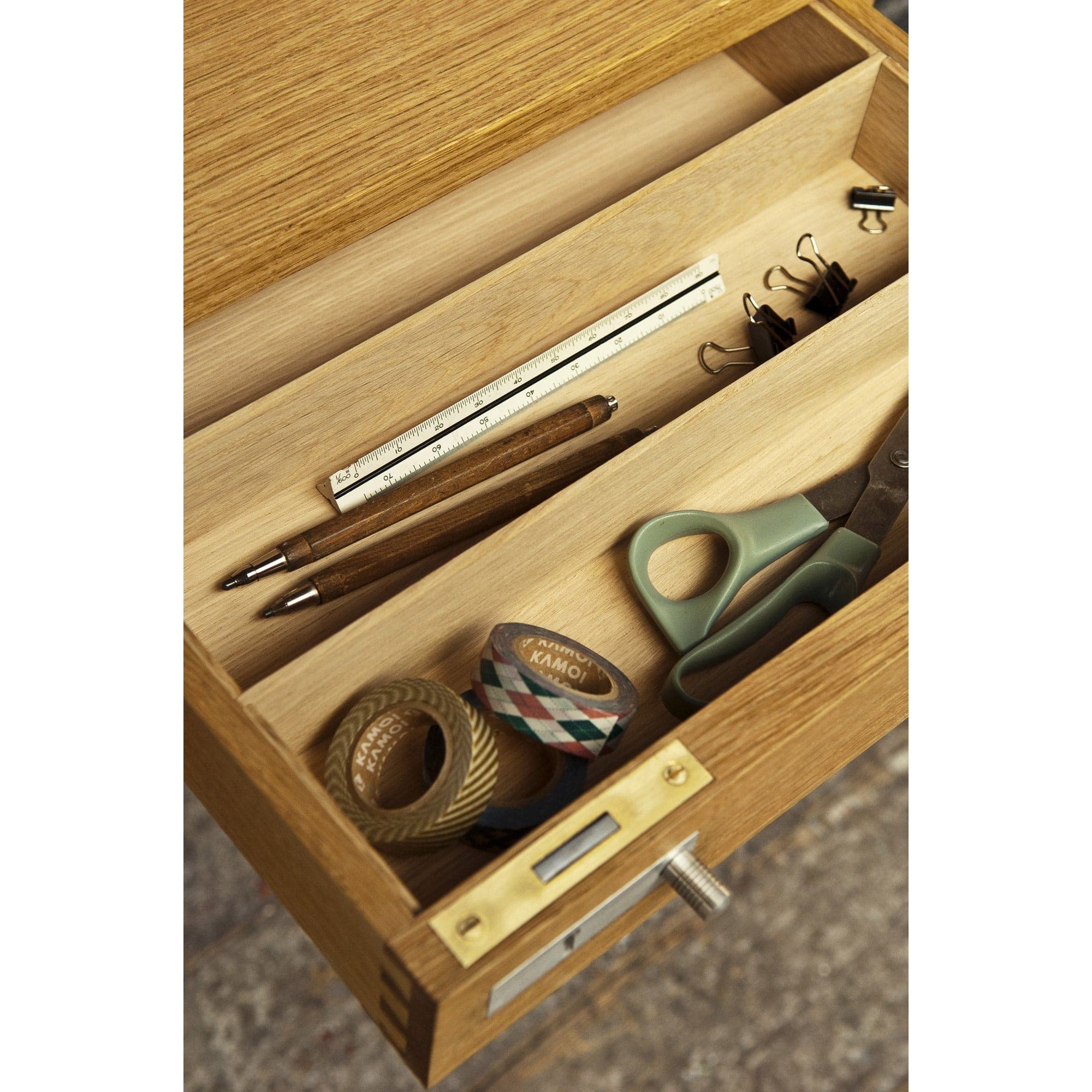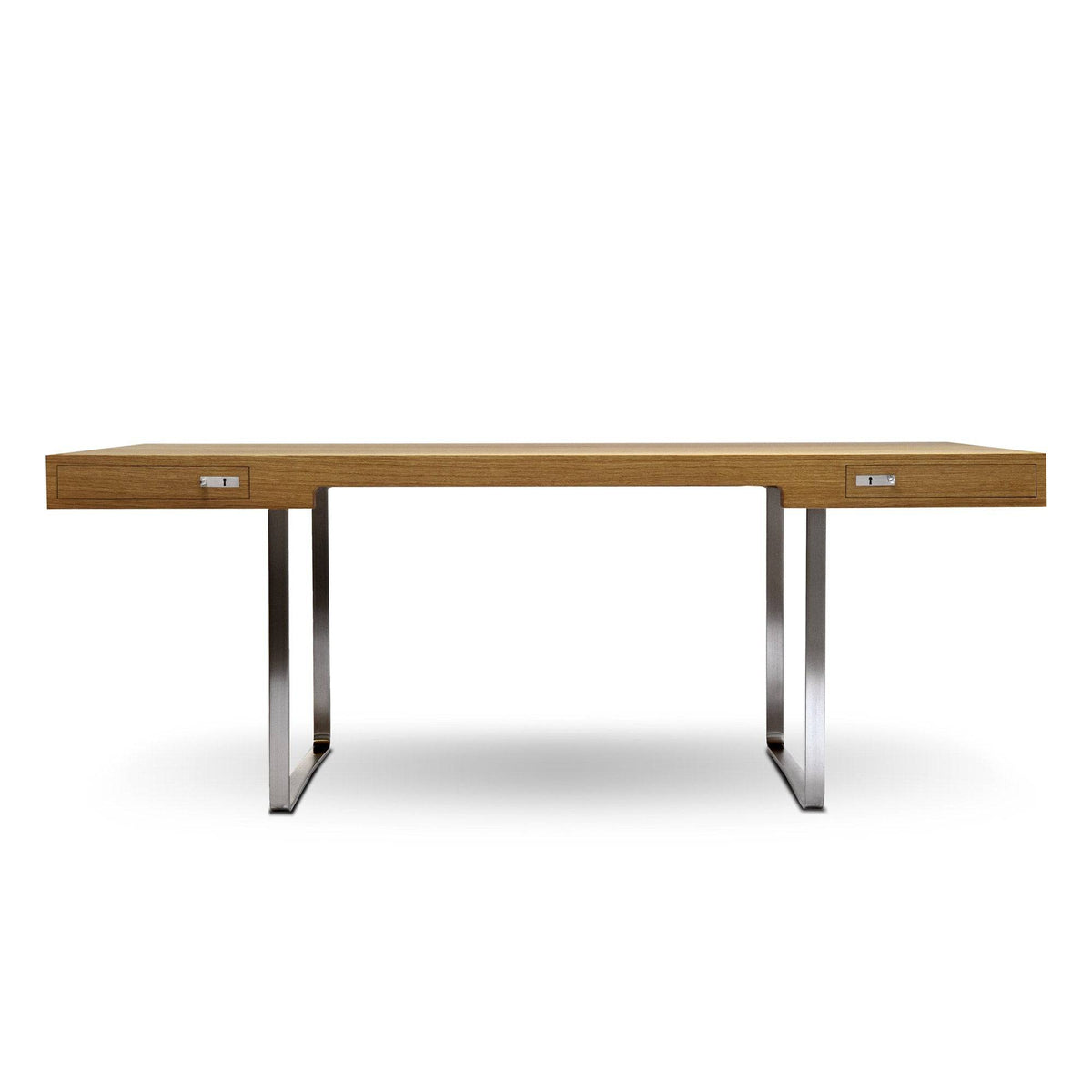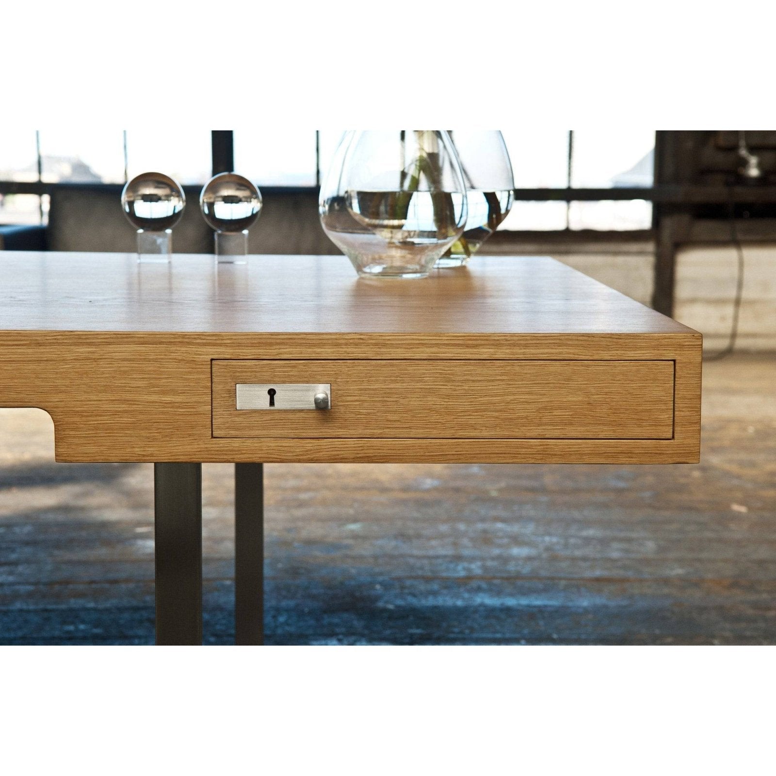 The desk is crafted from solid oak or walnut paired with a steel frame, available in oil or lacquer finishes.
