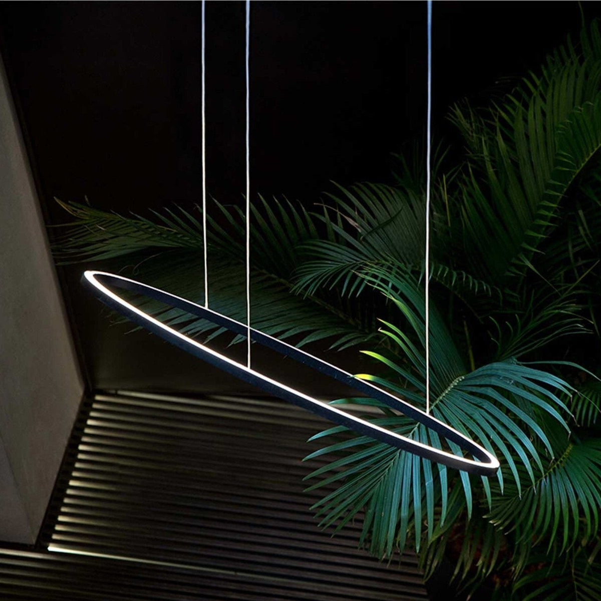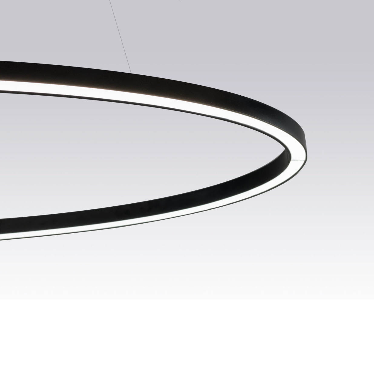 The lamps are made using a proprietary extrusion coupling technology. Yet is still a high impact, statement piece. The singular ring of extruded aluminium can be hung at an angle or horizontal to create an interesting focal point to any room.